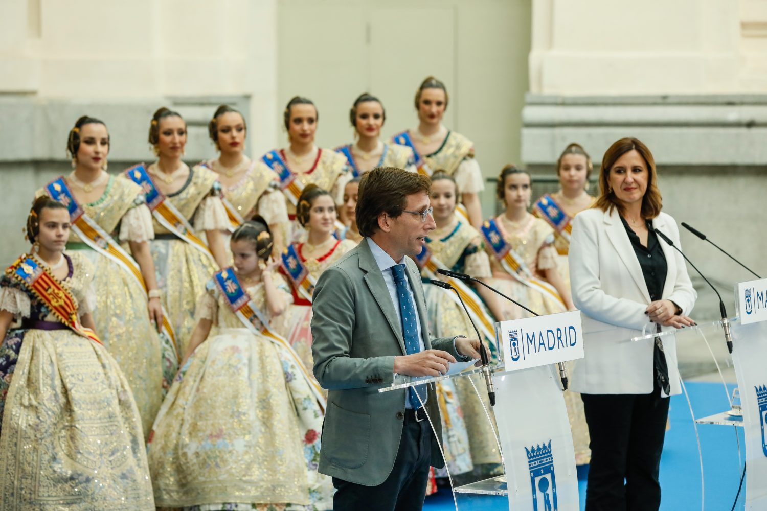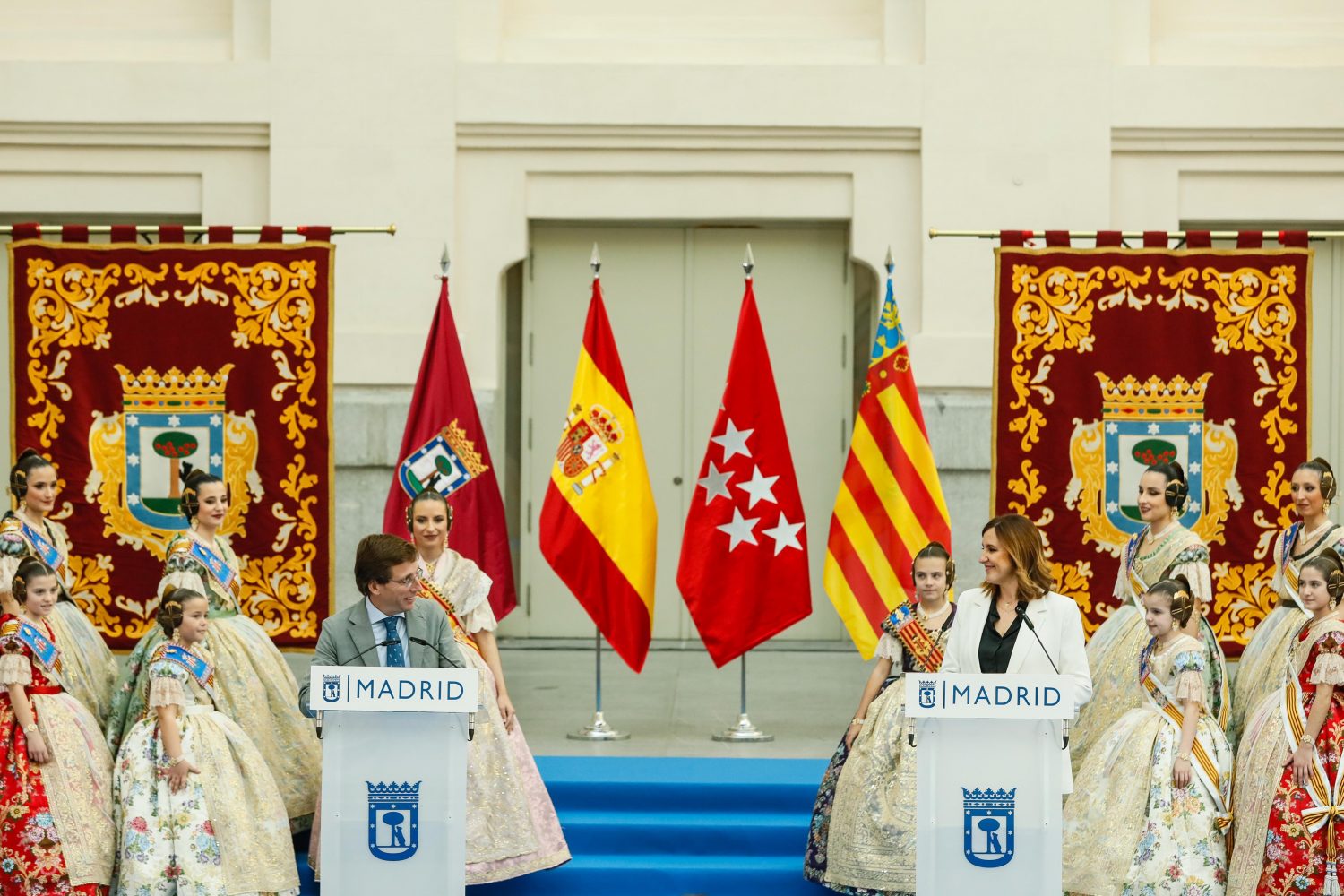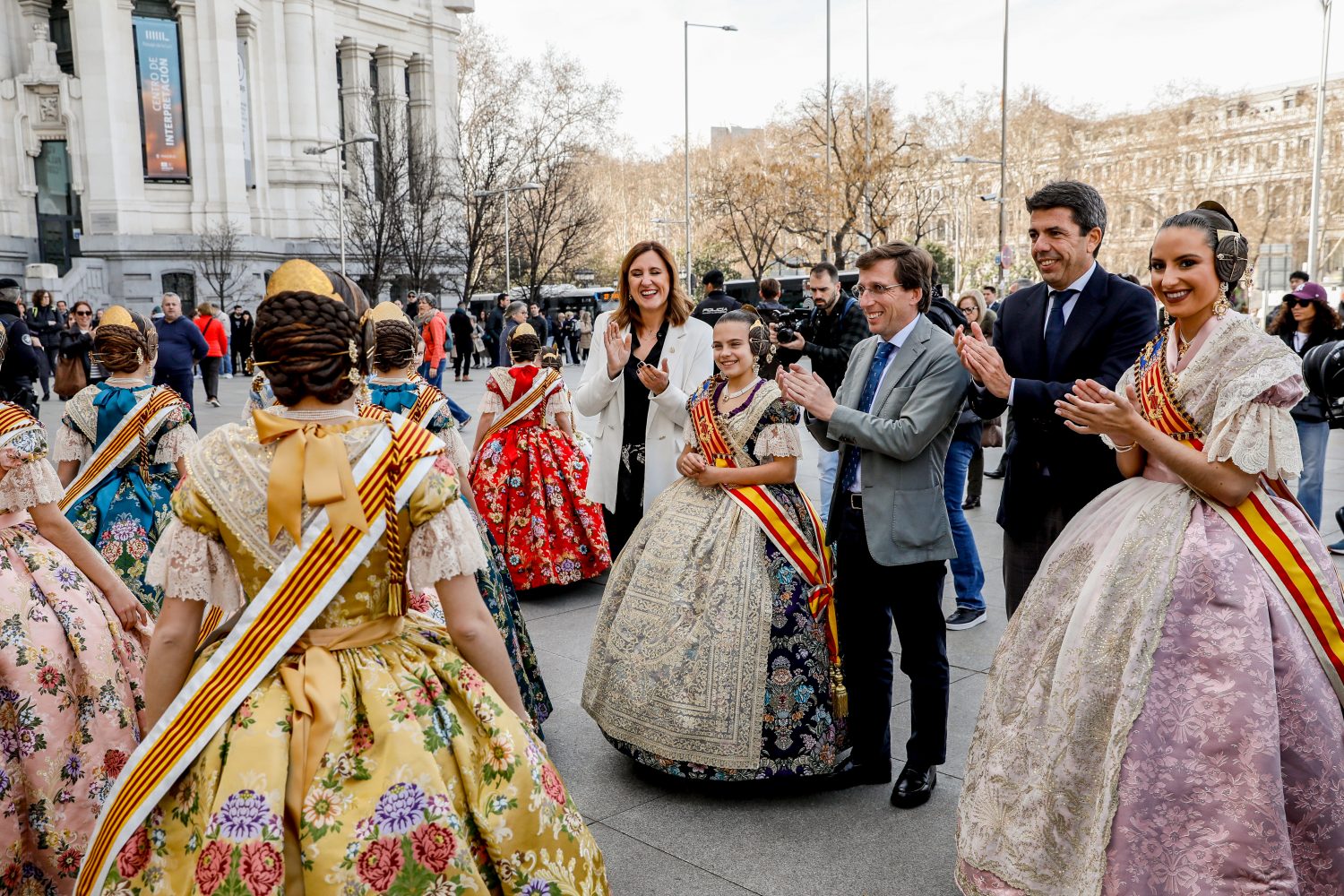 El alcalde de Madrid, José Luis Martínez-Almeida, ha recibido esta mañana en el Palacio de Cibeles al presidente de la Generalitat Valenciana, Carlos Mazón, junto a la alcaldesa de Valencia, María José Catalá, y las falleras mayores de Valencia, María Estela Arlandis y Marina García, acompañadas de sus respectivas cortes de honor, en un acto con motivo de la Mascletá que ha organizado el Ayuntamiento de Madrid como preámbulo de las Fallas de 2024, que comenzarán el próximo 25 de febrero.