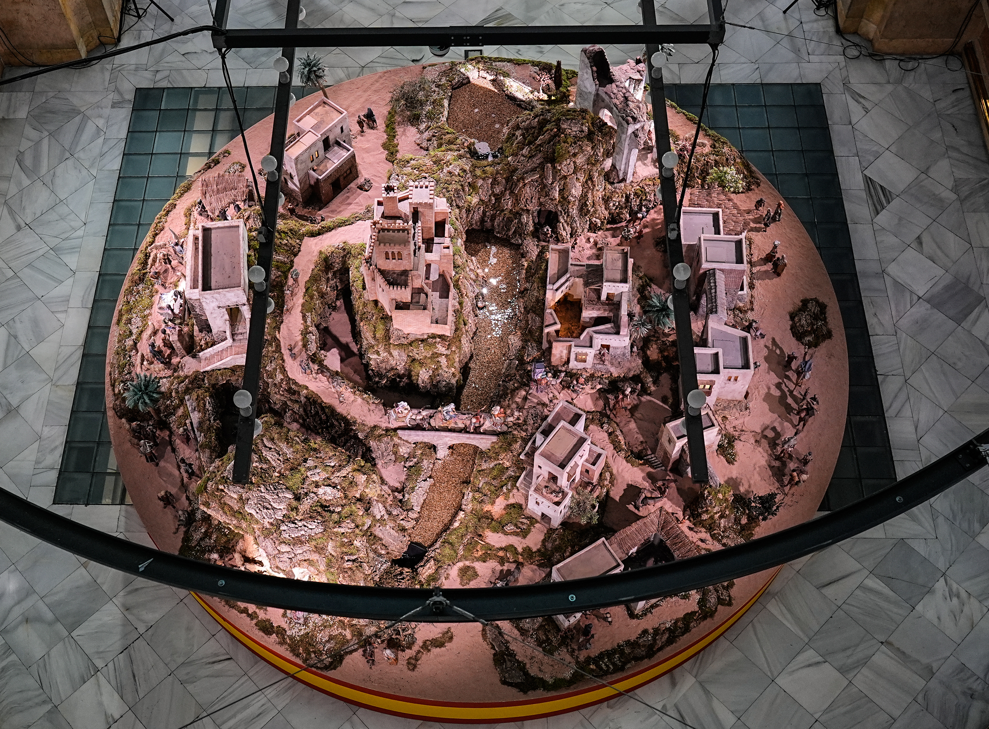 - La recreación ha sido realizada por la Asociación de Belenistas de Madrid con figuras y edificaciones de estilo hebreo modeladas por el artista belenista José Luis Mayo Lebrija, a quien el Ayuntamiento homenajea este año