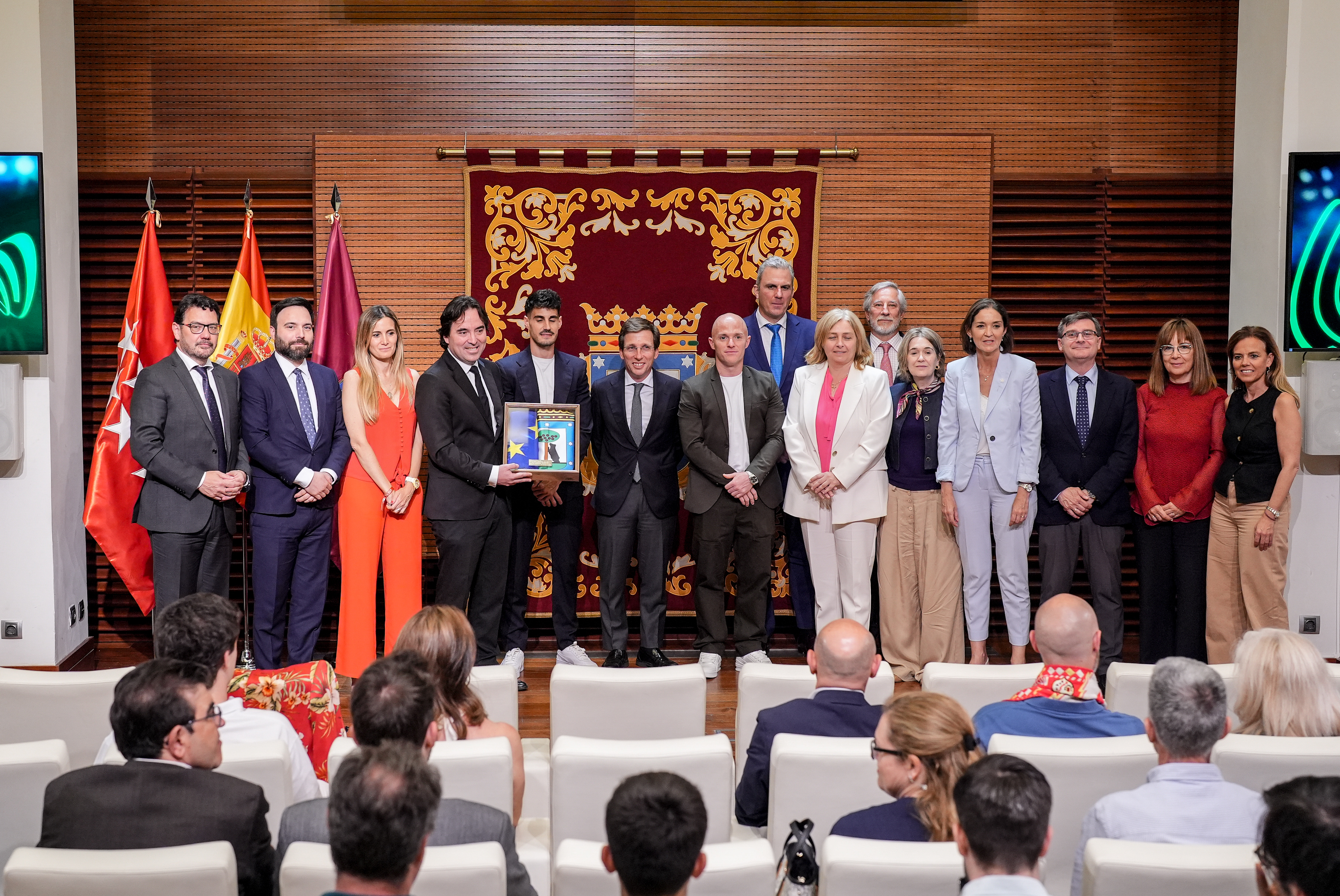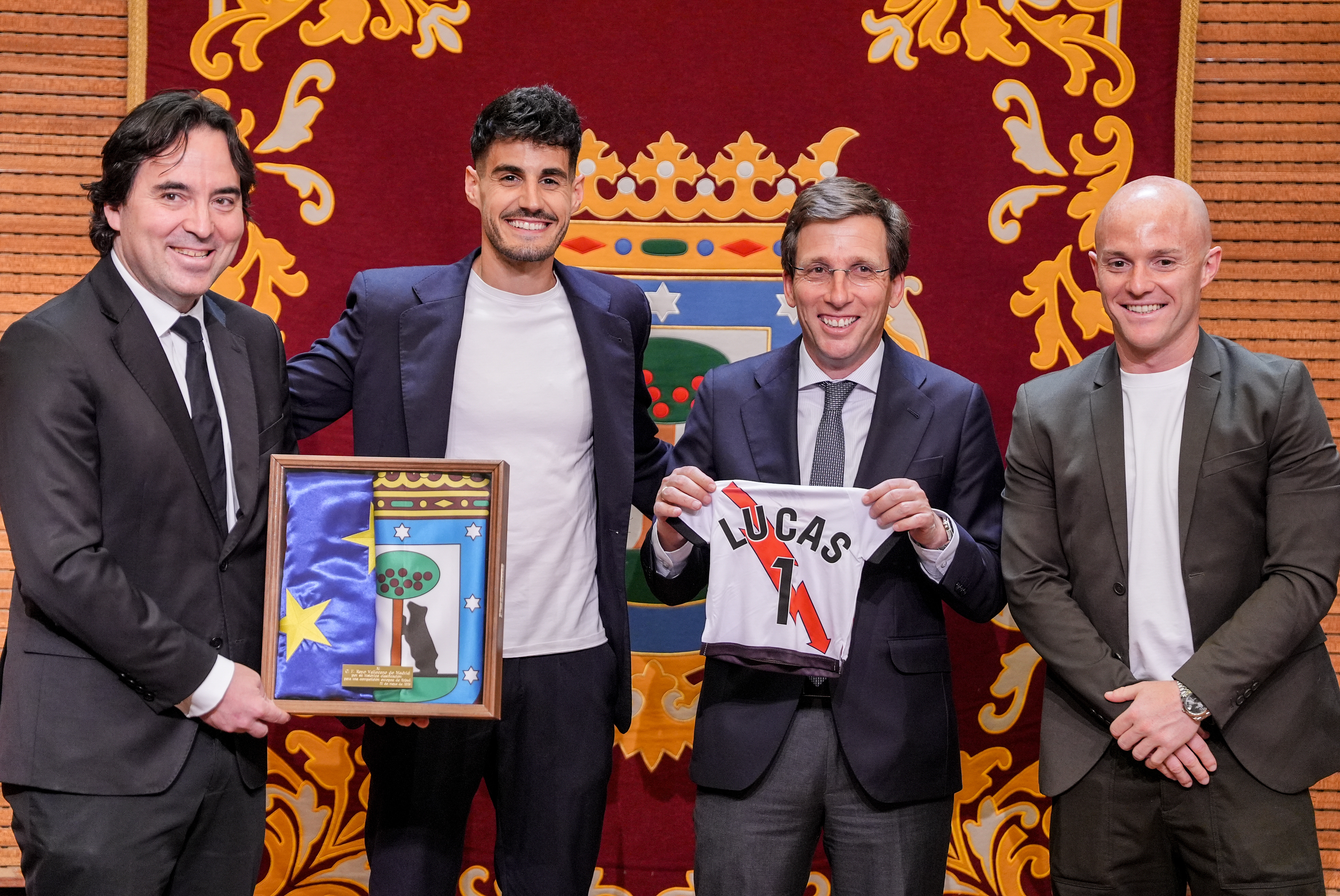 El alcalde de Madrid, José Luis Martínez-Almeida, acompañado por la vicealcaldesa, Inma Sanz; la delegada de Cultura, Turismo y Deporte, Marta Rivera de la Cruz; la concejala delegada de Deporte, Sonia Cea, y los concejales de los distritos de Villa y Puente de Vallecas, Ángel Niño y Carlos González Pereira, respectivamente, ha recibido esta tarde en el Palacio de Cibeles al Rayo Vallecano de Madrid tras clasificarse para la competición europea UEFA Conference League 2025-2026 en la última jornada de LaLiga EA Sports. De esta manera, el equipo participará por segunda vez en su historia en un torneo europeo.