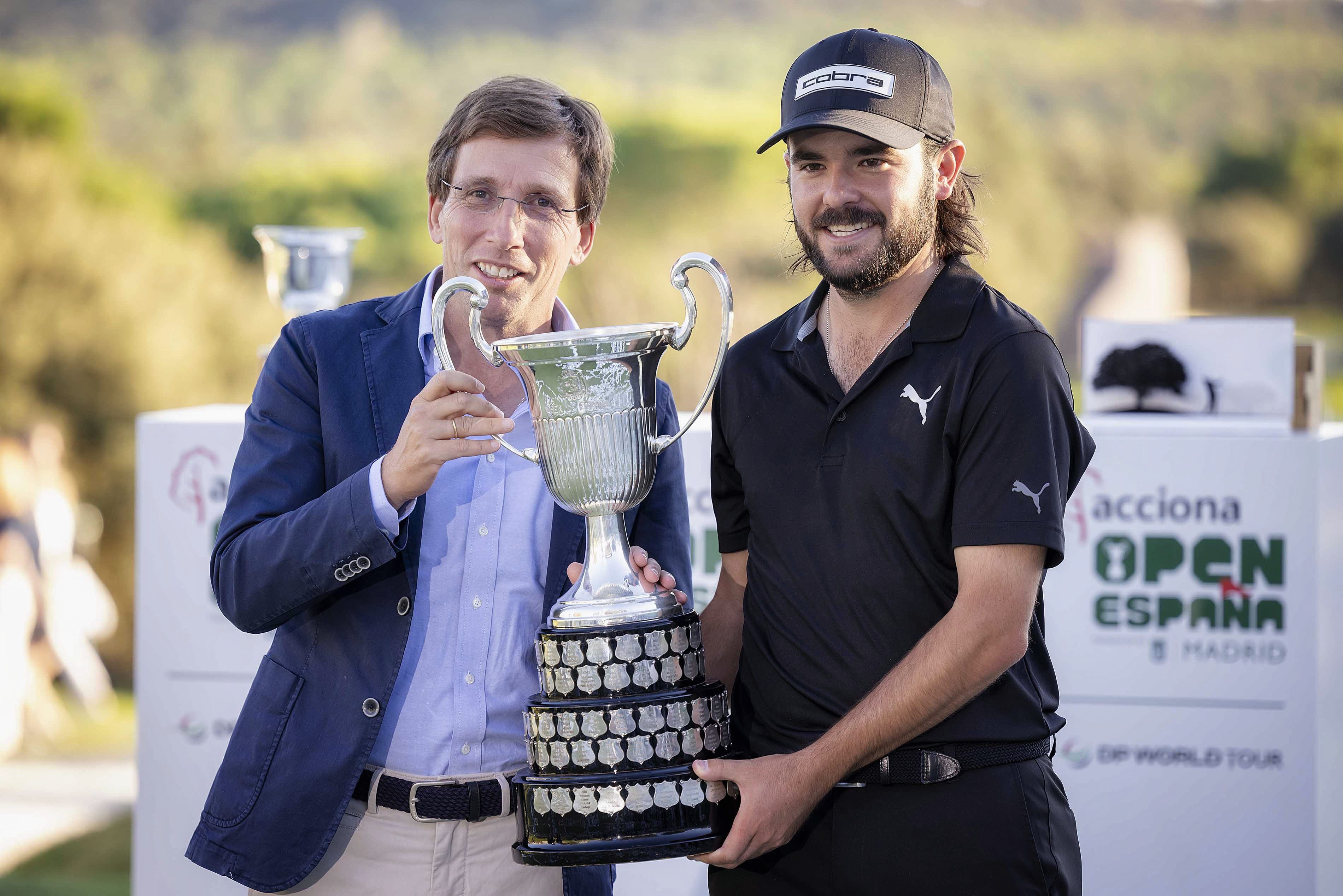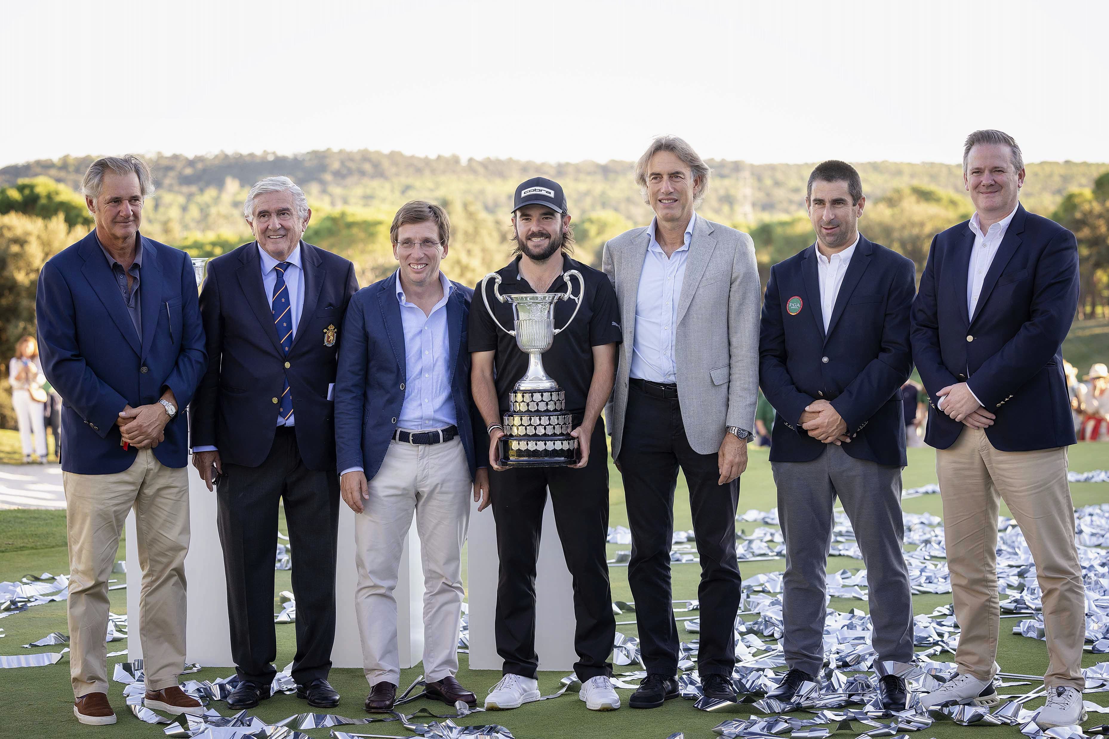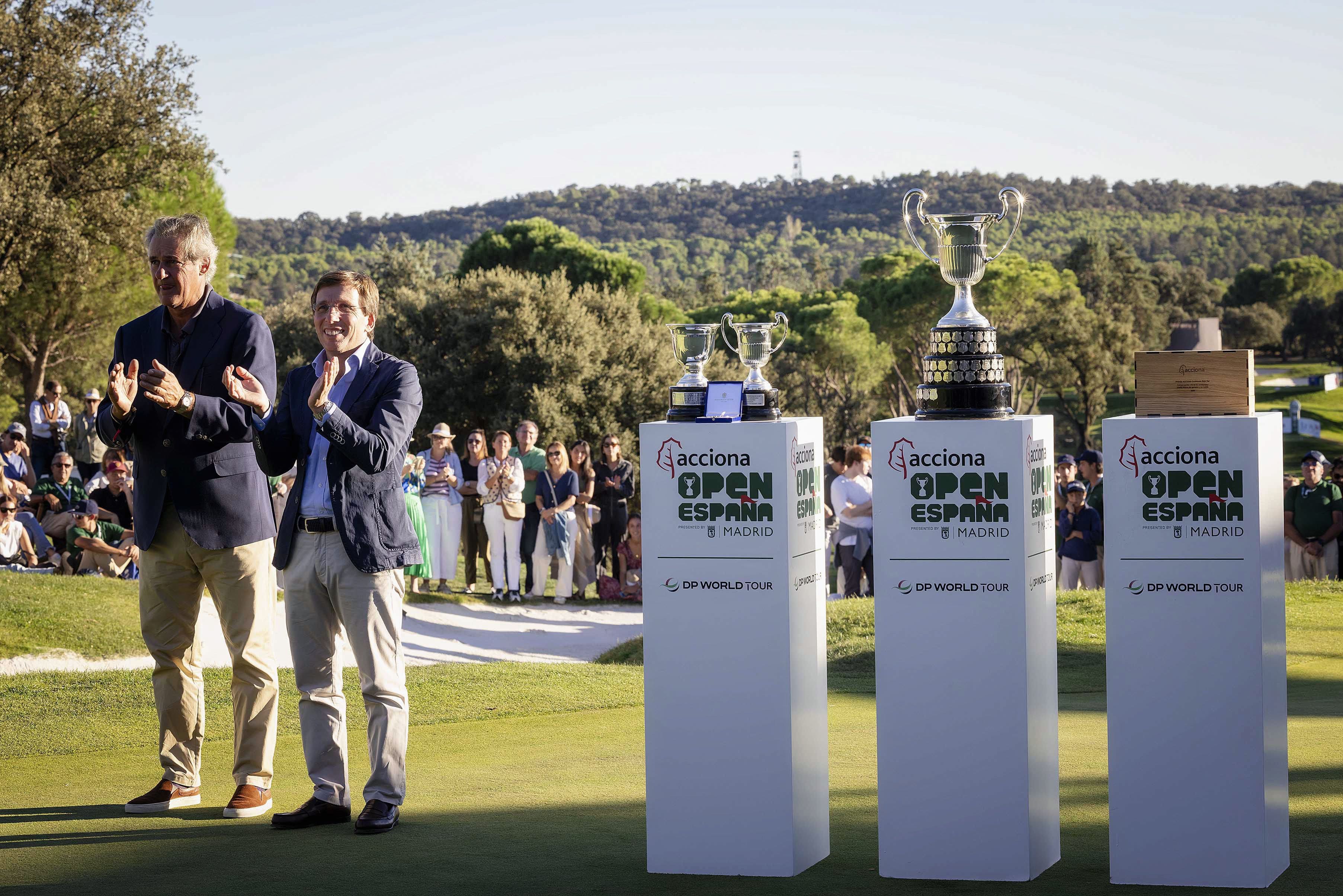 El alcalde de Madrid, José Luis Martínez-Almeida, ha entregado, junto al presidente de Acciona, José Manuel Entrecanales, y el presidente de la Real Federación Española de Golf, Gonzaga Escauriaza, el trofeo del Acciona Open de España de Golf a Ángel Hidalgo como vencedor del torneo.