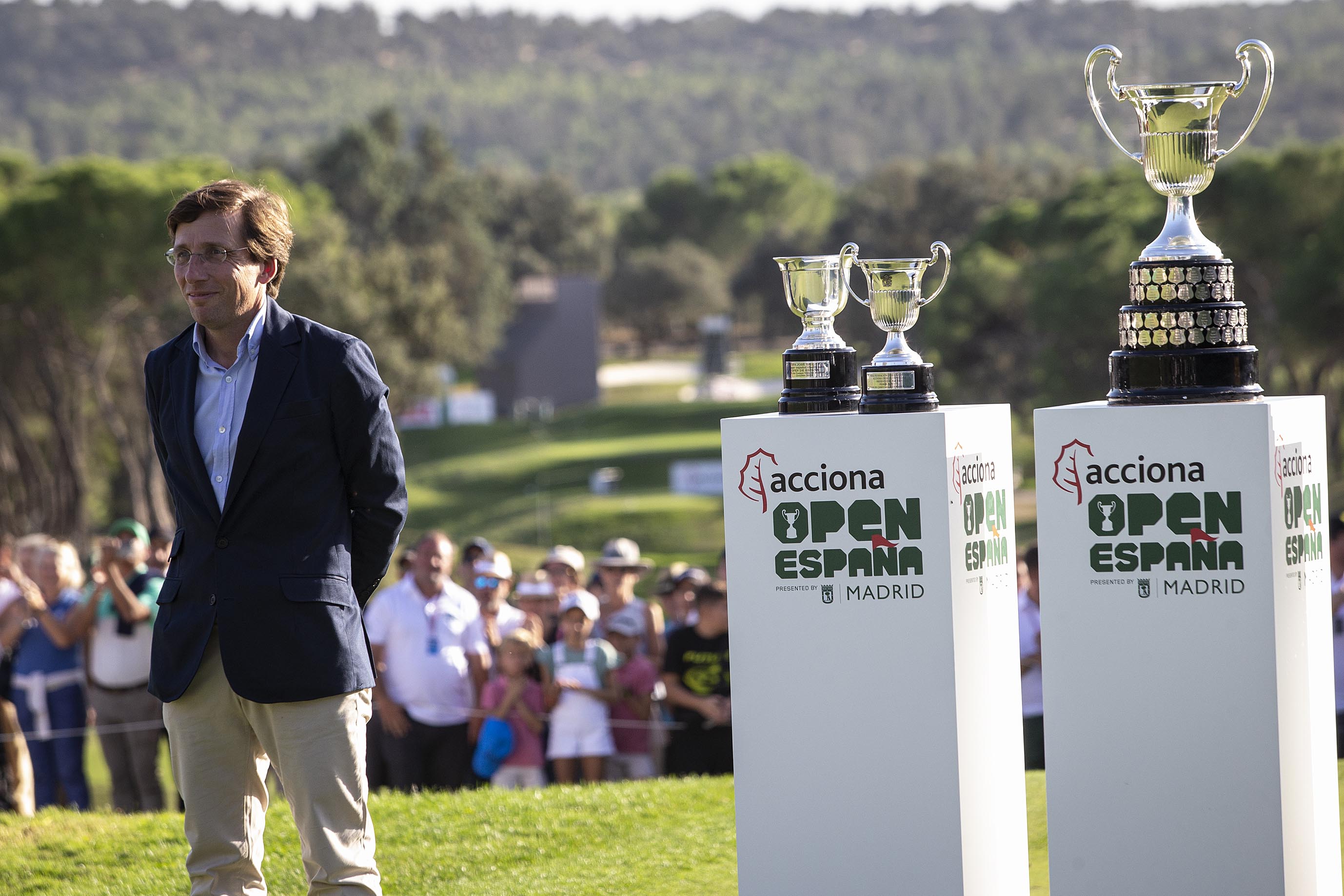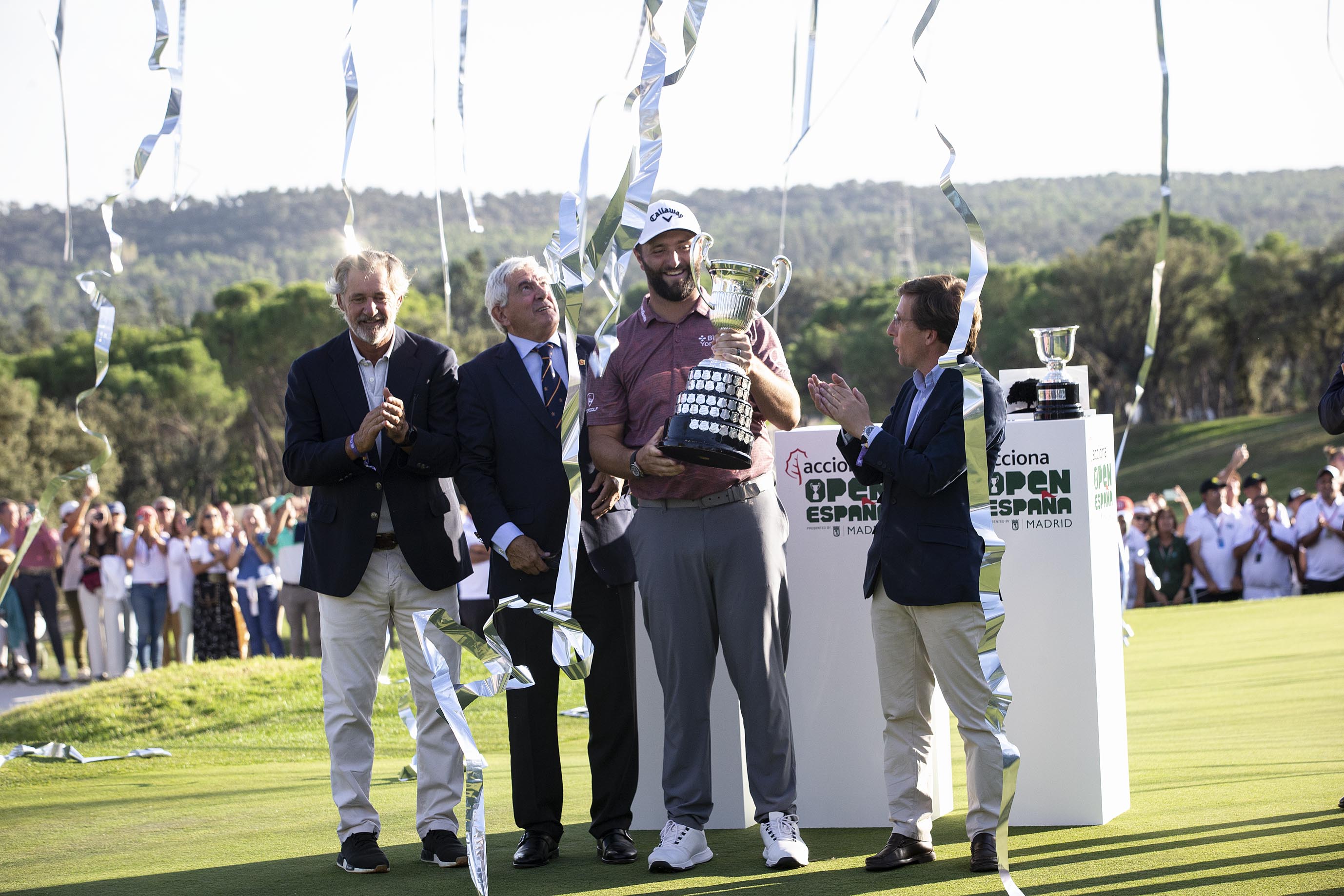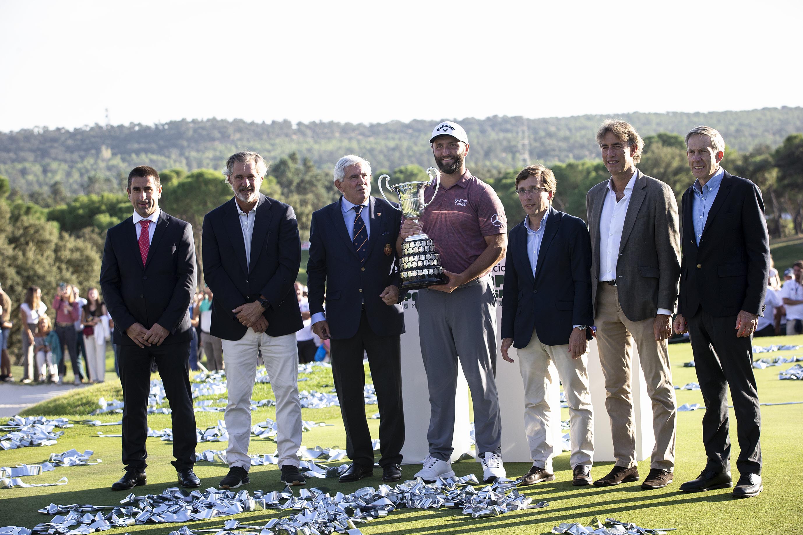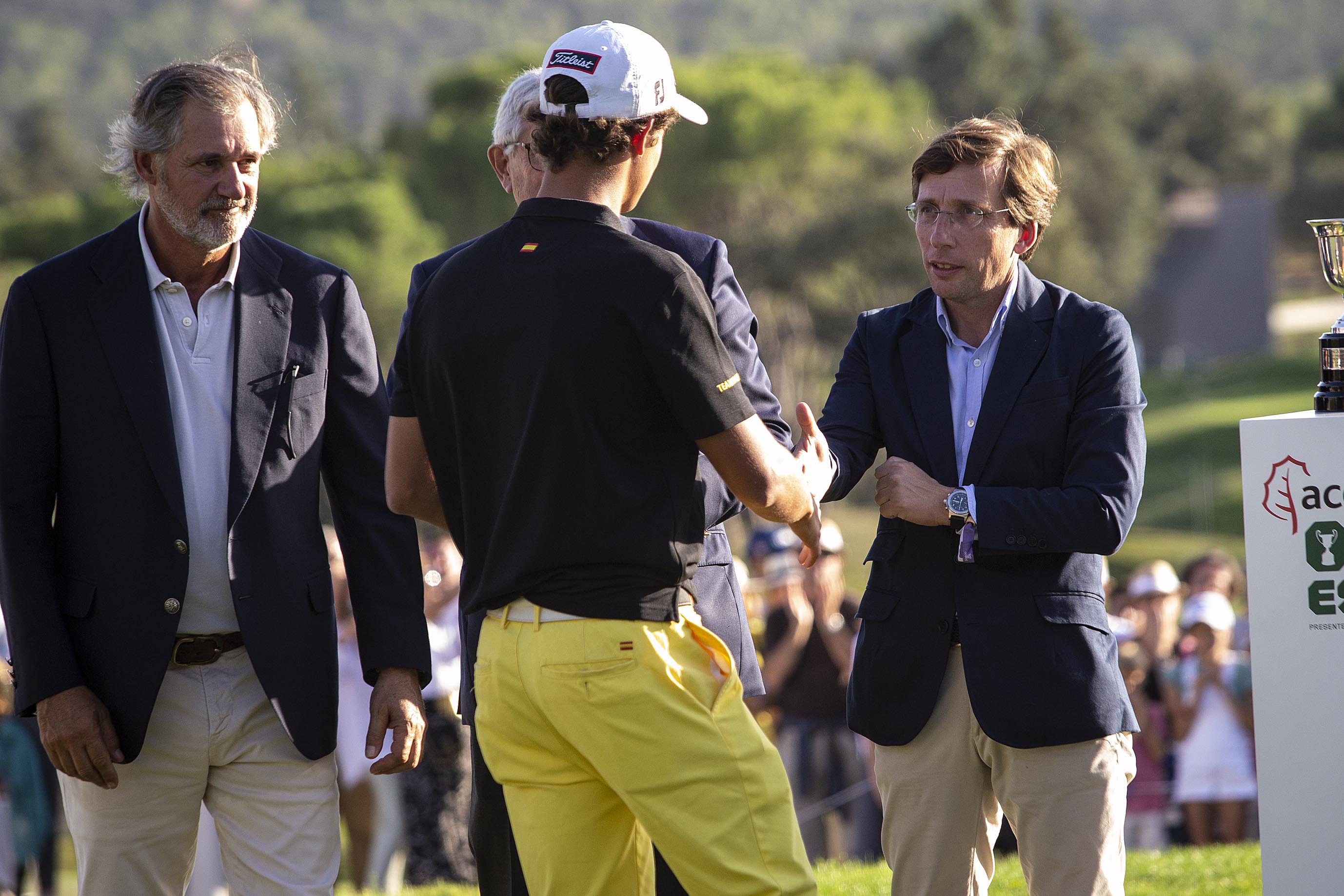 El alcalde de Madrid, José Luis Martínez-Almeida, ha entregado, junto al presidente de Acciona, José Manuel Entrecanales, y el presidente de la Real Federación Española de Golf, Gonzaga Escauriaza, el trofeo del Acciona Open de España de Golf a Jon Rahm como vencedor del torneo.