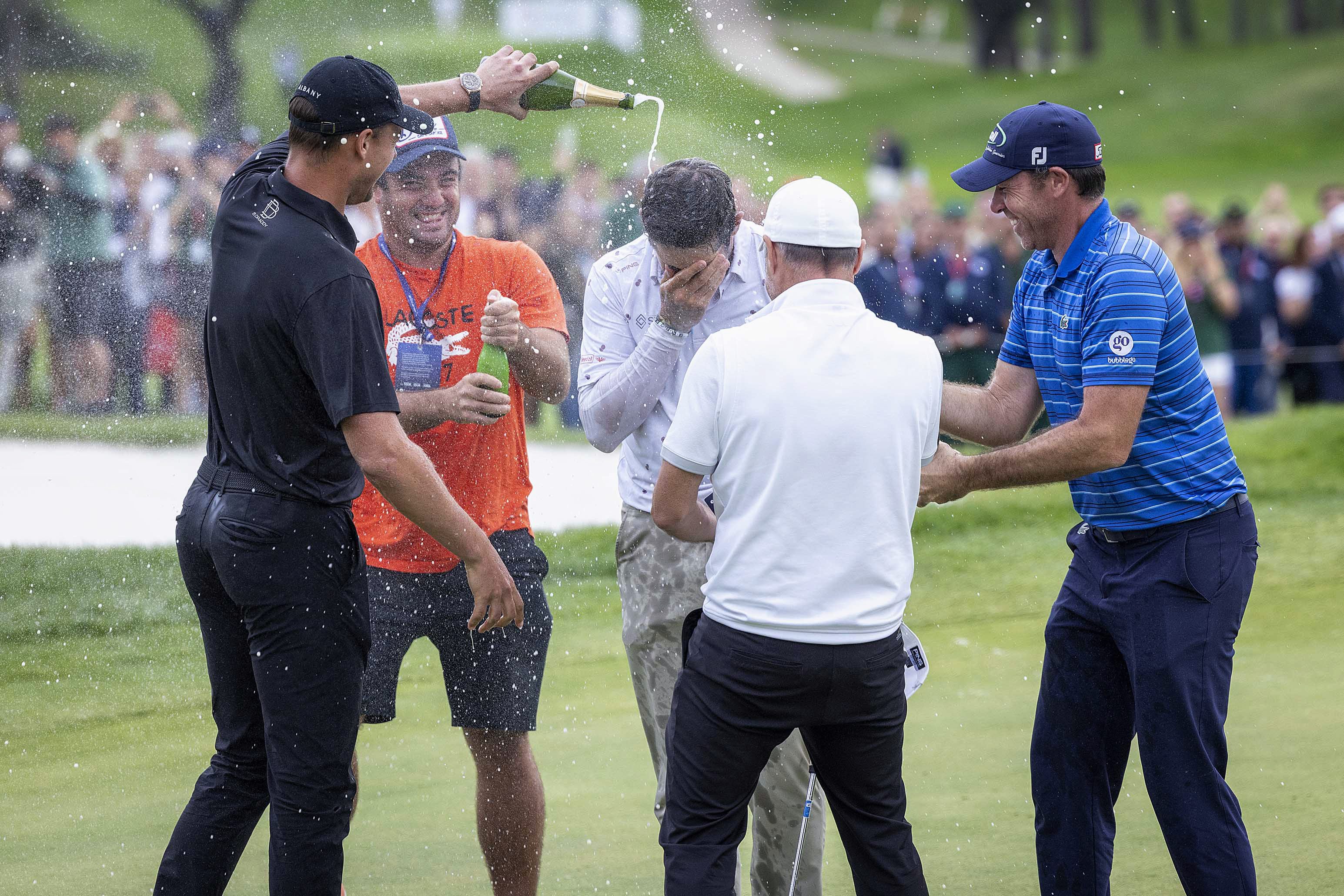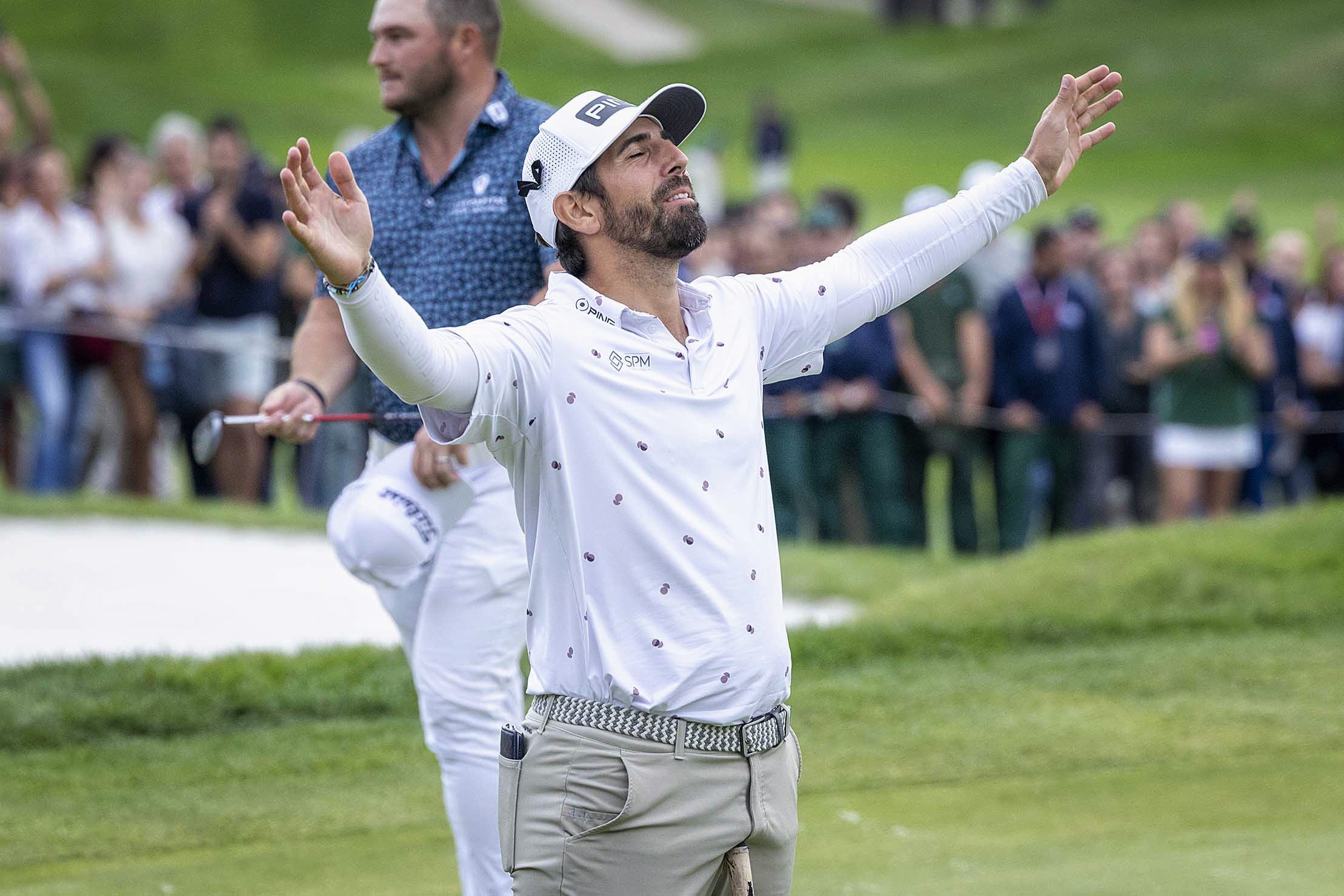Almeida entrega a Matthieu Pavon el trofeo del Acciona Open de España de golf