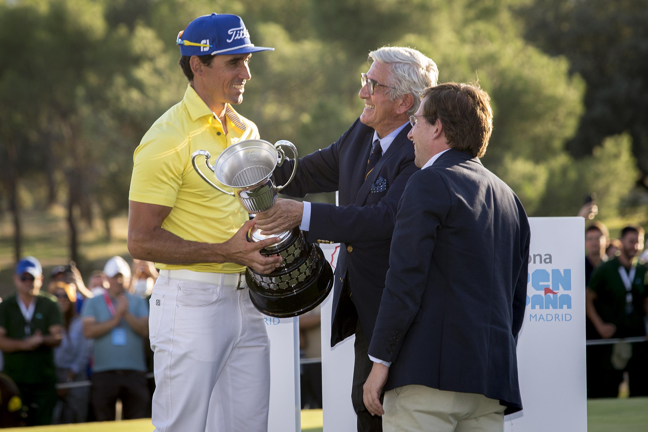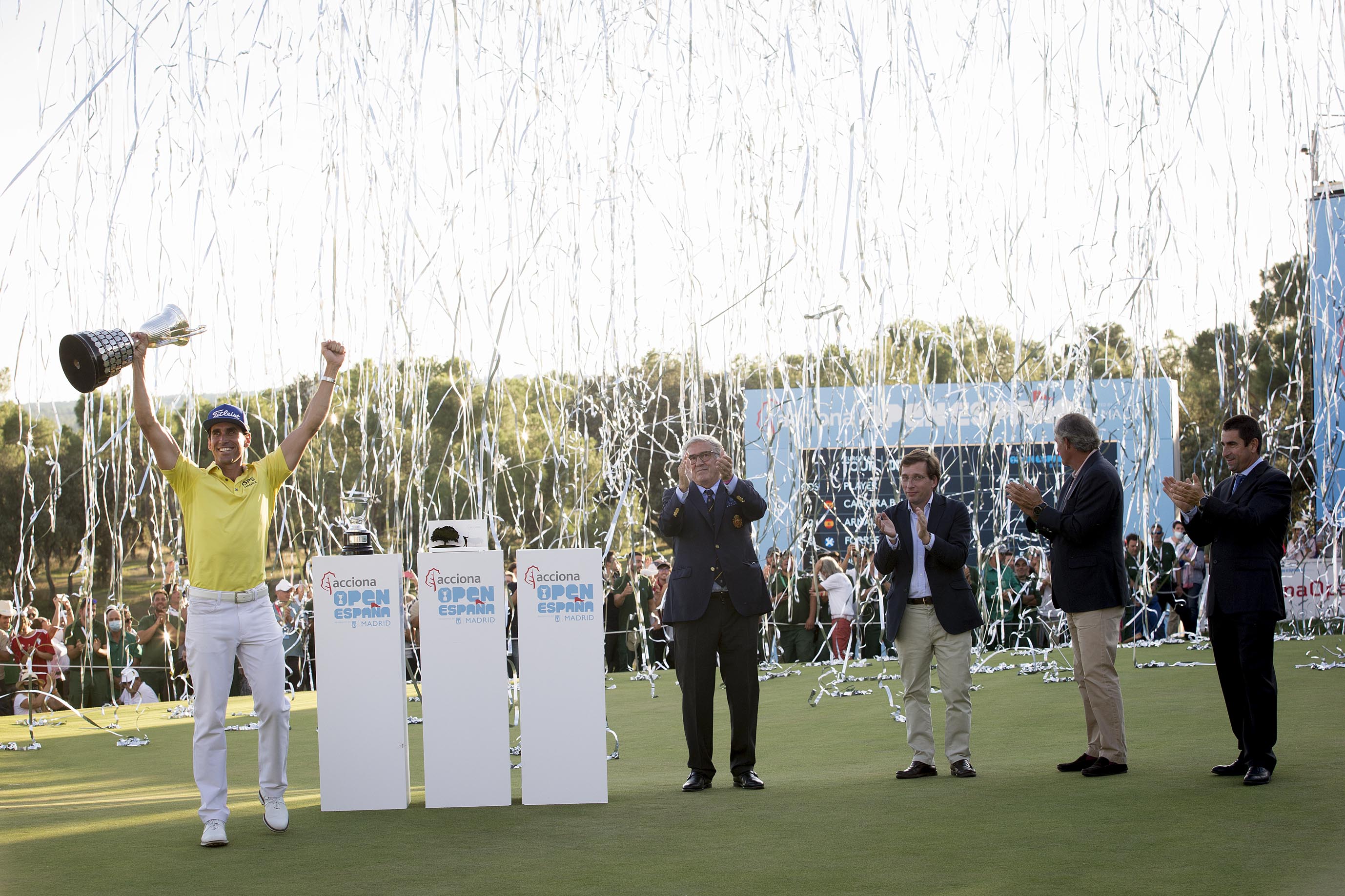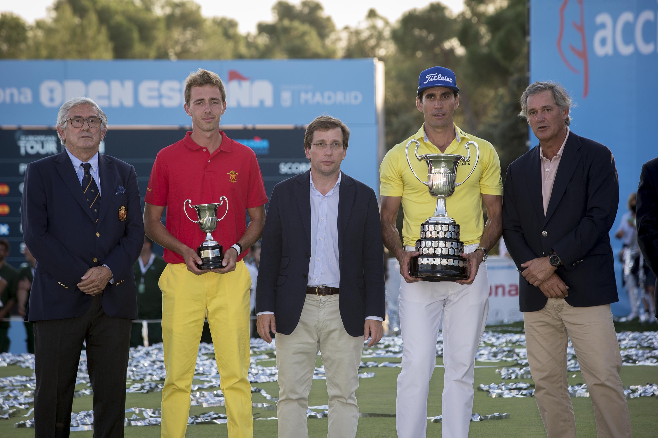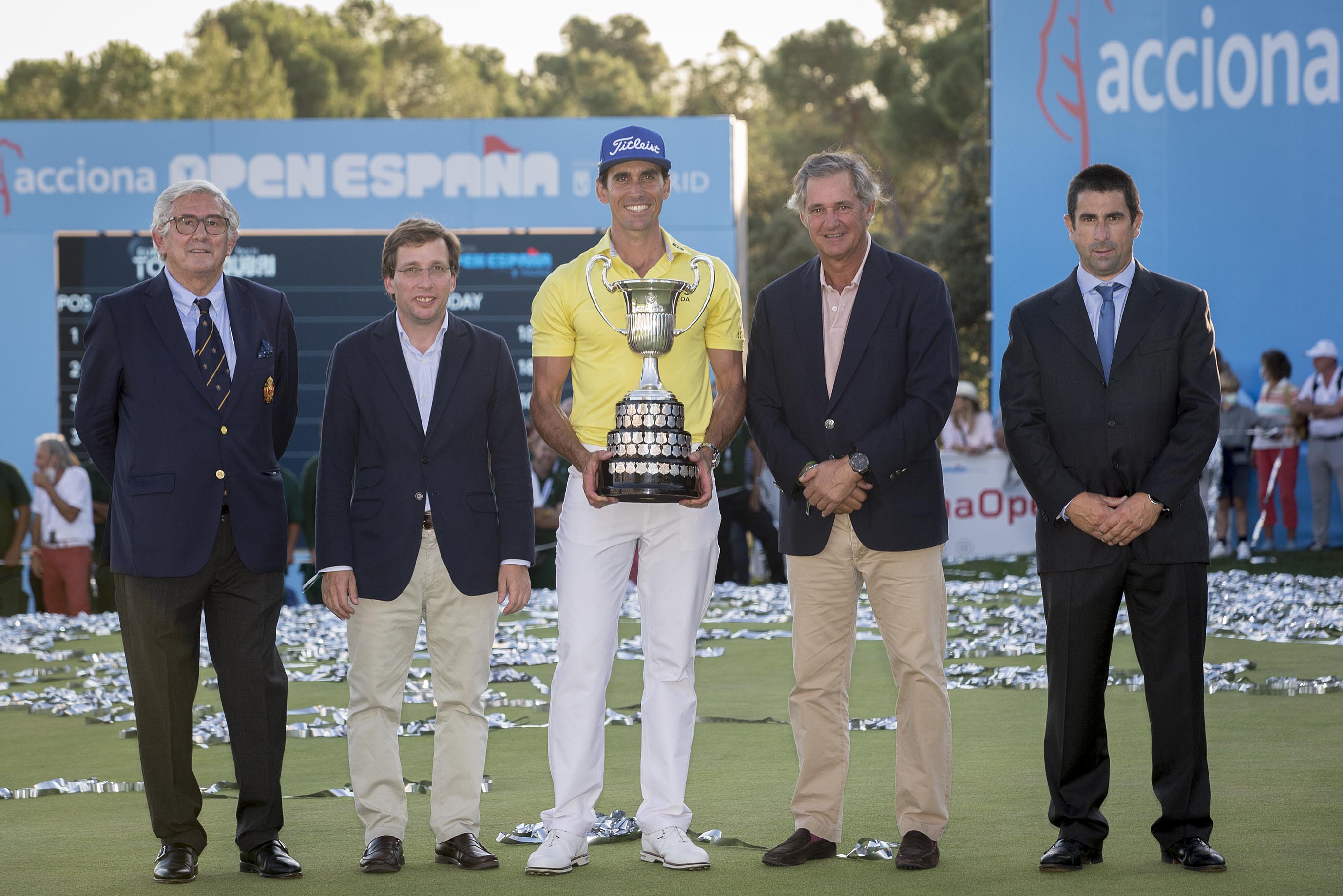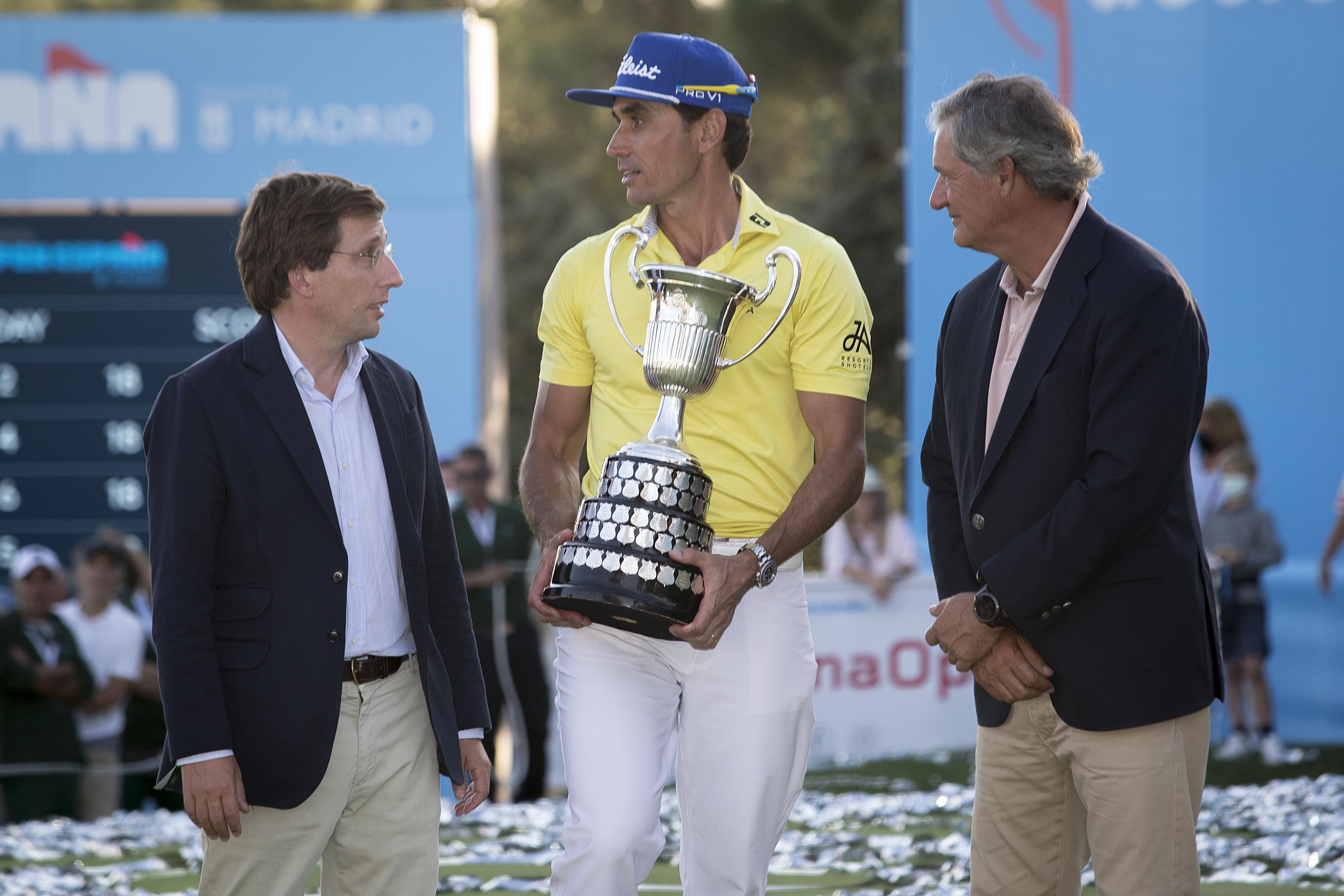 El alcalde de Madrid, José Luis Martínez-Almeida, ha entregado, junto al presidente de Acciona, José Manuel Entrecanales, y el presidente de la Real Federación Española de Golf, Gonzaga Escauriaza, el trofeo del Acciona Open de España de Golf a Rafa Cabrera como vencedor del torneo.