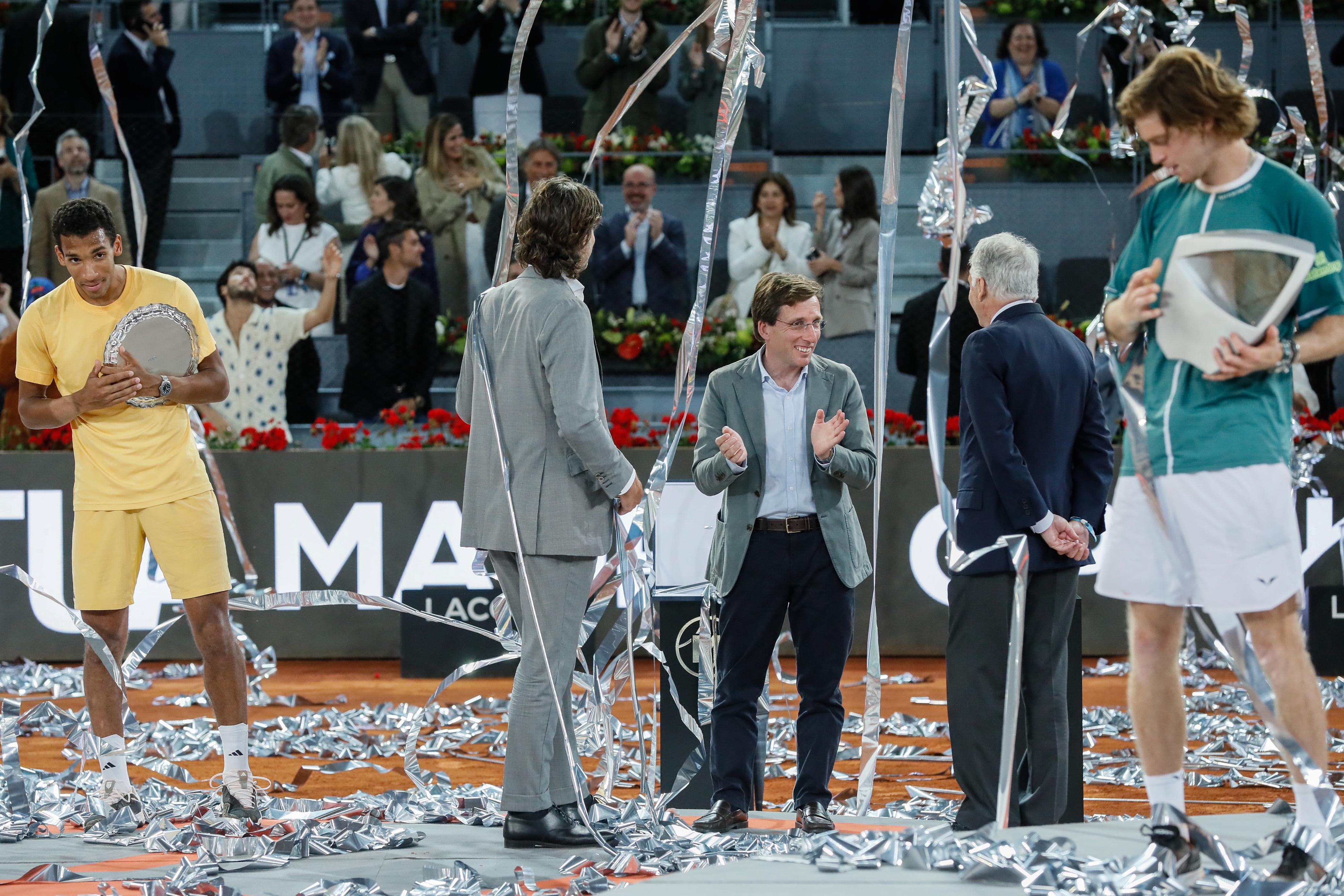 El alcalde de Madrid, José Luis Martínez-Almeida, ha entregado esta noche al tenista ruso Andrey Rublev el trofeo de campeón del Mutua Madrid Open 2024, junto al director del torneo, Feliciano López, y el presidente de Mutua Madrileña, Ignacio Garralda. Rublev ha vencido al canadiense Félix Auger-Aliassime (4-6,7-5,7-5) en el Estadio Manolo Santana, consiguiendo así su primera victoria en este torneo.