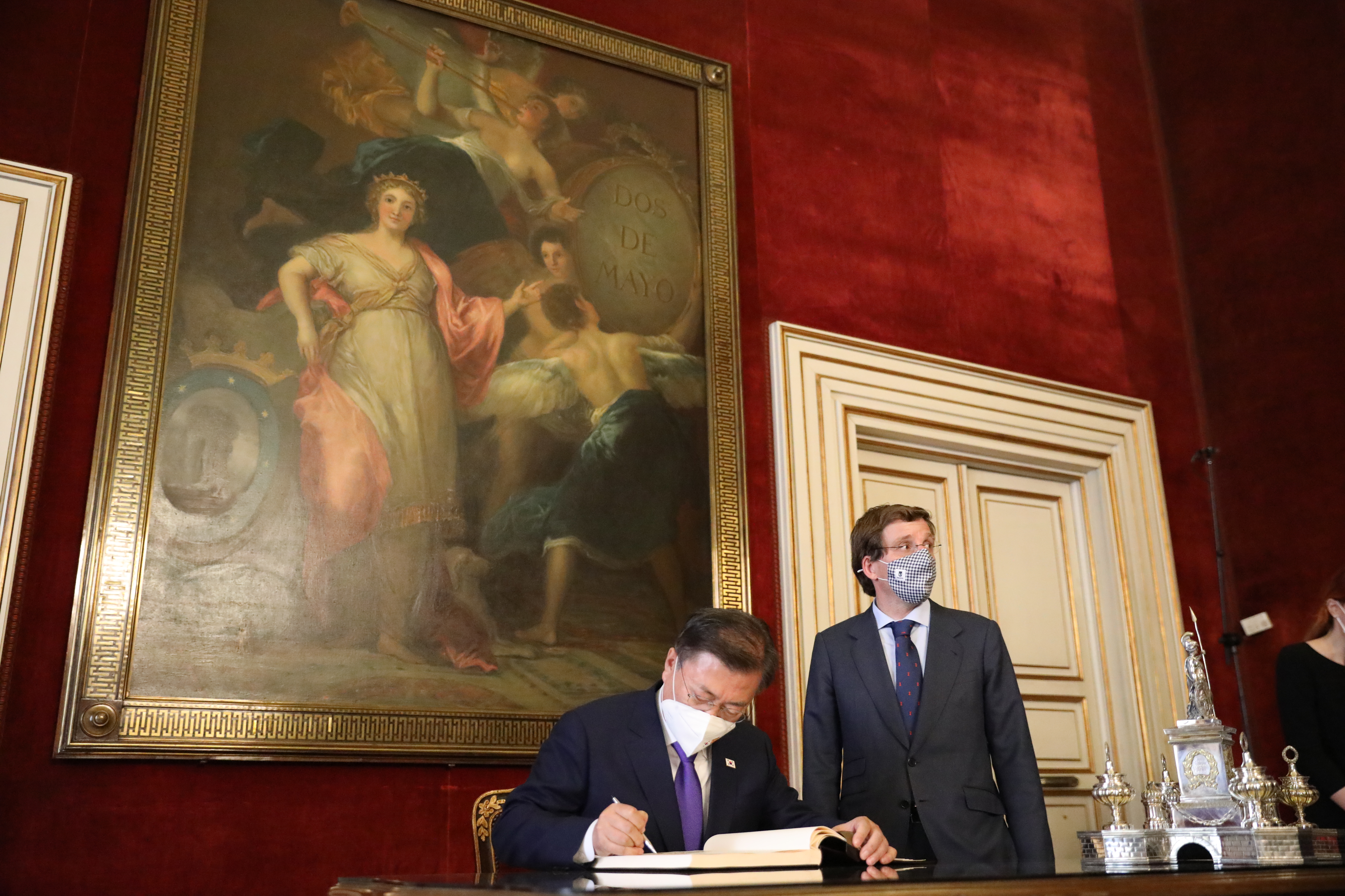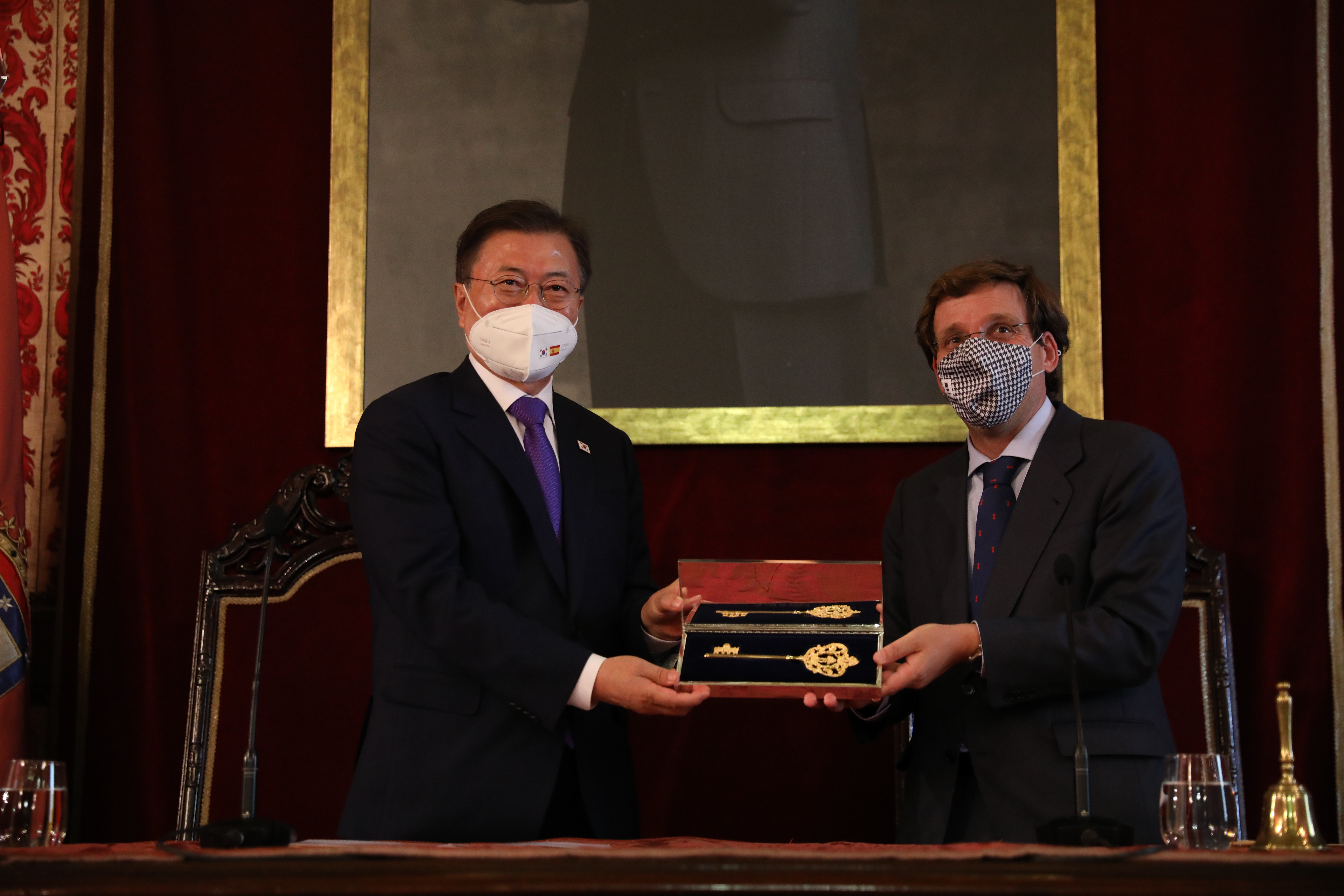 El alcalde de Madrid, José Luis Martínez-Almeida, ha entregado esta tarde la Llave de Oro de la Villa de Madrid al presidente de la República de Corea, Moon Jae-In, con motivo de su visita a la capital dentro del viaje de Estado a España que lleva a cabo durante los días 15 y 16 de junio. En el acto, que ha tenido lugar en el Salón de Plenos de la plaza de la Villa, han estado presentes la vicealcaldesa, Begoña Villacís, los delegados de área, así como los concejales de los distritos y representes de los grupos municipales.