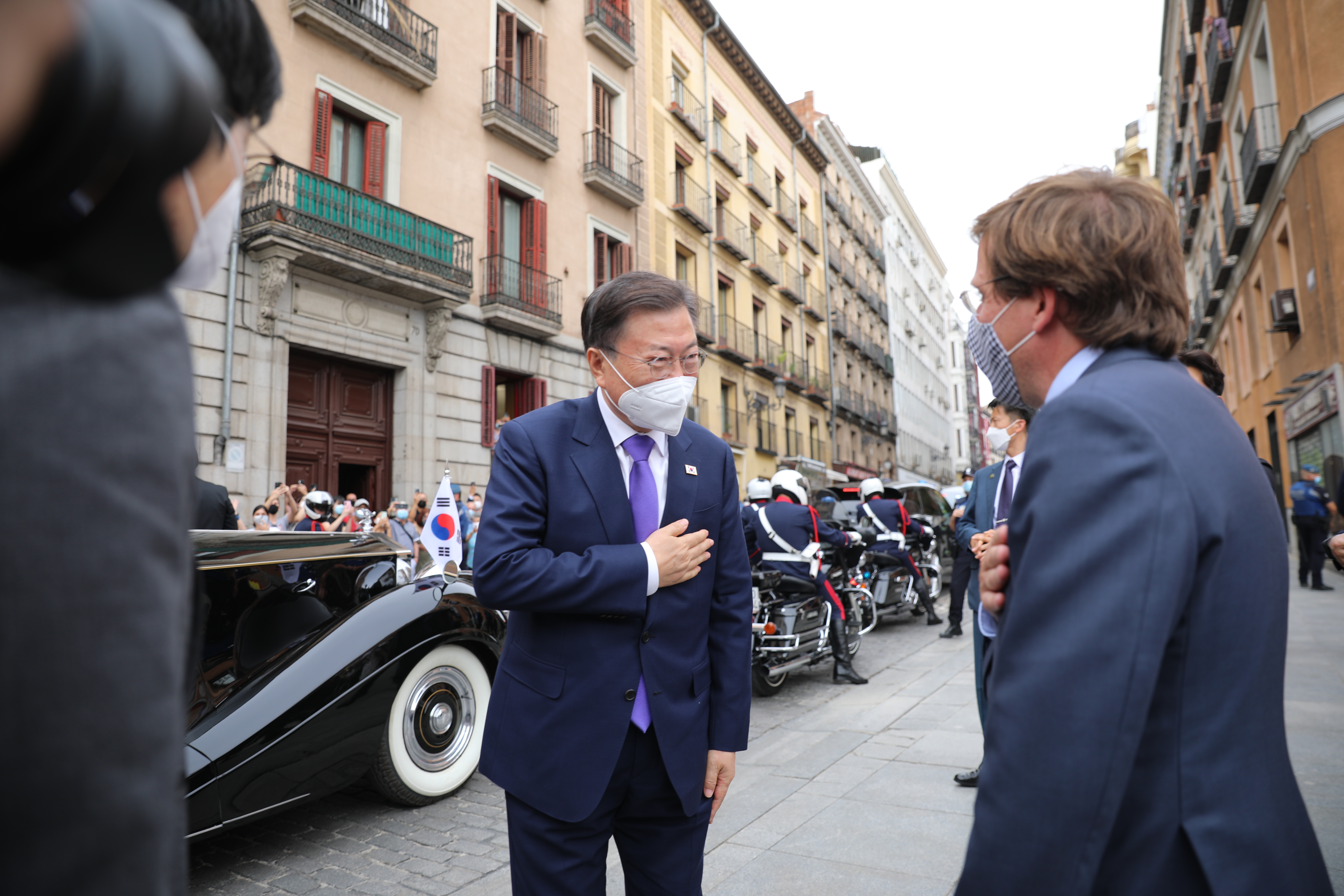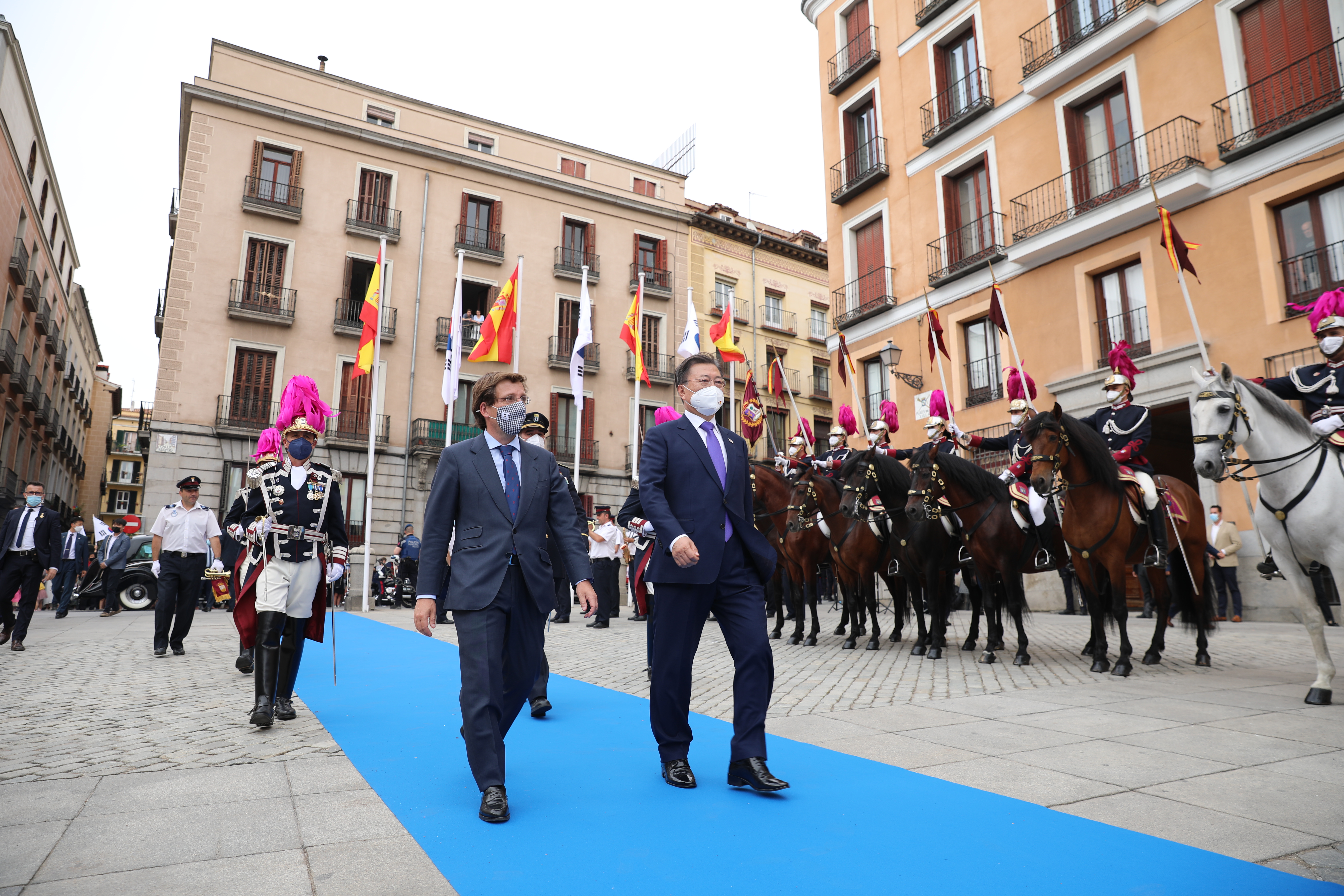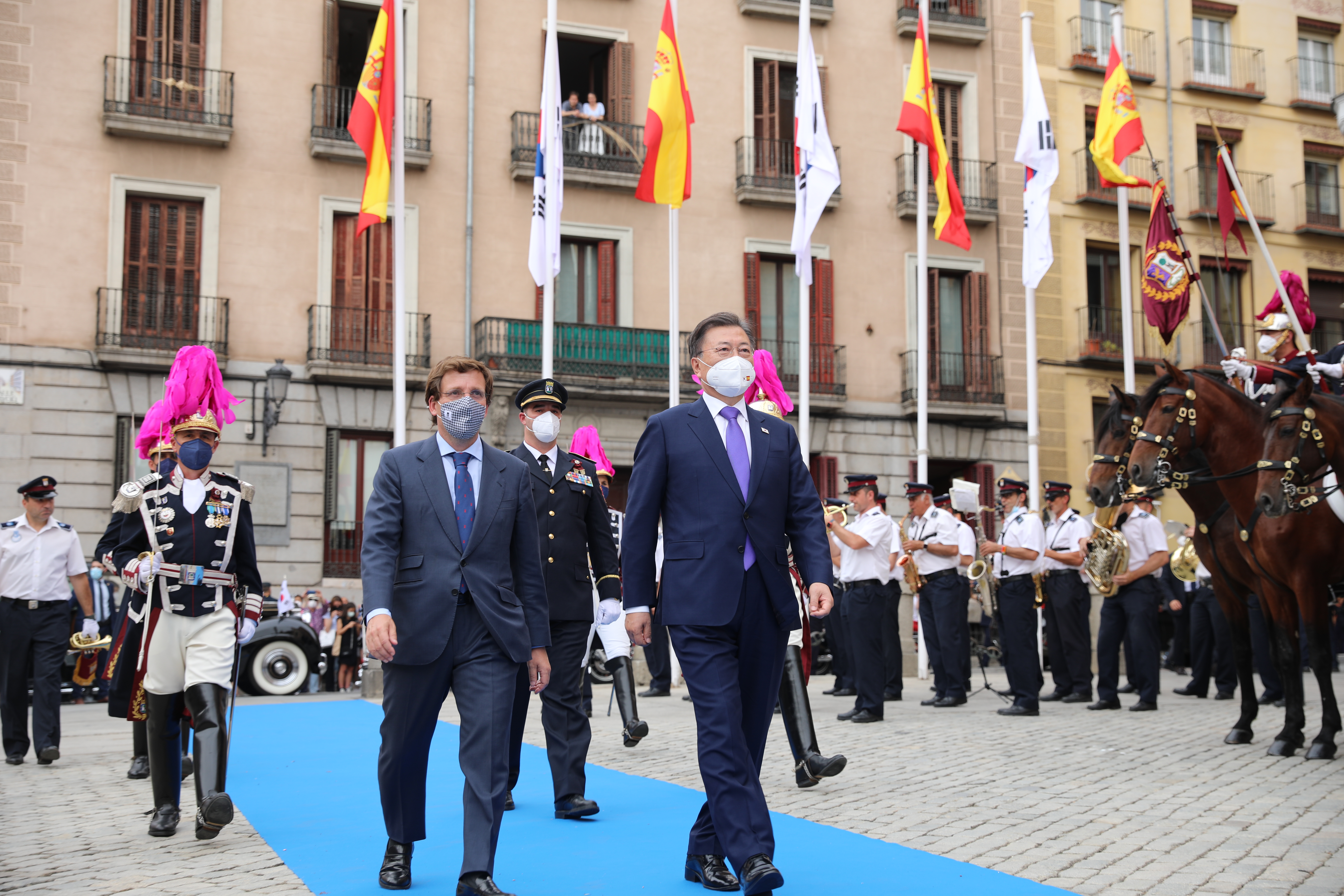 Almeida y Moon Jae-In han pasado revista en la plaza de la Villa al Escuadrón y a la Policía Municipal a pie y el presidente de la República de Corea ha firmado en el Libro de Honor del Ayuntamiento. /