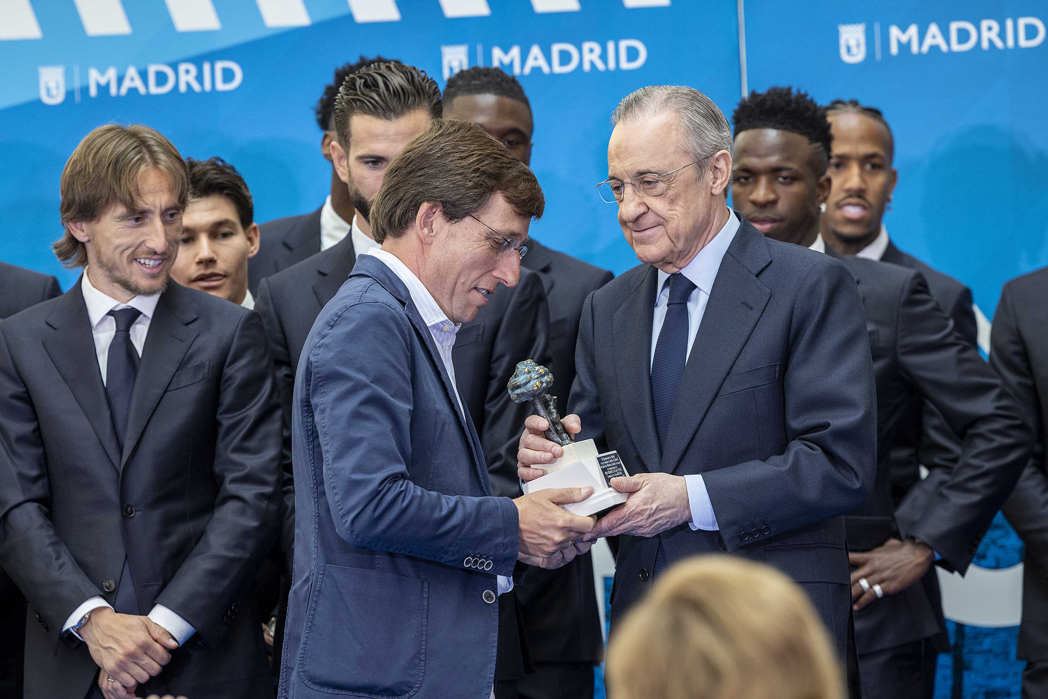 El alcalde ha hecho entrega del símbolo de la ciudad de Madrid, el Oso y el Madroño, a Florentino Pérez, quien le ha entregado una réplica del trofeo de la liga y la camiseta del club./