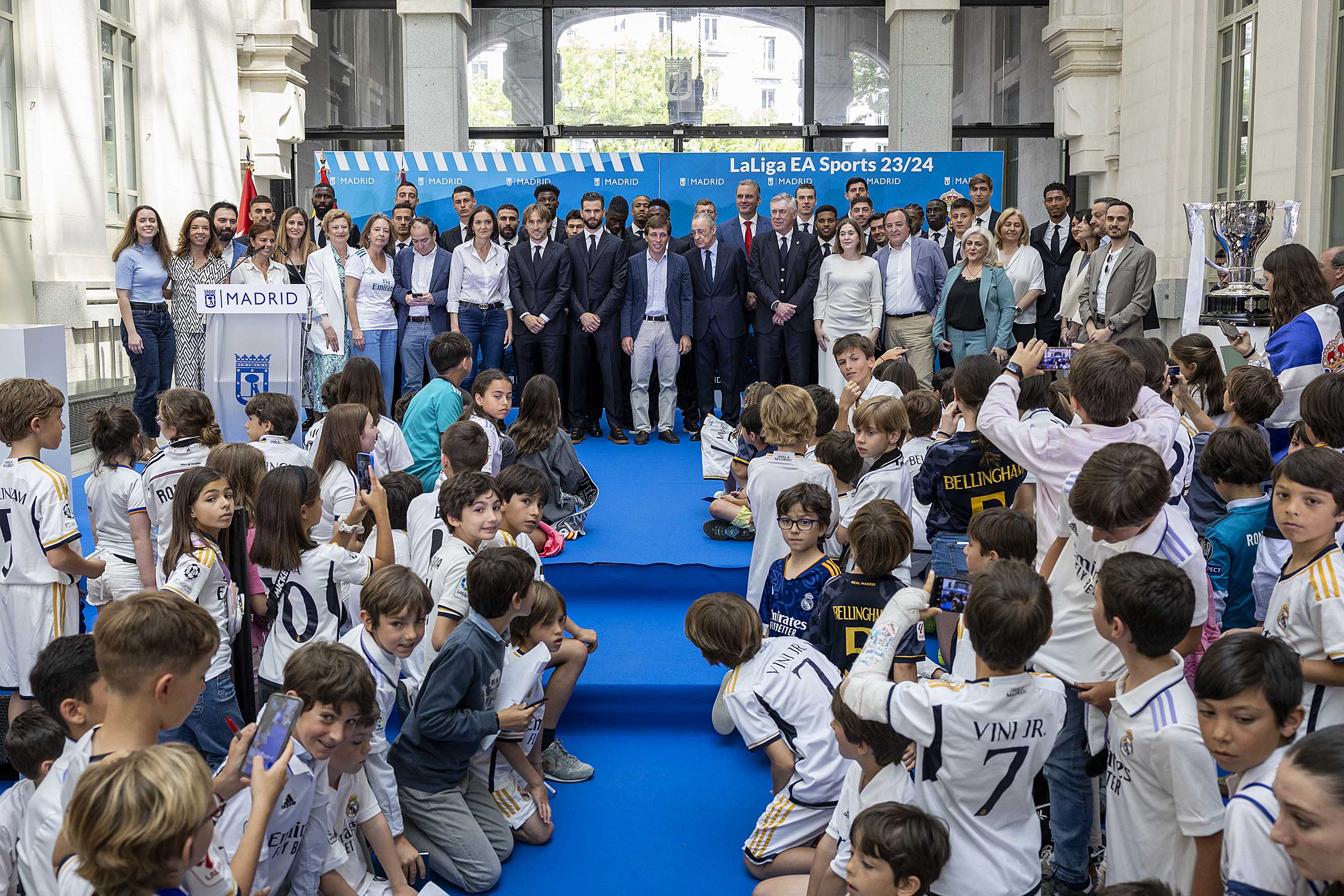El alcalde de Madrid, José Luis Martínez-Almeida, ha recibido esta mañana al Real Madrid Club de Fútbol en el Palacio de Cibeles tras proclamarse vencedor de la LaLiga Ea Sports 2023-2024, un título que el equipo ha ofrecido a todos los madrileños. Acompañado por miembros del equipo de Gobierno y representantes de los grupos municipales, ha felicitado al club blanco por su 36ª título de liga, “extraordinariamente merecido”.