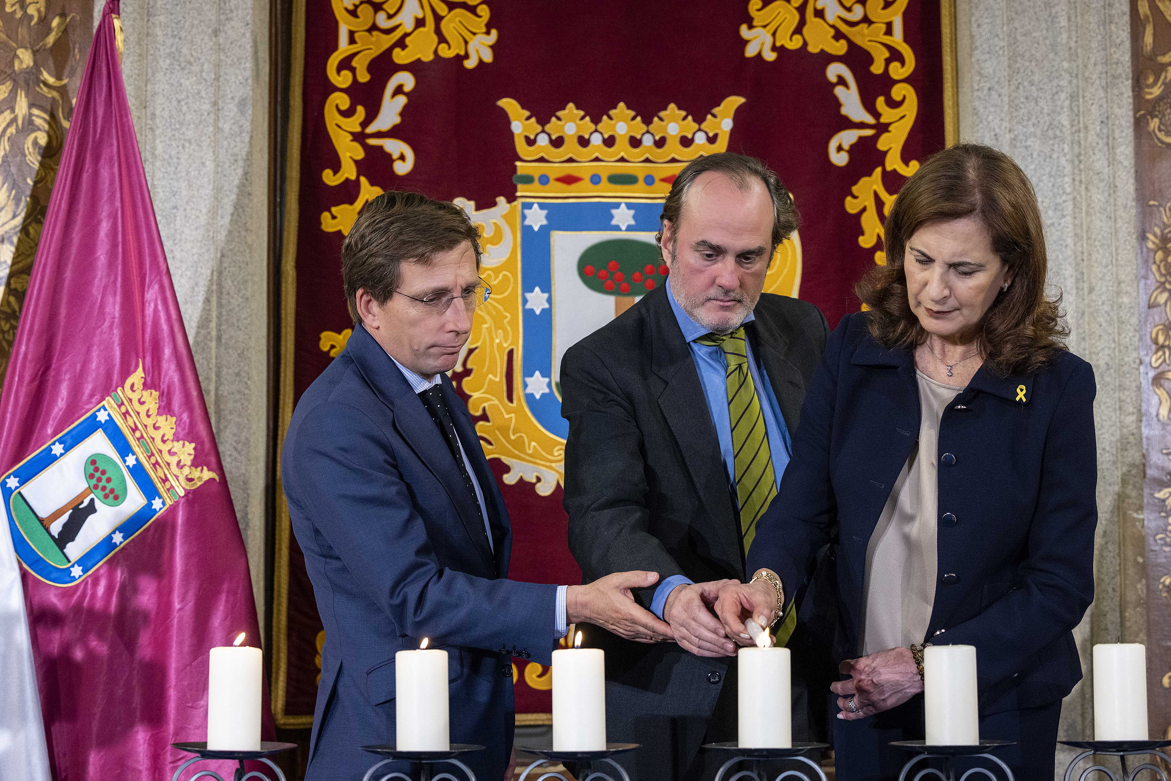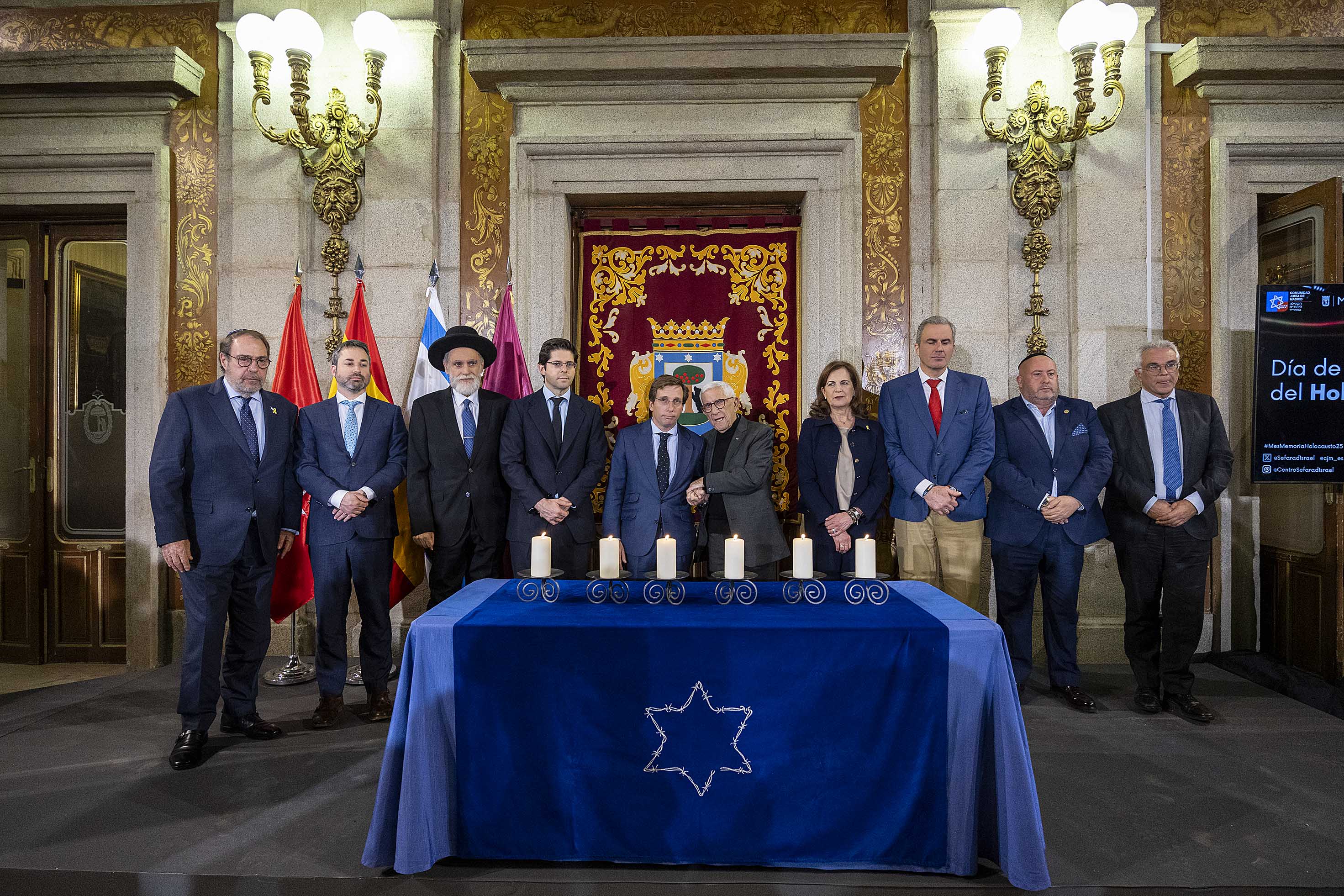 El regidor madrileño ha encendido la cuarta de las seis velas en memoria de las víctimas del holocausto, en nombre de toda forma de resistencia y en honor a los justos entre las naciones y a quienes salvaron a miles de perseguidos poniendo en riesgo sus vidas, como el español Ángel Sanz-Briz, junto al nieto de este joven diplomático y a la presidenta de la Comunidad Judía en Madrid, Estrella Bengio.