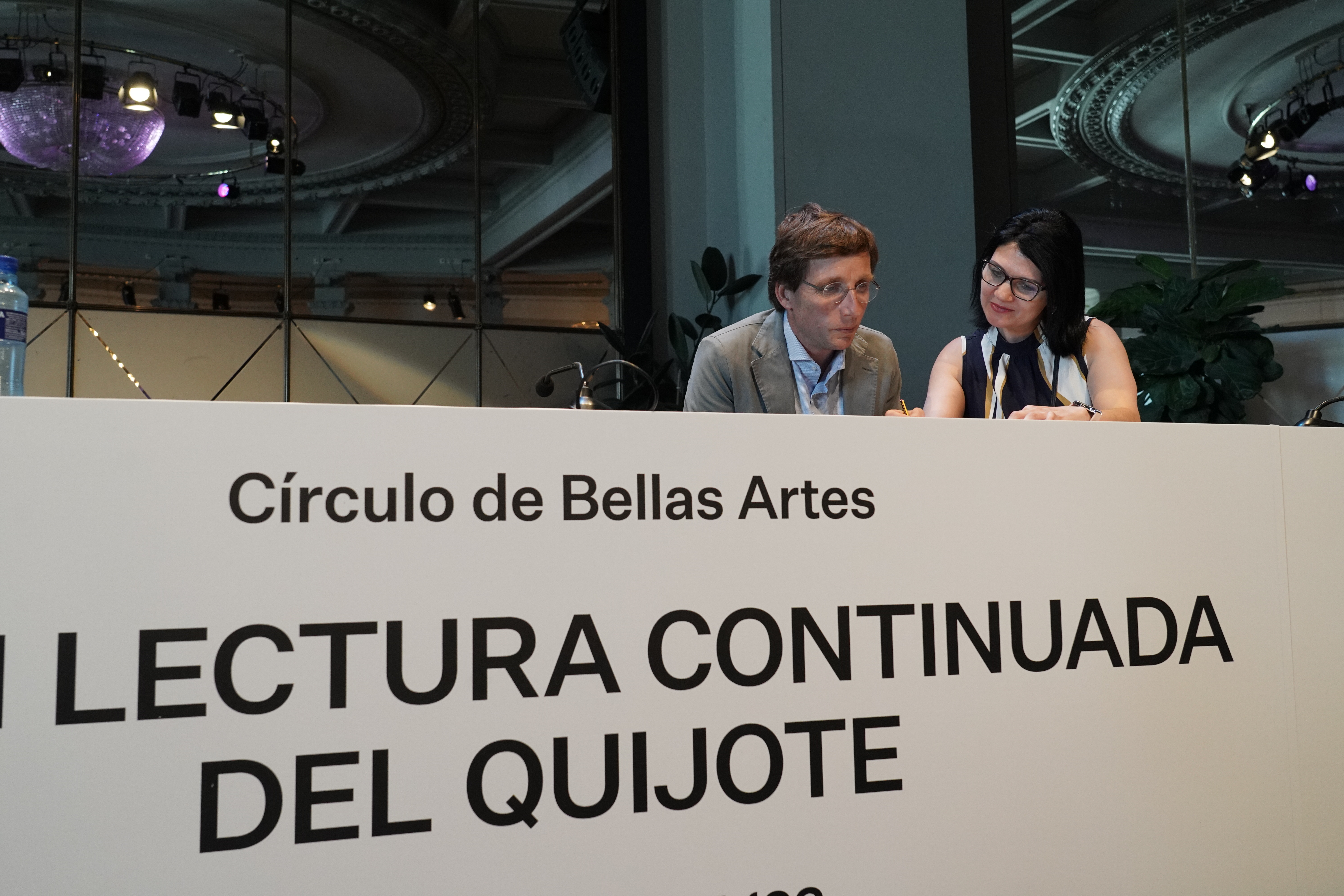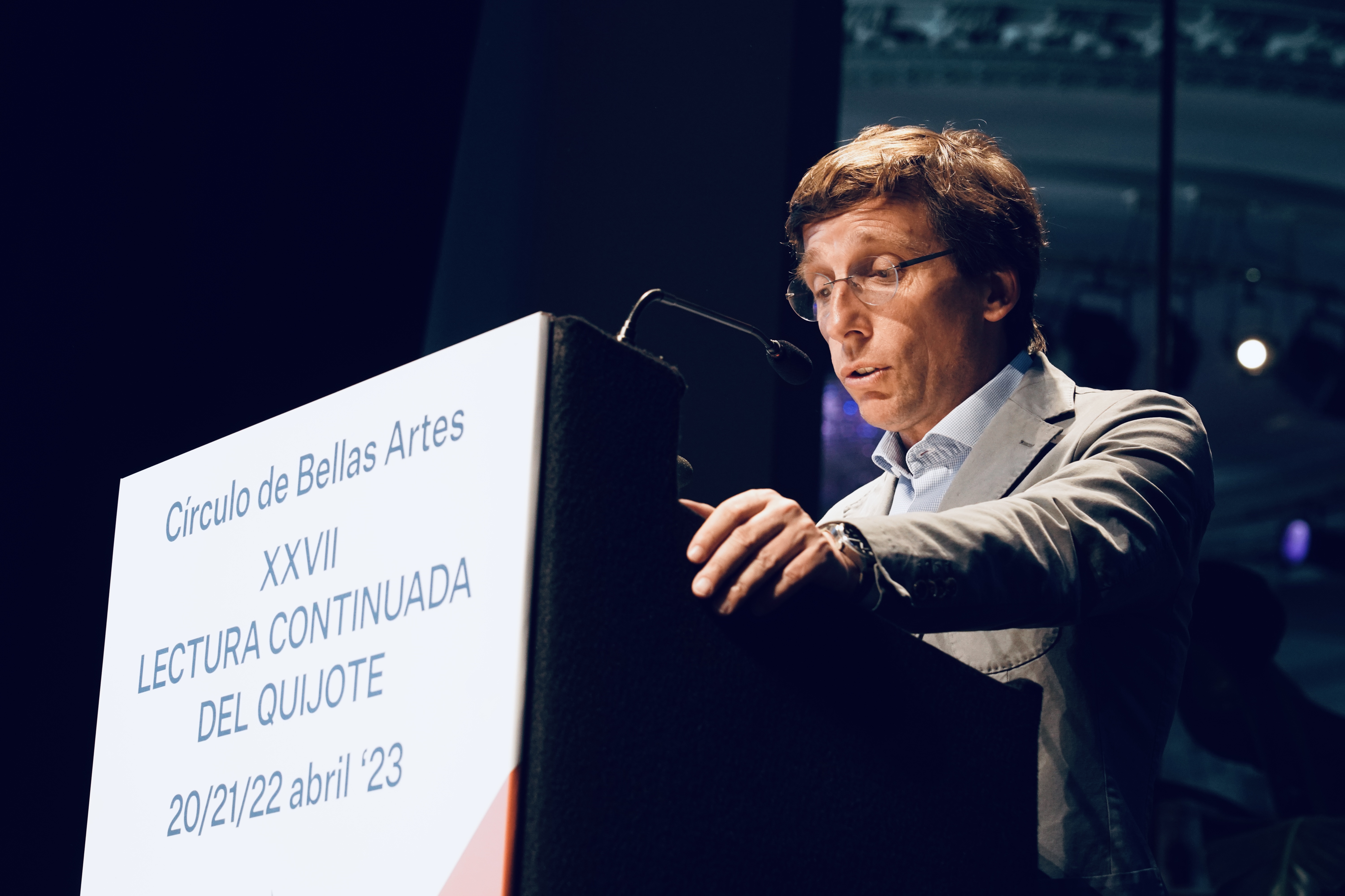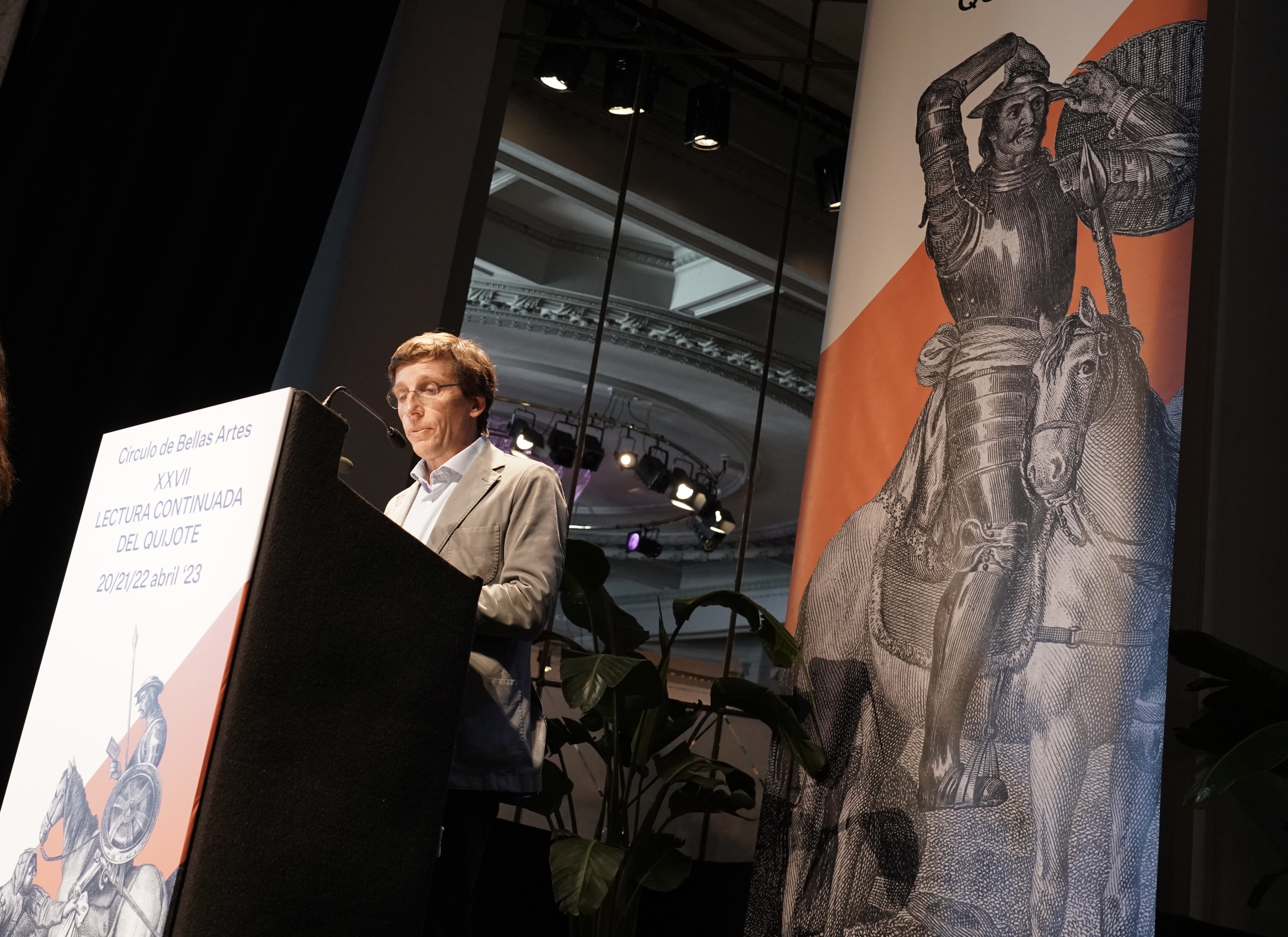 El alcalde de Madrid, José Luis Martínez-Almeida, ha participado hoy en la XXVII Lectura Continuada del Quijote que, con motivo de la celebración del Día del Libro, se celebra cada año en el Círculo de Bellas Artes. Almeida ha leído la primera parte del capítulo 47, que trata “Del extraño modo con que fue encantado don Quijote de la Mancha, con otros famosos sucesos”.
