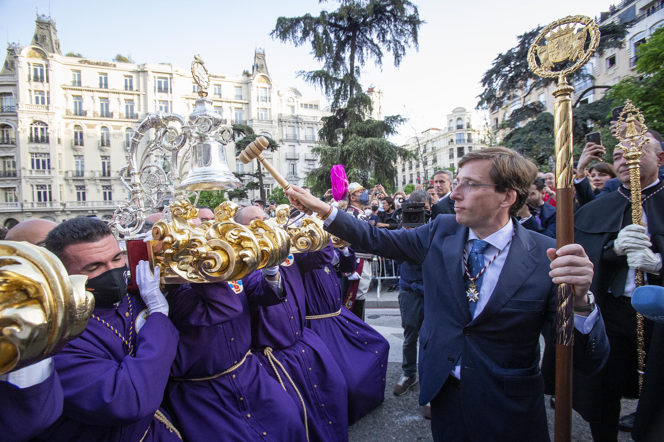 El alcalde de Madrid, José Luis Martínez-Almeida, ha asistido esta tarde, junto a la concejala delegada de Turismo, Almudena Maillo, a la procesión de Jesús de Medinaceli, una de las que congrega a mayor número de público en Viernes Santo, y a la altura de la plaza de las Cortes ha participado en la ‘levantá’ del paso del Cristo.