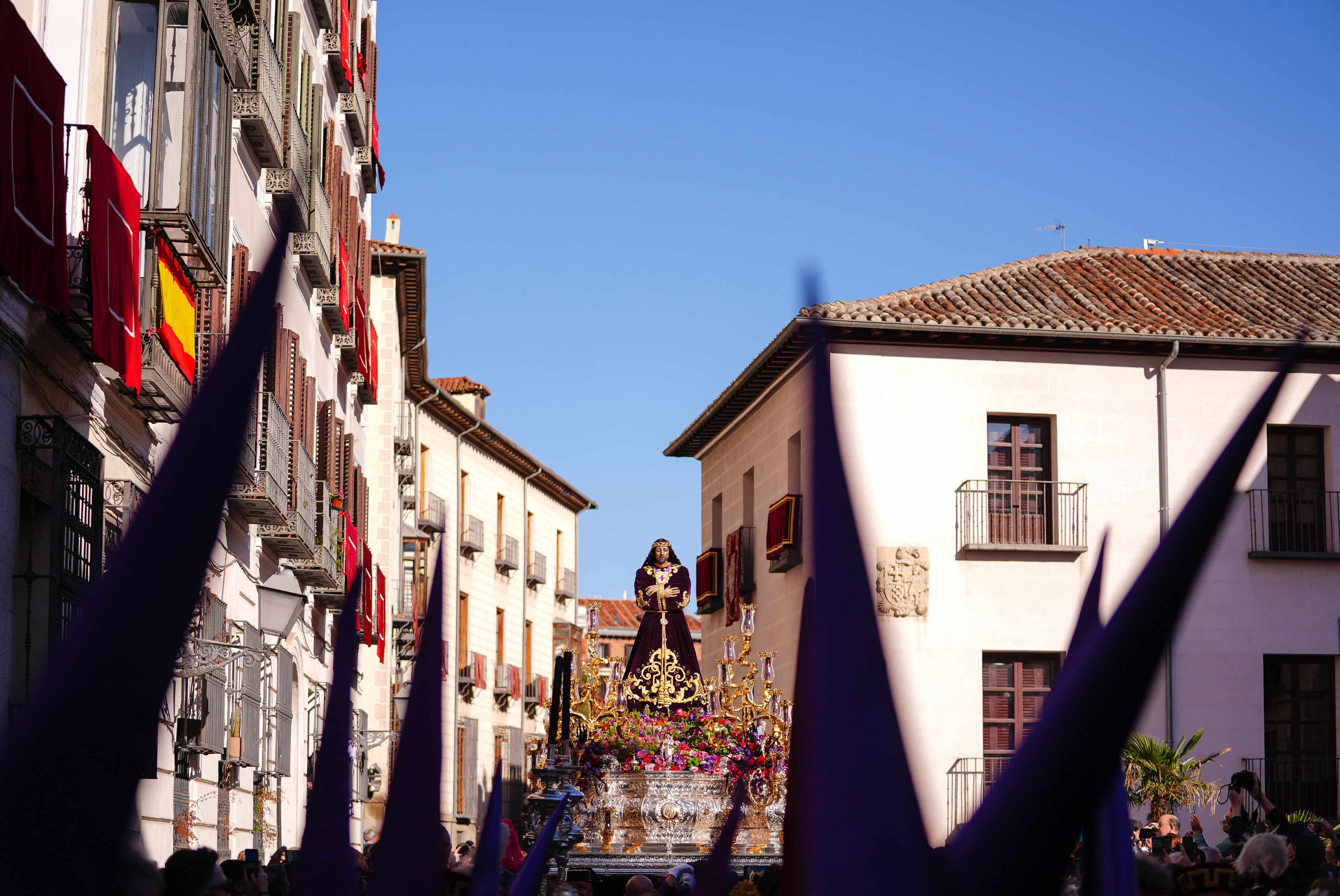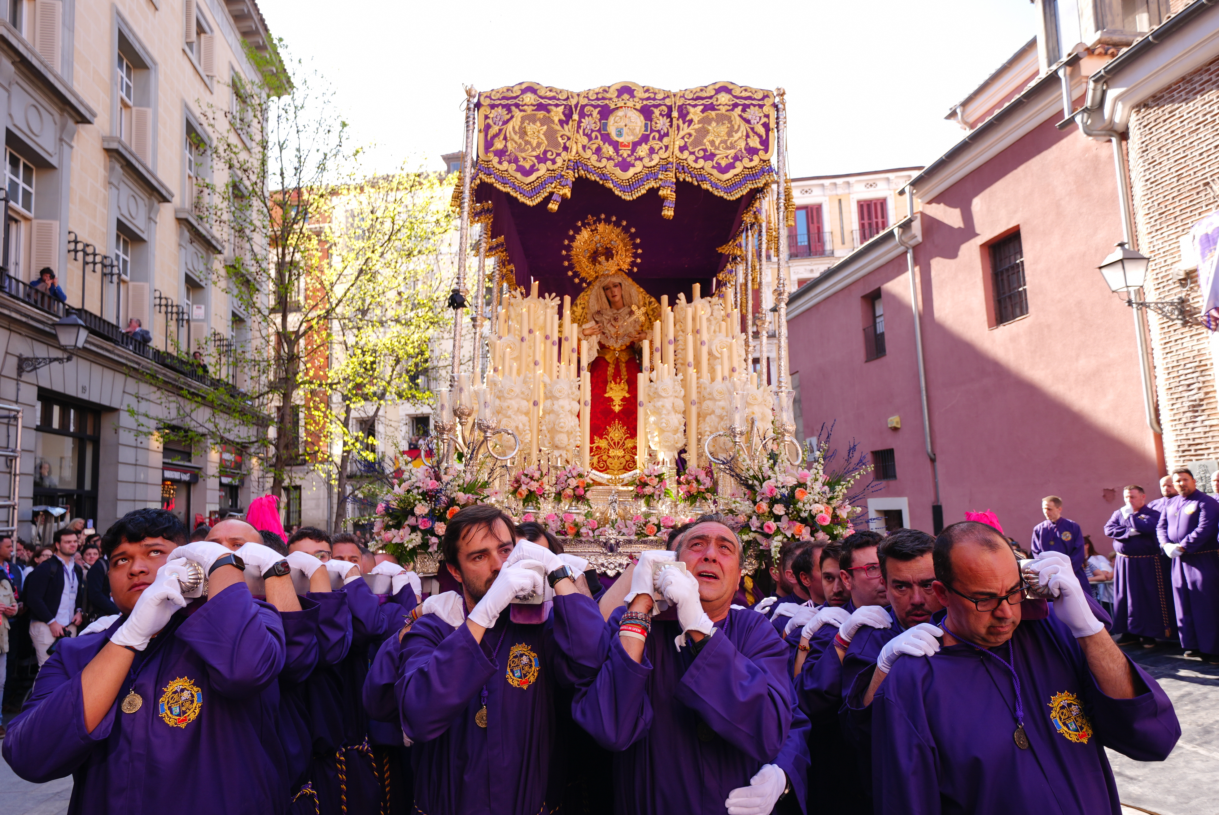 Fundada por cofrades sevillanos residentes en Madrid, esta hermandad mantiene una estrecha vinculación con la tradición andaluza y transcurre por algunas de las principales calles del centro. A lo largo de su recorrido, se han interpretado dos saetas: la primera, a cargo de Saray Muñoz, desde el Hotel Moderno, y la segunda, de Ismael de la Rosa, desde el balcón de la Real Casa de Correos. /