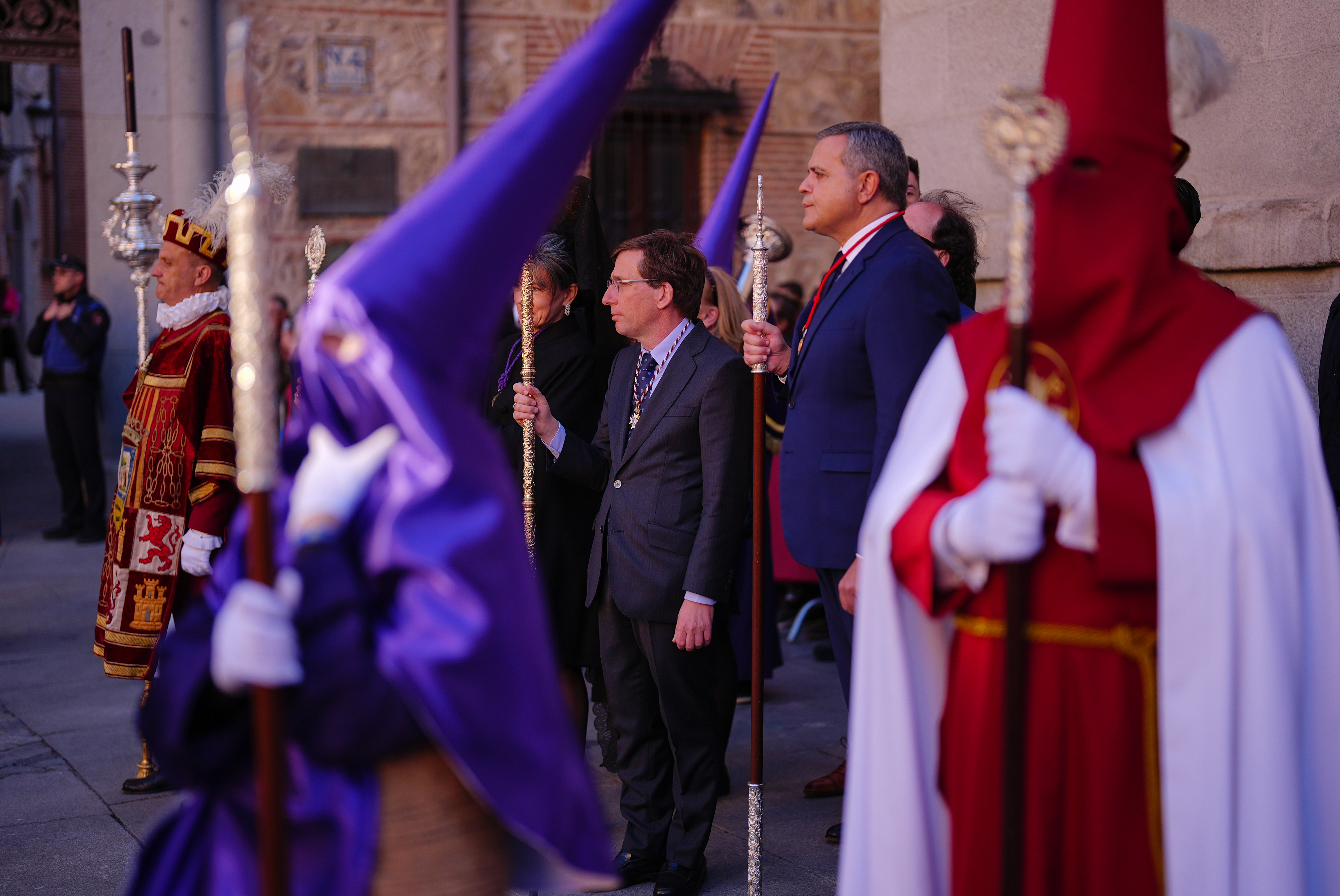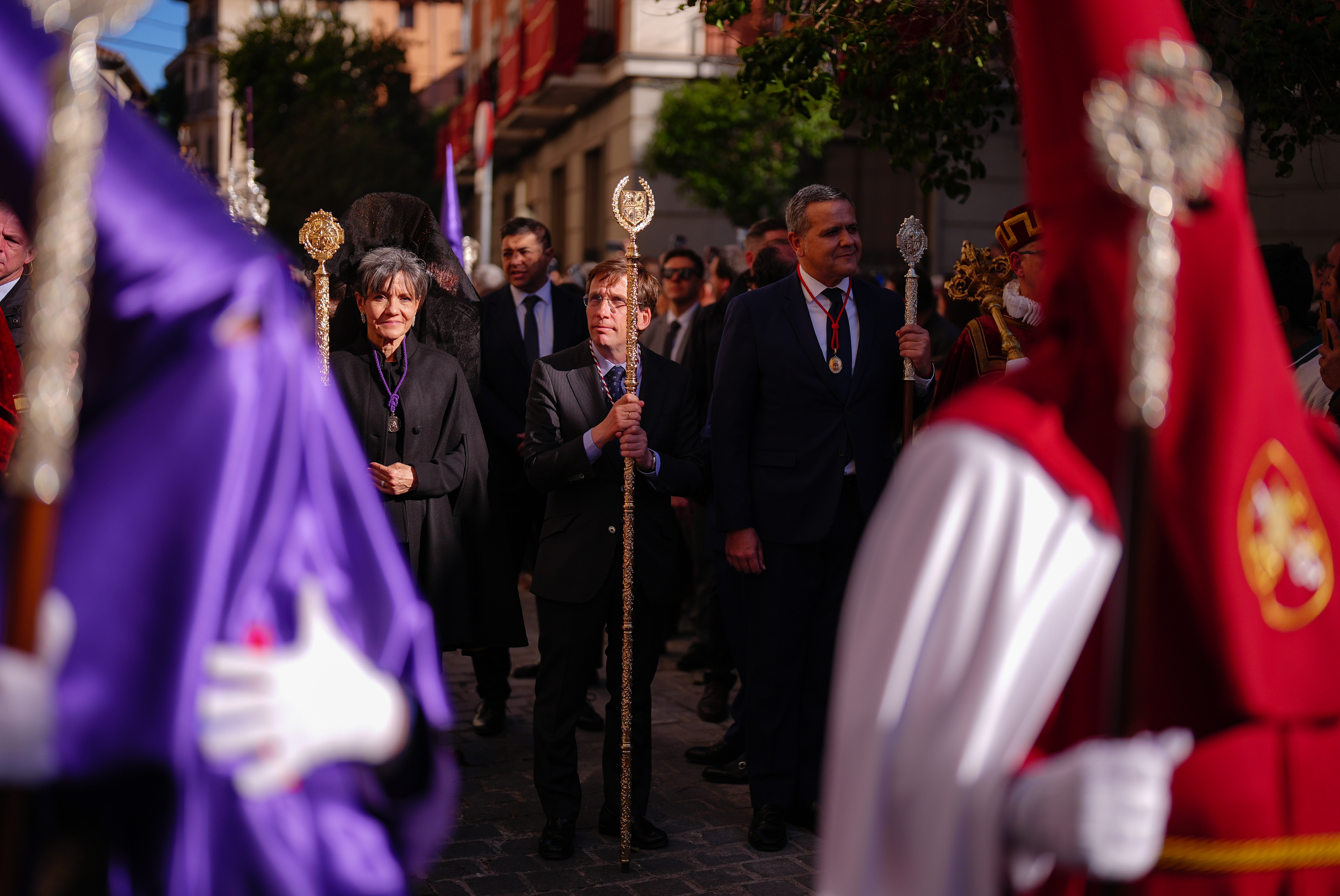 El alcalde de Madrid, José Luis Martínez-Almeida, acompañado del delegado de Políticas de Vivienda, Álvaro González; la concejala delegada de Turismo, Almudena Maíllo, y el concejal de Centro, Carlos Segura, ha participado este Jueves Santo en la procesión de Nuestro Padre Jesús Nazareno ‘El Pobre’ y María Santísima del Dulce Nombre en su Soledad, en una jornada en la que distintas cofradías transitan por las calles del centro de la ciudad.