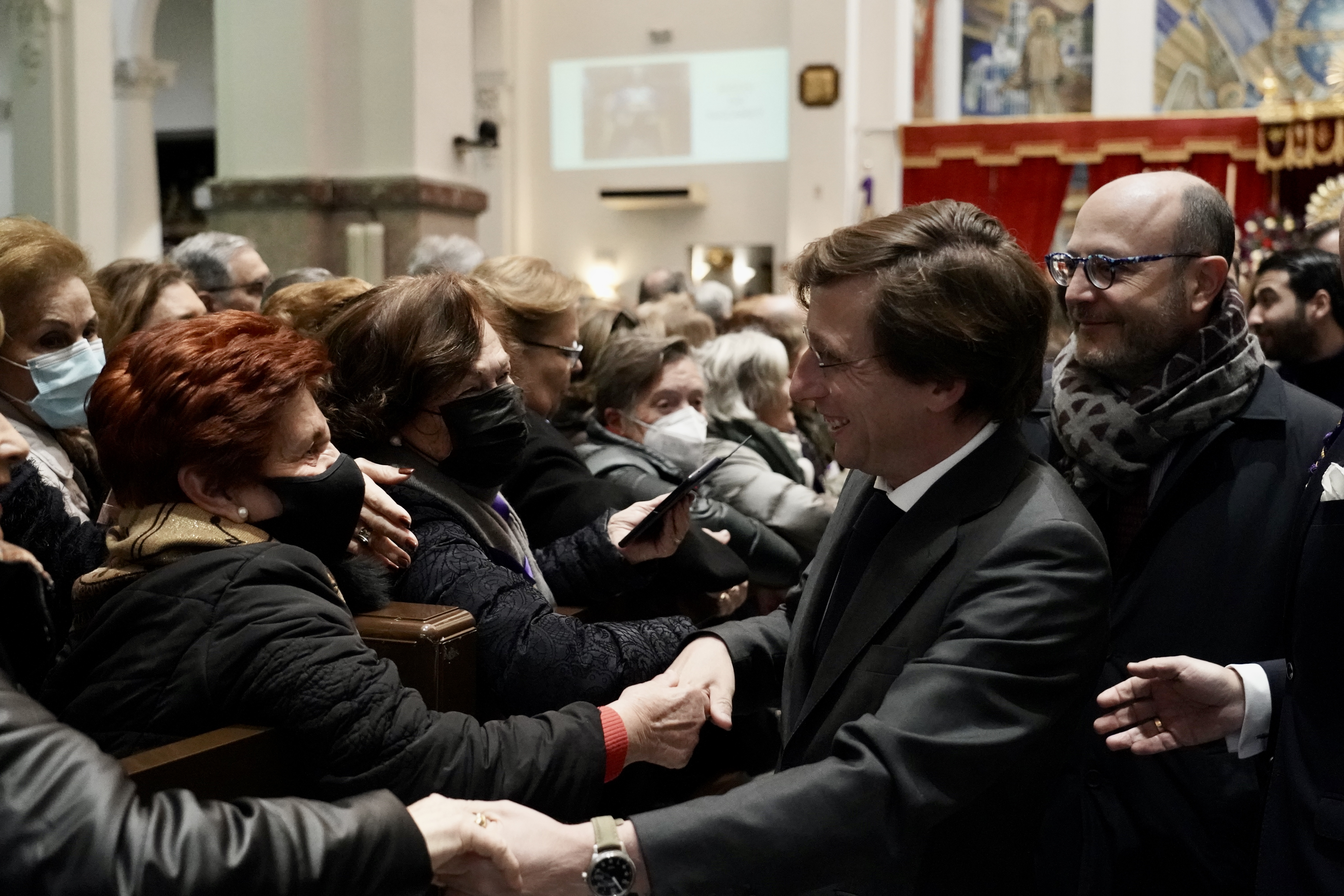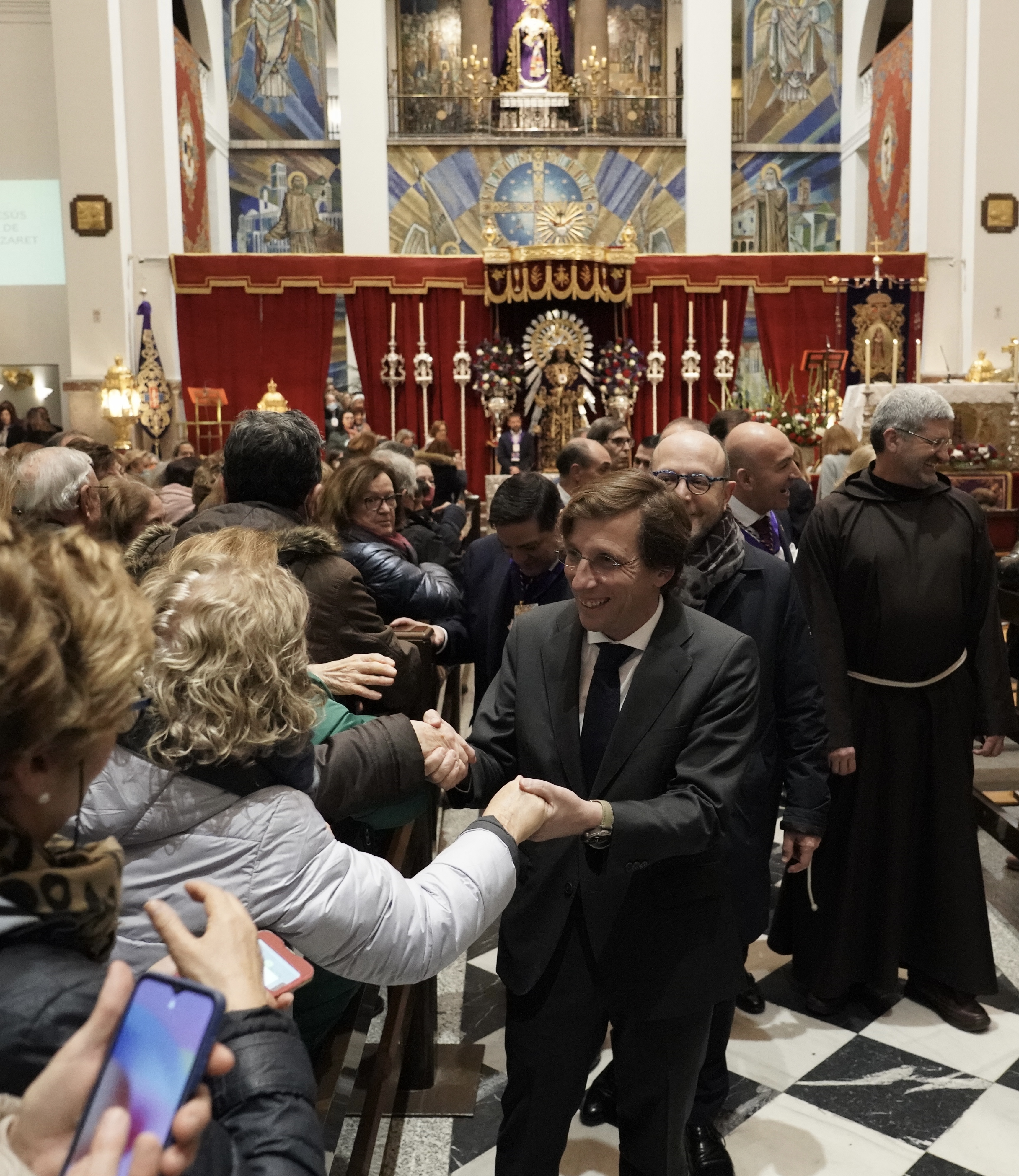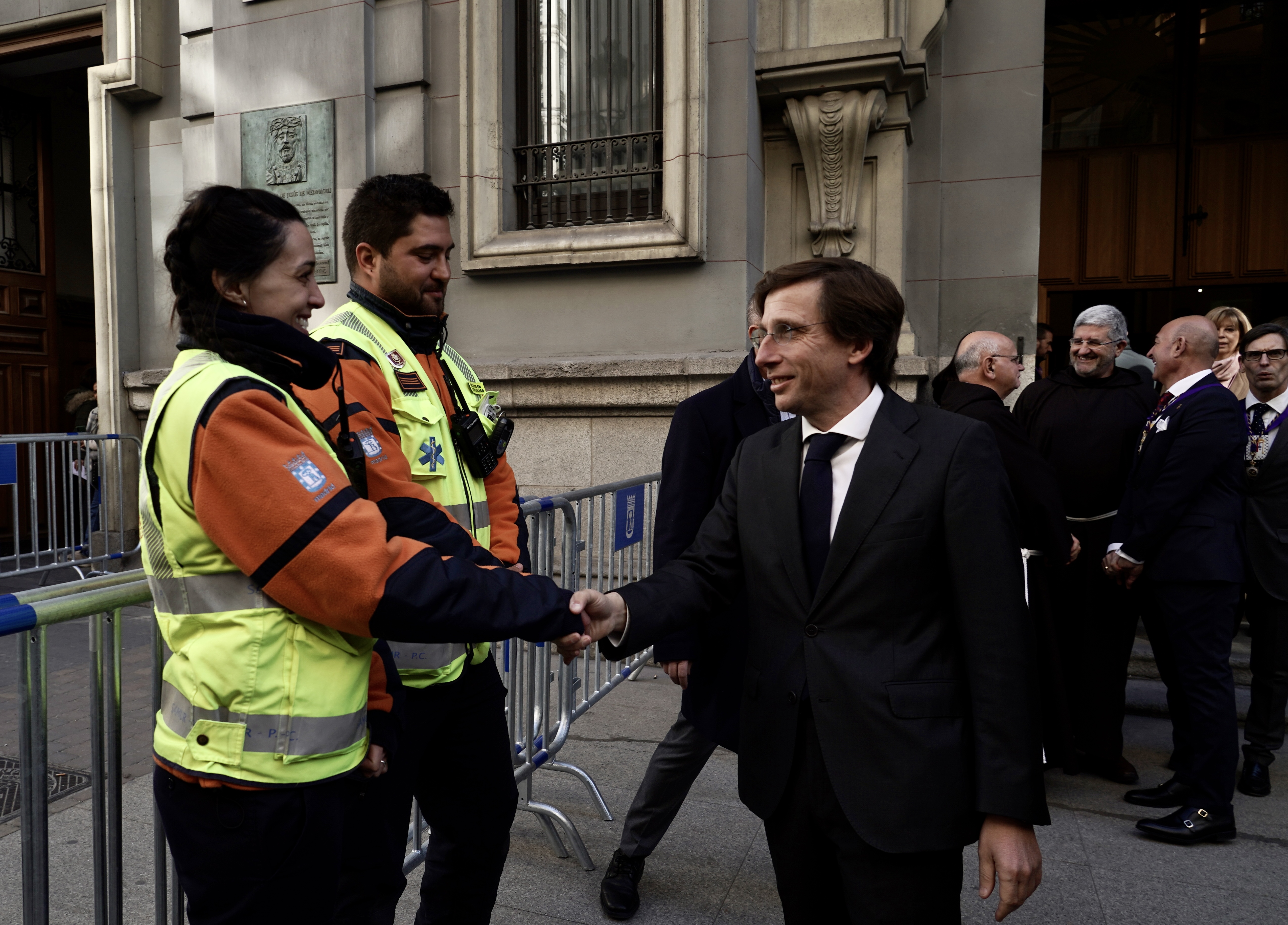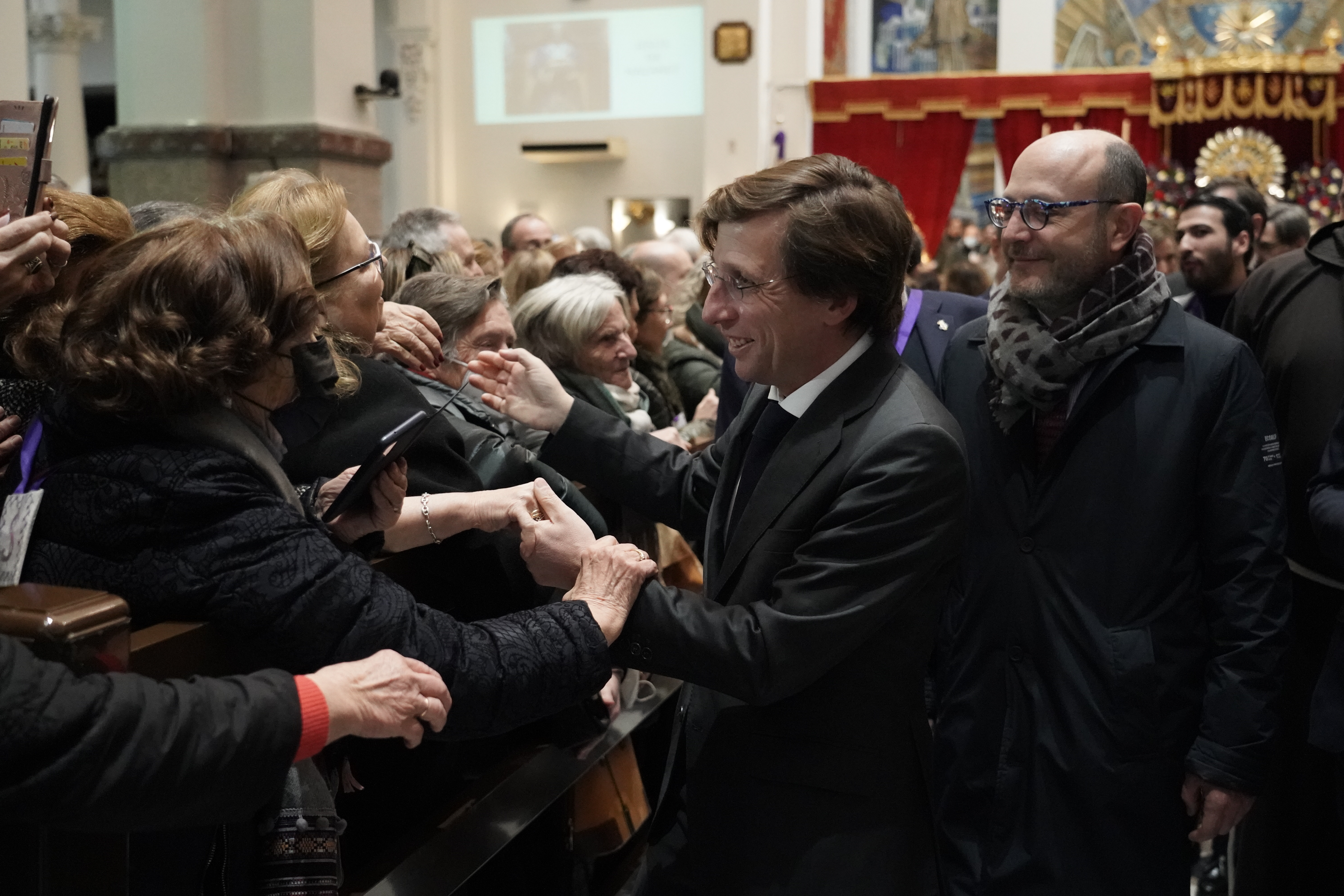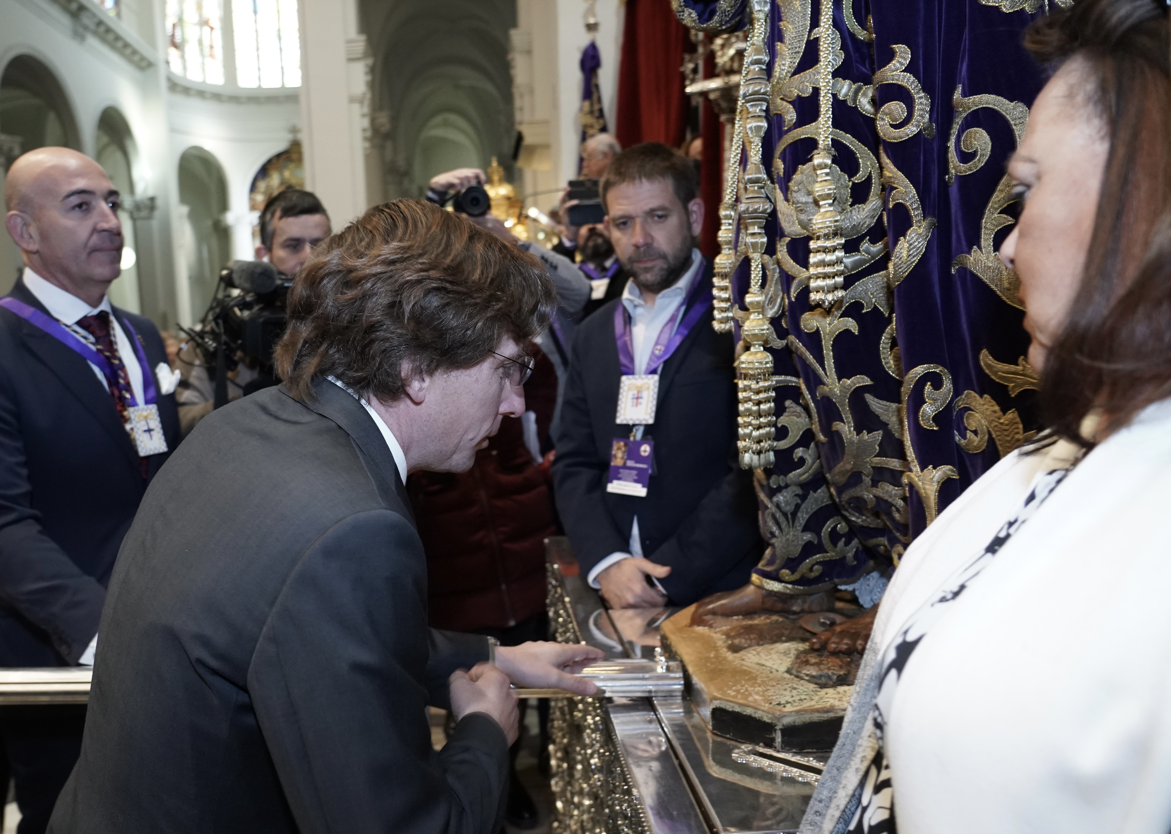 El acalde de Madrid, José Luis Martínez-Almeida, acompañado del concejal del distrito de Centro, José Fernández, ha visitado hoy la Basílica de Jesús de Medinaceli con motivo del tradicional besapiés a la imagen del Cristo en el que miles de madrileños y de visitantes de otros lugares participan cada año el primer viernes del mes de marzo.