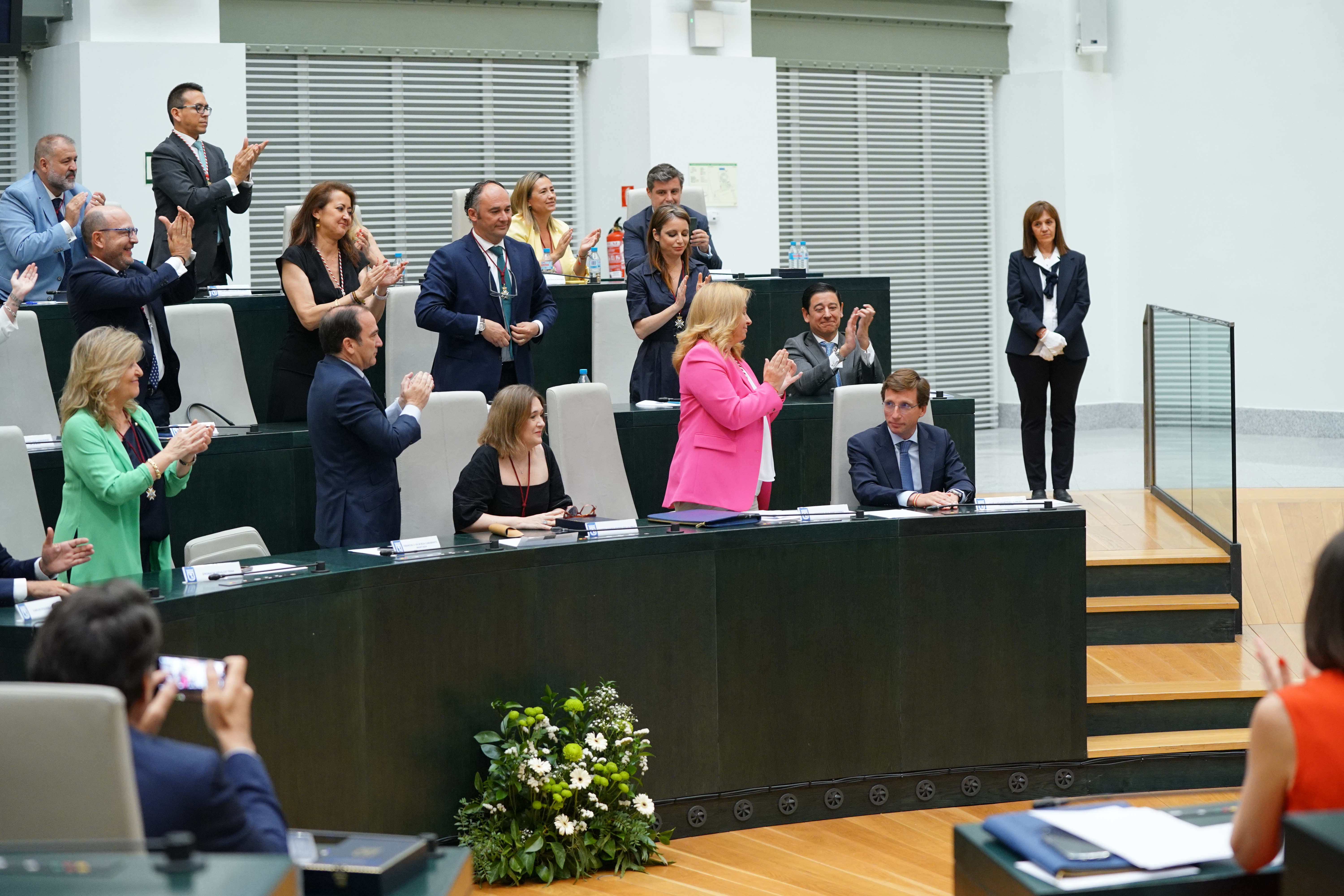 El Pleno Municipal de investidura ha comenzado con la constitución de la Mesa de Edad a cargo del edil electo de mayor edad, Félix López-Rey (74 años), de Más Madrid, y el más joven, Antonio Giraldo (30 años), del PSOE.