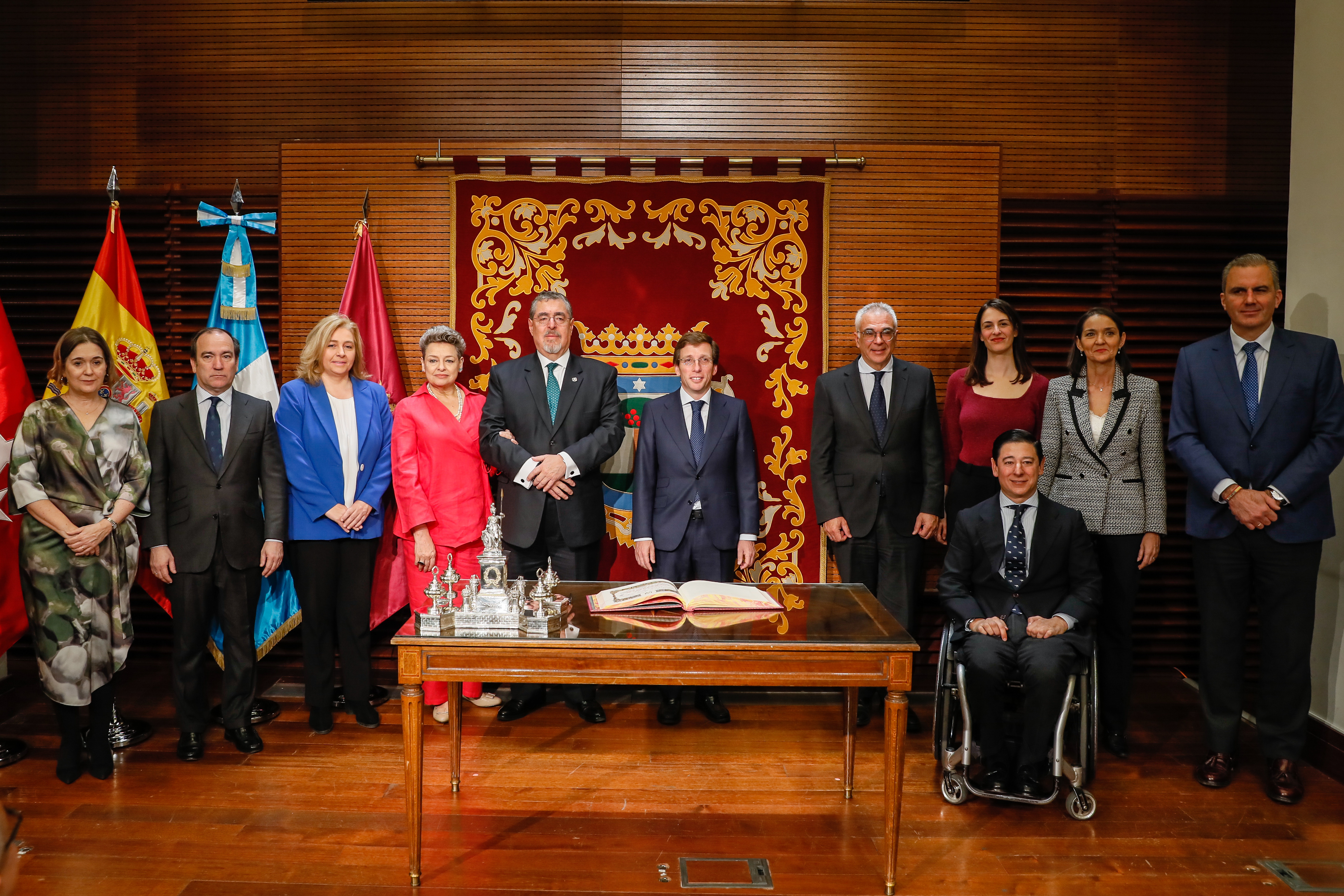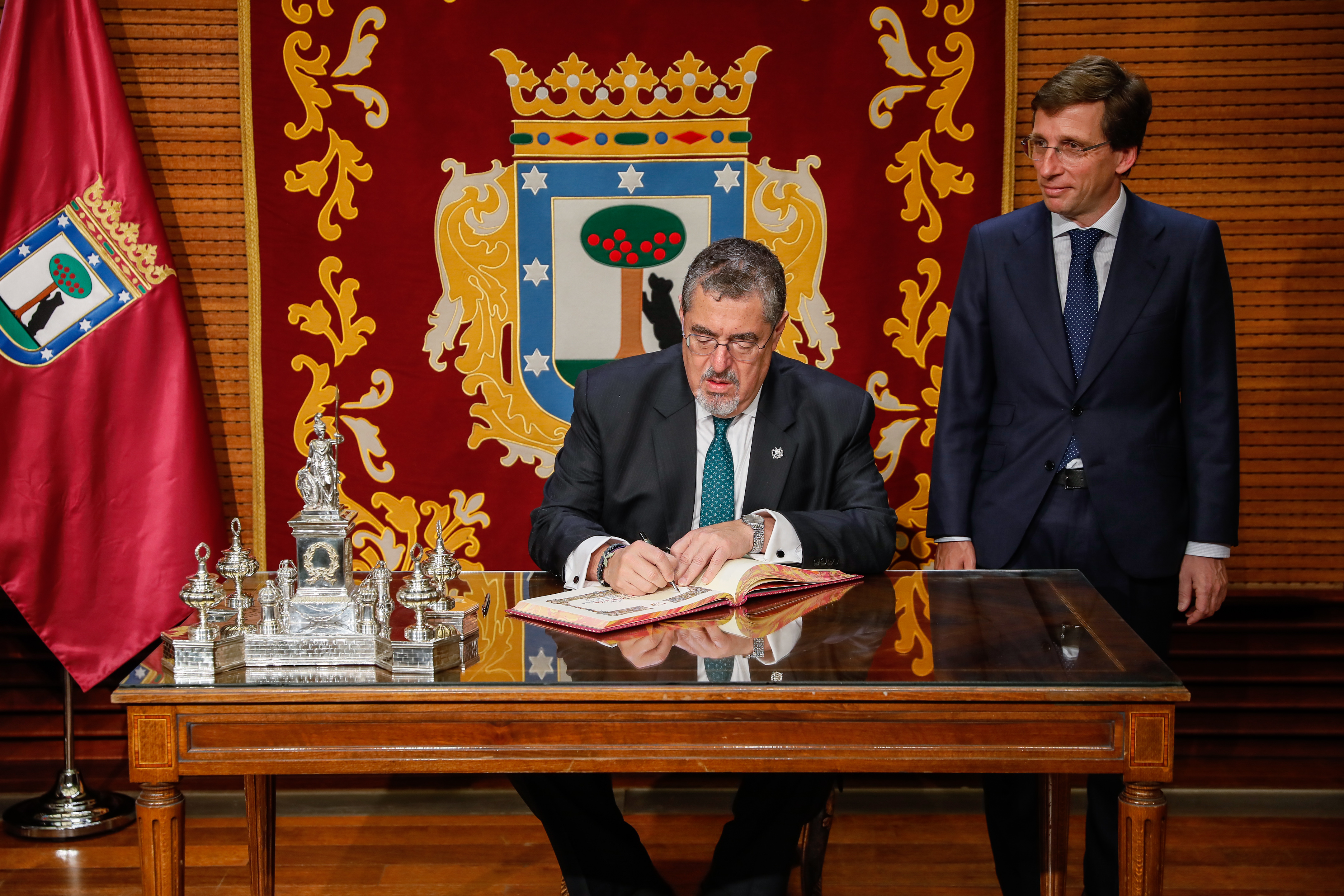 Durante la recepción, en la que también ha estado presente la vicealcaldesa, Inma Sanz, y otros miembros del equipo de Gobierno junto a representantes de los grupos municipales, el presidente guatemalteco ha firmado en el Libro de Oro del Ayuntamiento de Madrid.
