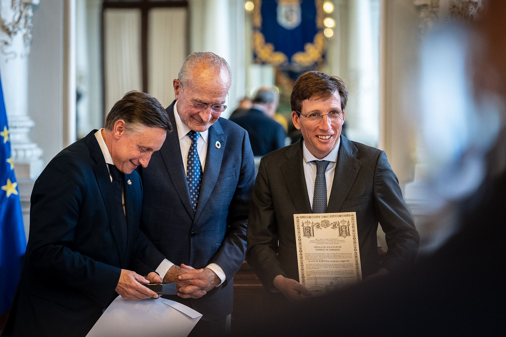 El alcalde de Madrid, José Luis Martínez-Almeida, ha acompañado hoy a la Hermandad y Cofradía de Nazarenos de Nuestro Padre Jesús de la Puente del Cedrón y María Santísima de la Paloma de Málaga en los actos organizados con motivo de su salida procesional, en el marco de la Semana Santa. Durante la jornada, Almeida ha realizado una visita institucional al Ayuntamiento de Málaga, donde ha saludado a los miembros de la cofradía y ha puesto en valor el "hermanamiento desde 1944” entre ambas ciudades, destacando los vínculos institucionales y culturales en una celebración que forma parte del patrimonio compartido.