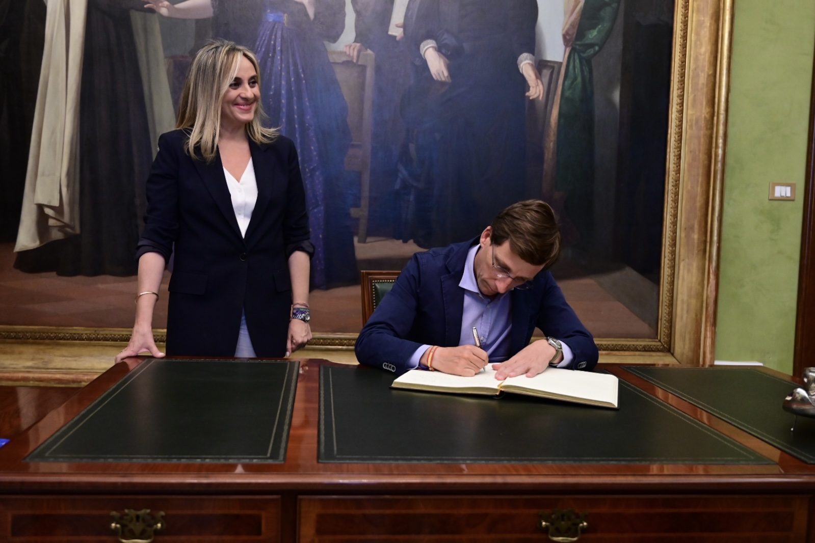 El alcalde de Madrid, José Luis Martinez-Almeida, ha visitado esta mañana el Ayuntamiento de Granada, donde ha sido recibido por la alcaldesa, Marifrán Carazo. Almeida, acompañado por la concejala del distrito de Salamanca, Cayetana Hernández de la Riva, ha firmado en el Libro de Honor de la Ciudad.