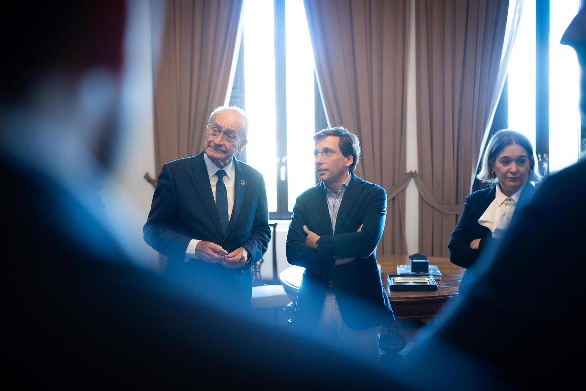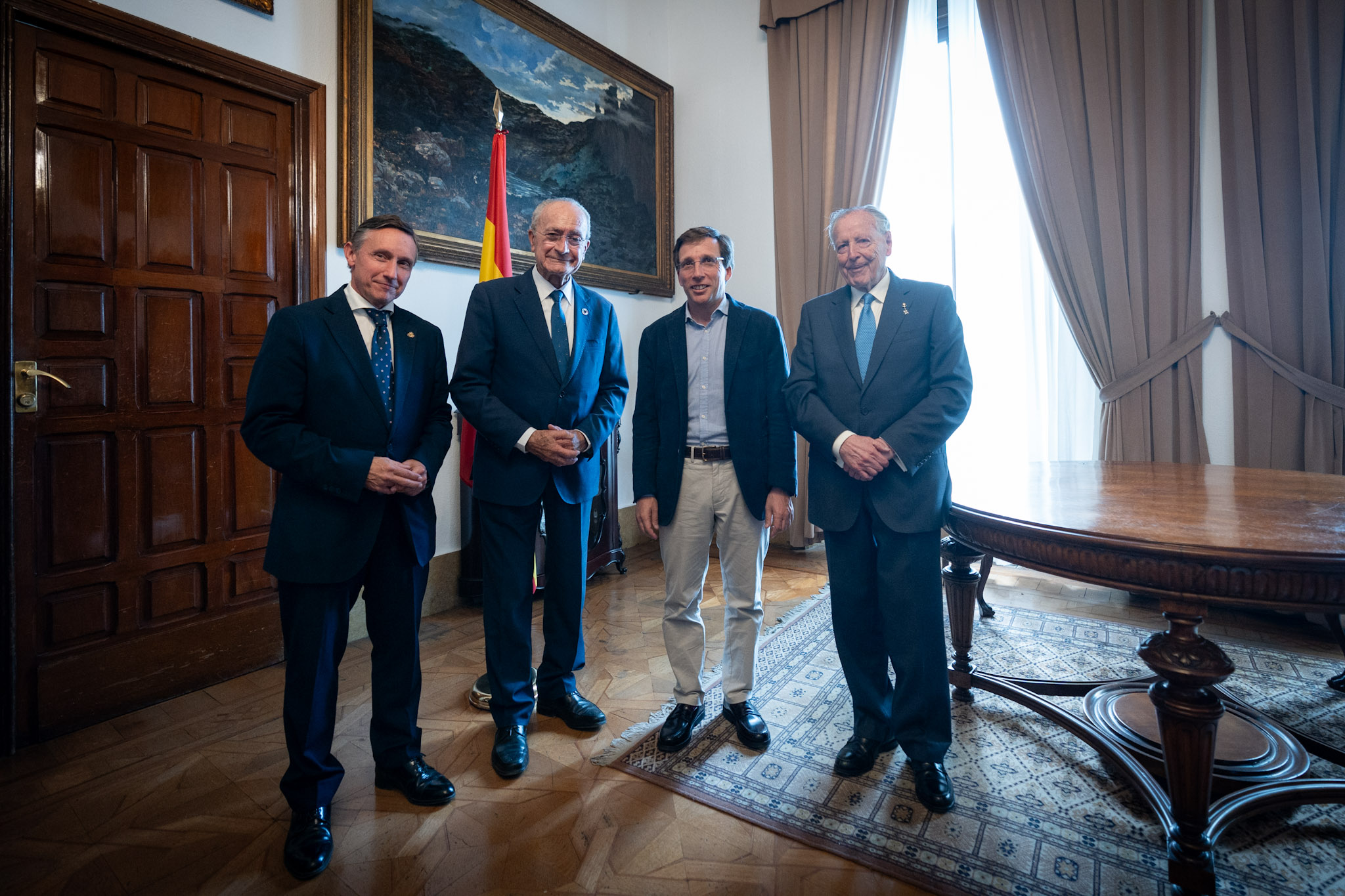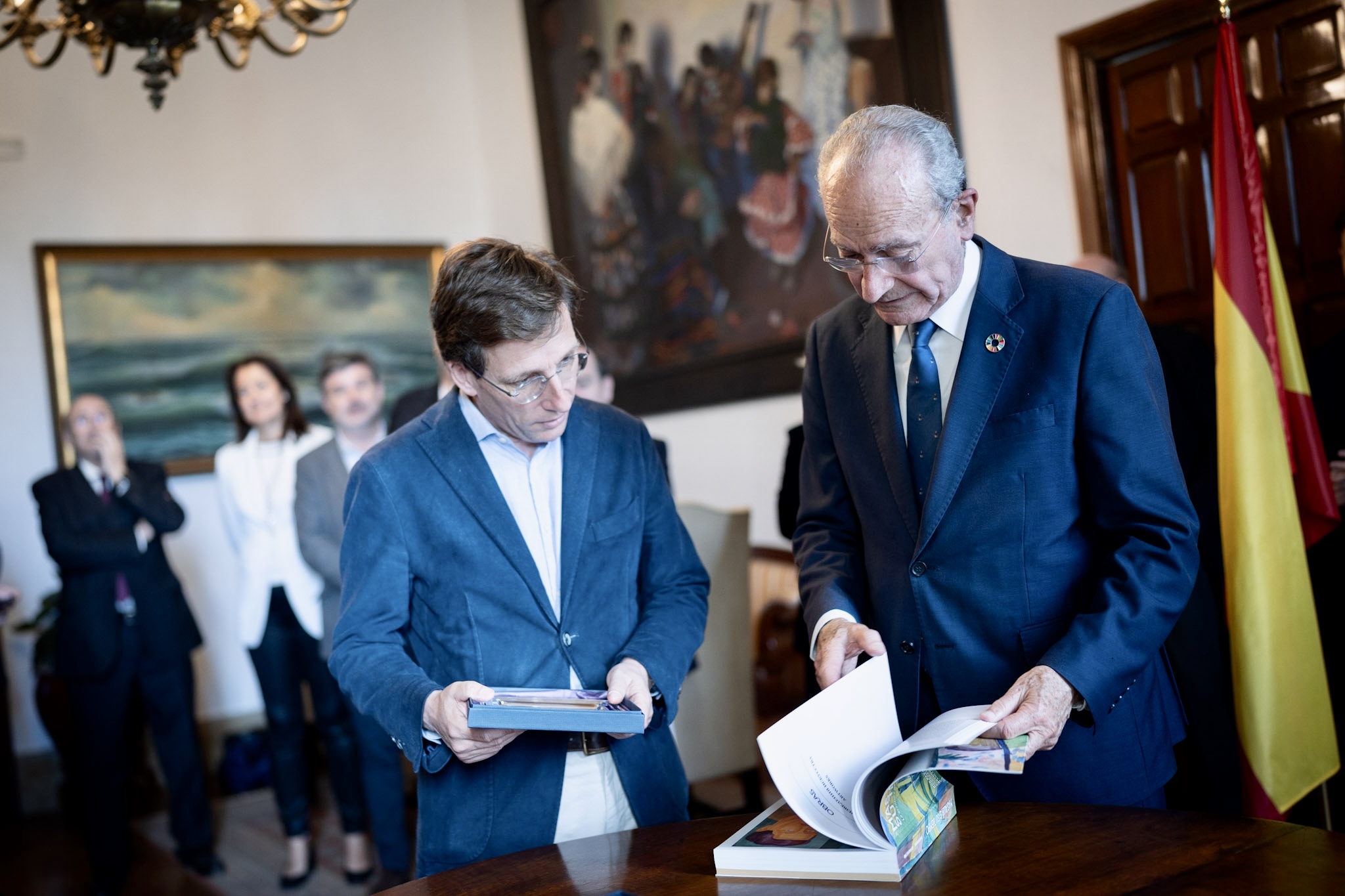 El alcalde de Madrid, José Luis Martínez-Almeida, acompañado por una delegación de concejales del equipo de Gobierno, ha visitado esta mañana el Ayuntamiento de Málaga, donde ha sido recibido por su homólogo, Francisco de la Torre, y ha mantenido un encuentro con miembros de la Hermandad de la Puente y la Paloma.