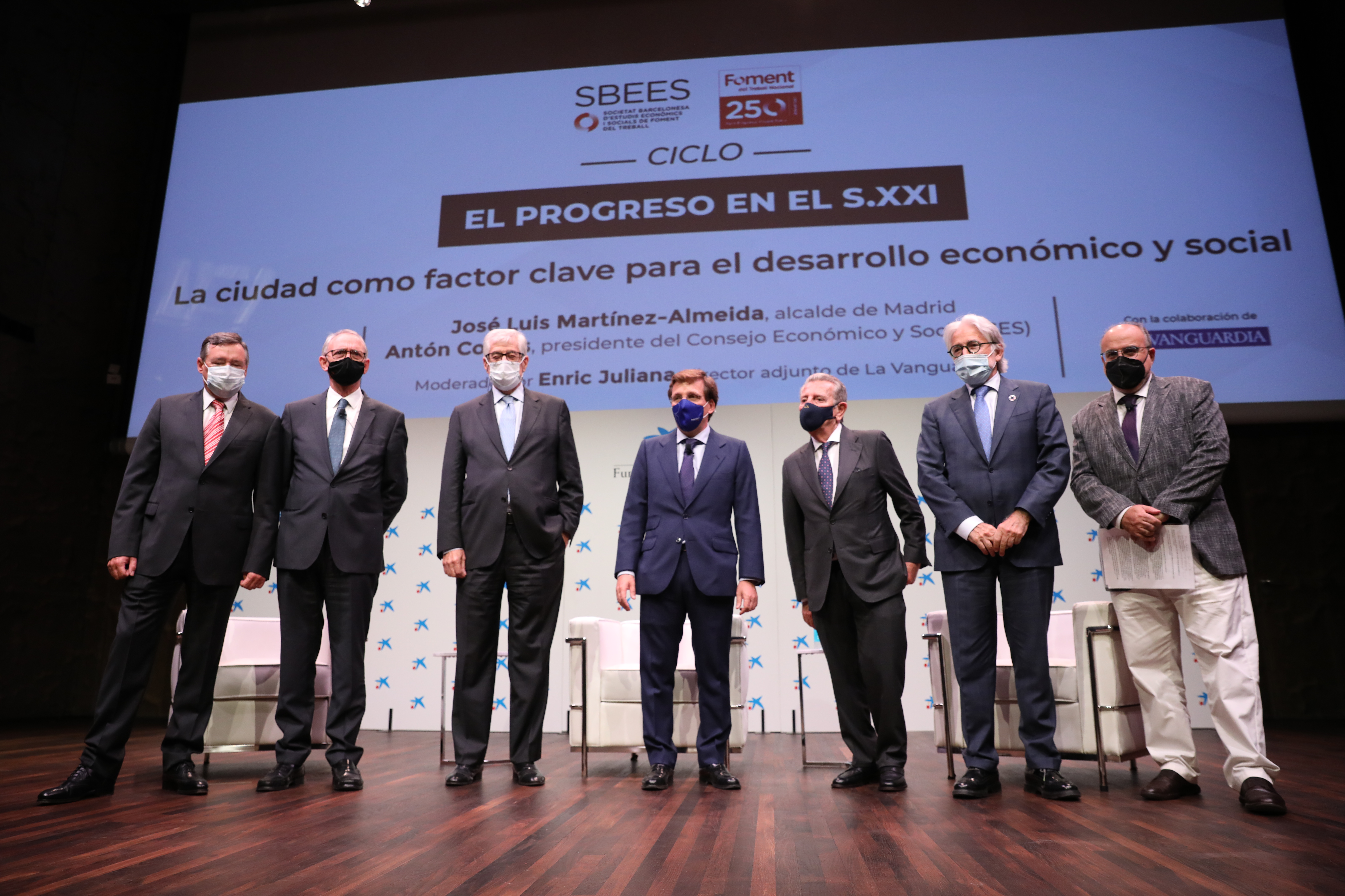 El alcalde de Madrid, José Luis Martínez-Almeida, ha participado este mediodía en el diálogo ‘La ciudad como factor clave para el desarrollo económico y social’ enmarcado en el ciclo de conferencias ‘El progreso en el siglo XXI’, impulsado por la Sociedad Barcelonesa de Estudios Económicos y Sociales de Foment del Treball. En el acto, celebrado en CaixaForum, ha participado también el presidente del Consejo Económico y Social (CES), Antón Costas.