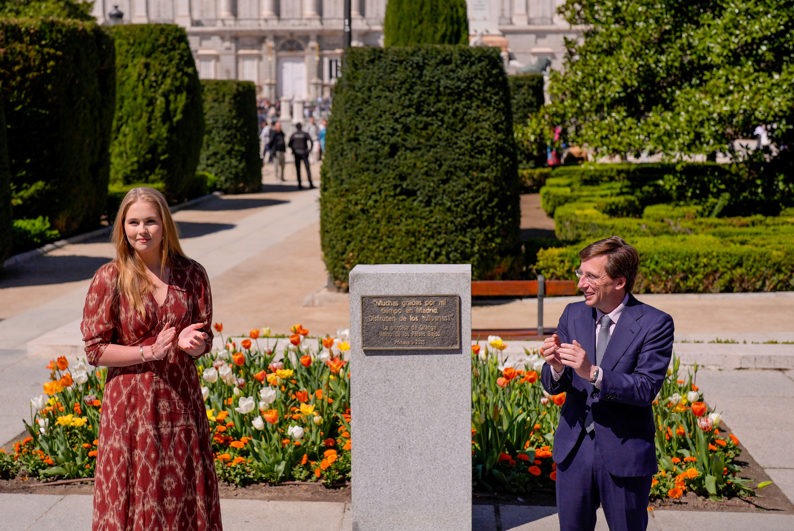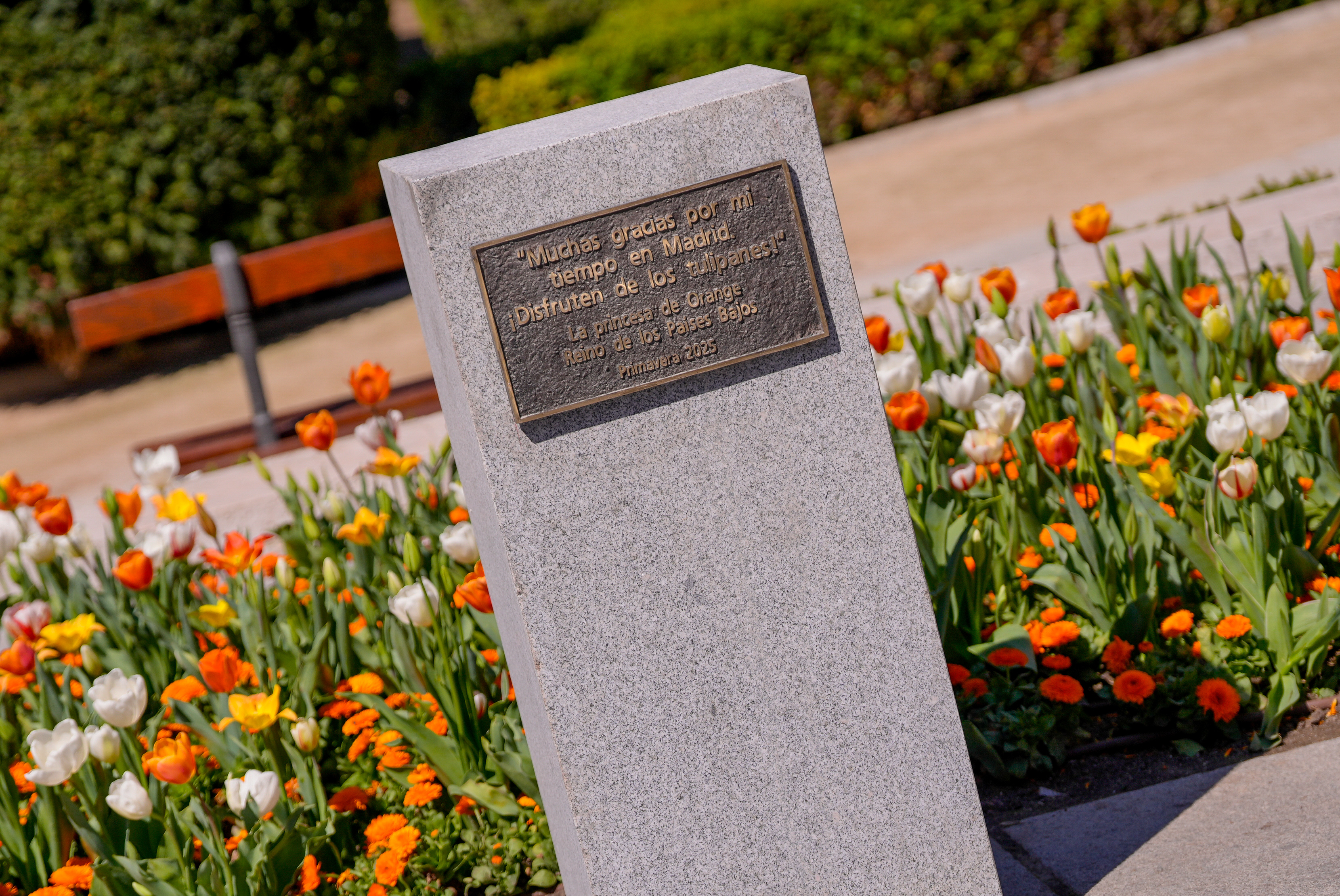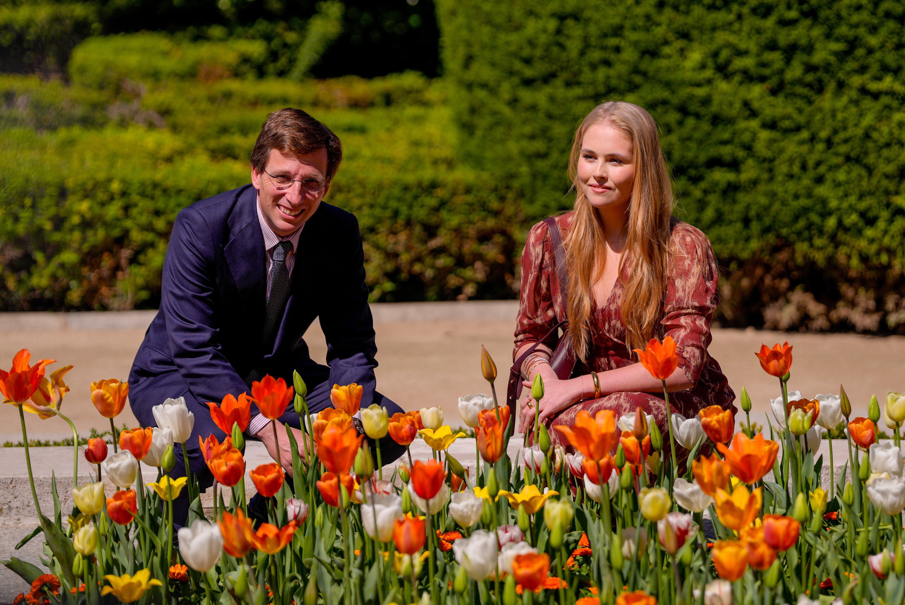 El alcalde de Madrid, José Luis Martínez-Almeida, junto a la princesa Amalia de Orange, ha descubierto hoy una placa de agradecimiento por parte de la heredera al trono de Países Bajos por su “tiempo en Madrid”, en el jardín de tulipanes de la plaza de Oriente. La princesa donó estos ejemplares a la ciudad como muestra de gratitud hacia la capital y sus vecinos por la acogida que le brindaron durante el periodo en el que desarrolló sus estudios en la Universidad de Ámsterdam desde Madrid debido a circunstancias especiales.