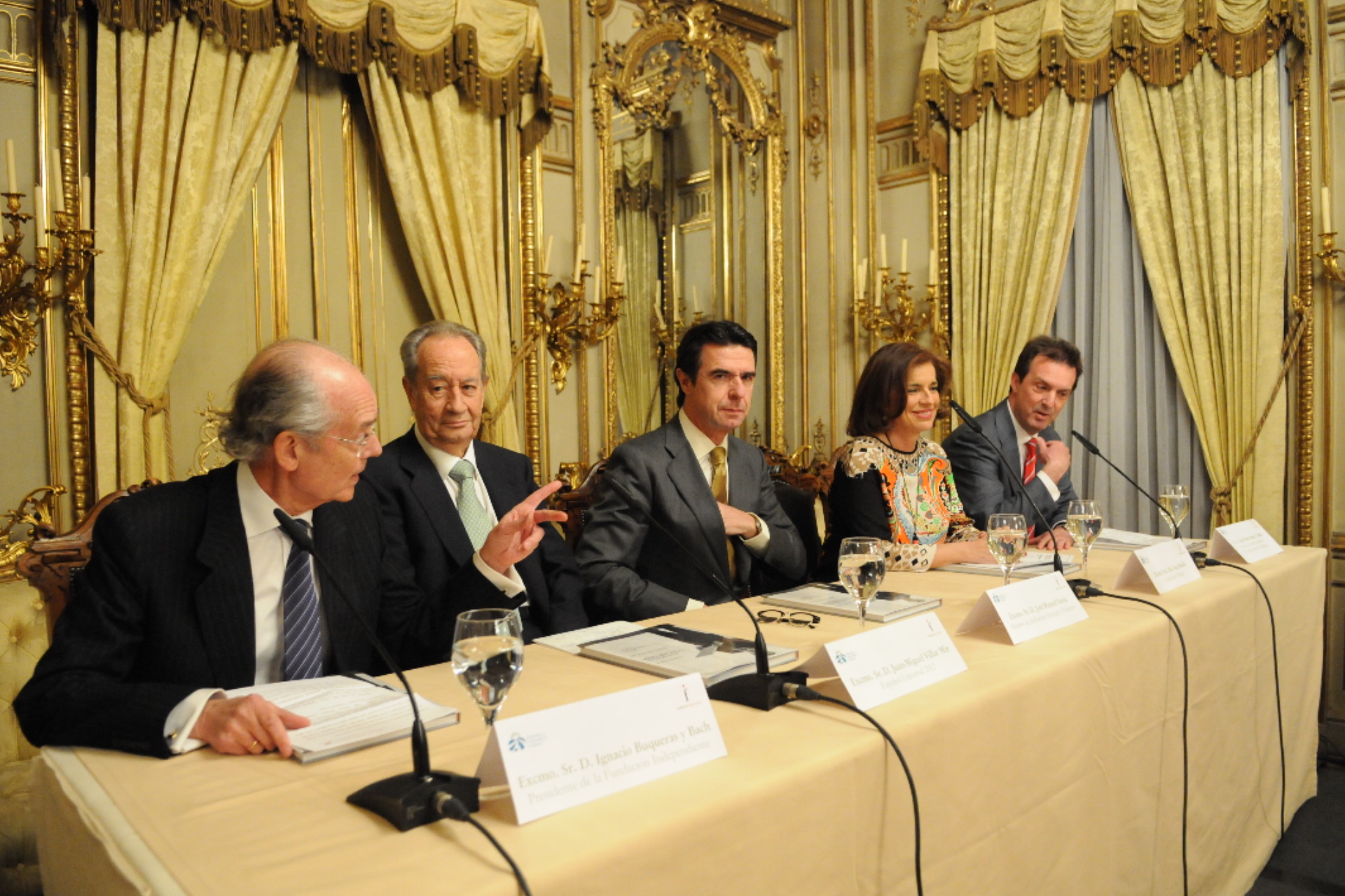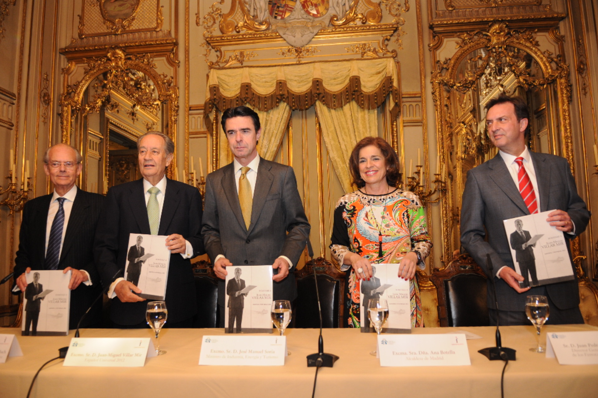 La alcaldesa de Madrid, Ana Botella, ha asistido hoy a la presentación de un libro dedicado a Juan Miguel Villar Mir y al homenaje internacional del que ha sido objeto al ser nombrado “español universal” por la Fundación Independiente. Villar Mir, presidente de OHL, dirige un grupo de compañías que operan en cerca de treinta países de los cinco continentes. Doctor en Ingeniería de Caminos, Canales y Puertos, por la Universidad Politécnica de Madrid; licenciado en Derecho por la Universidad Complutense, es también diplomado en Organización Industrial y por el Economic Development Institute de Washington D.C. La Fundación Independiente distingue cada año a un español, destacado por su trayectoria profesional y personal a nivel internacional. El título ha sido concedido en ediciones anteriores a Camilo José Cela, Plácido Domingo, Rafa Nadal, Valentín Fuster, Vicente Ferrer, Federico Mayor Zaragoza, Pedro Duque, Miguel Induráin y Julio Iglesias. /