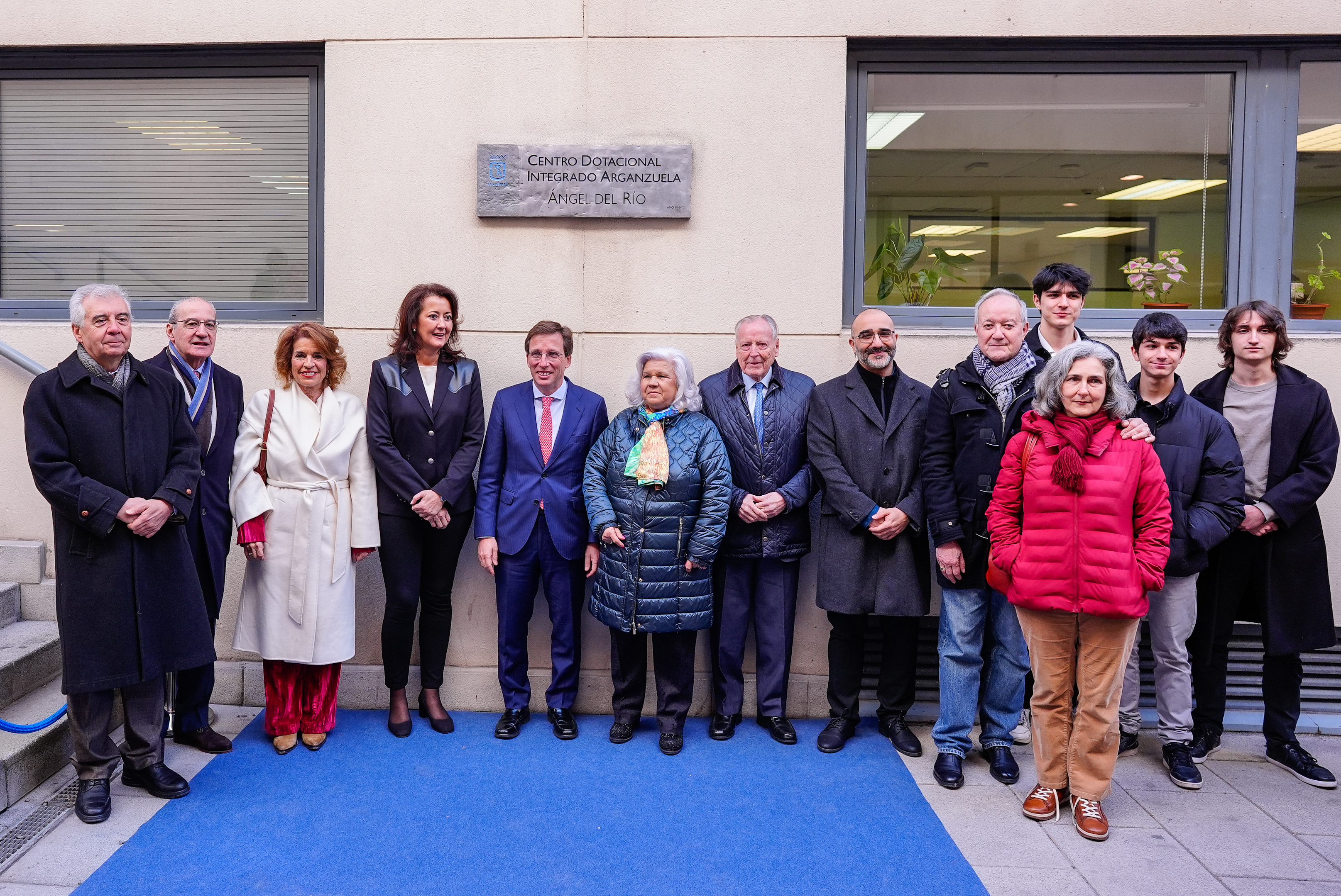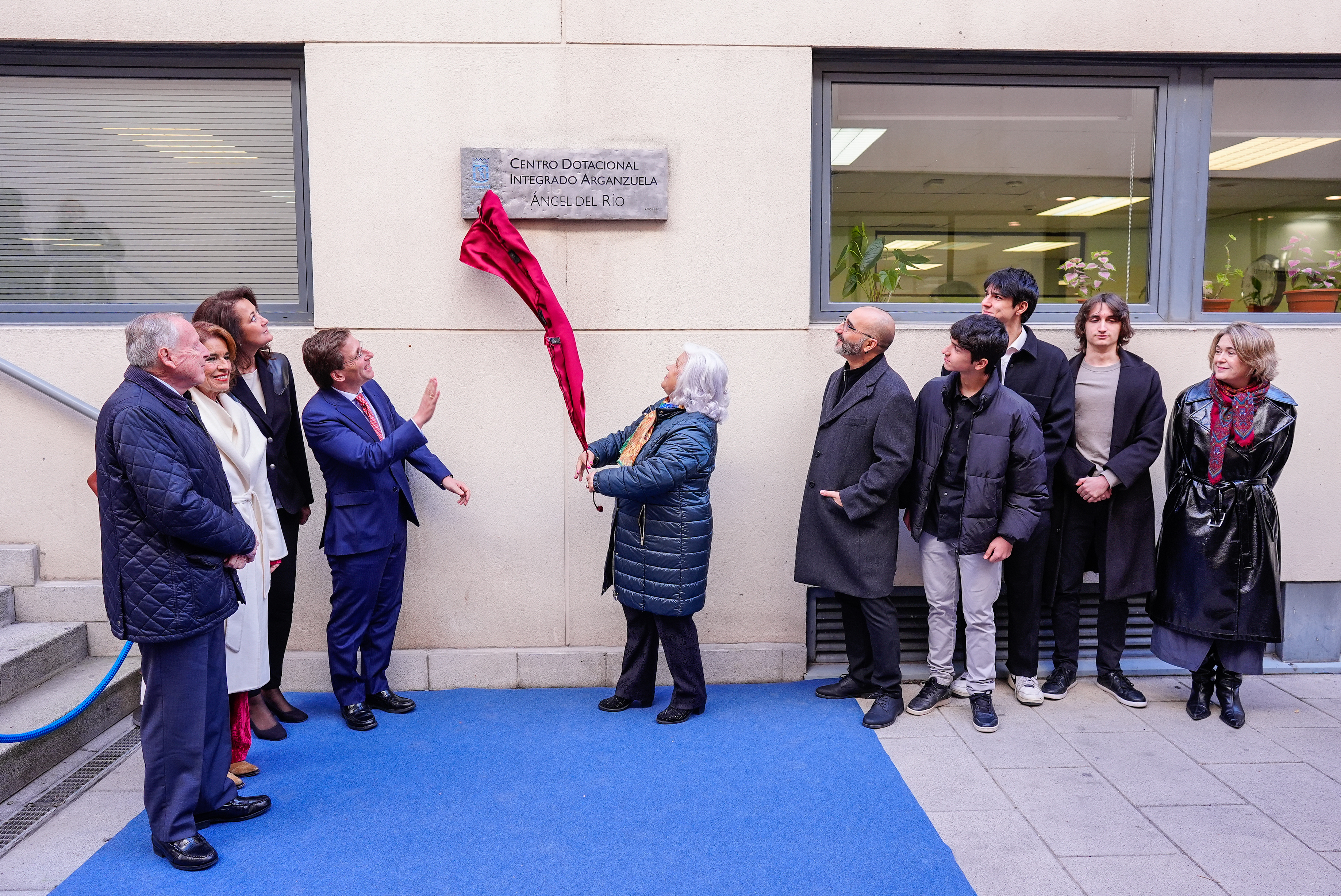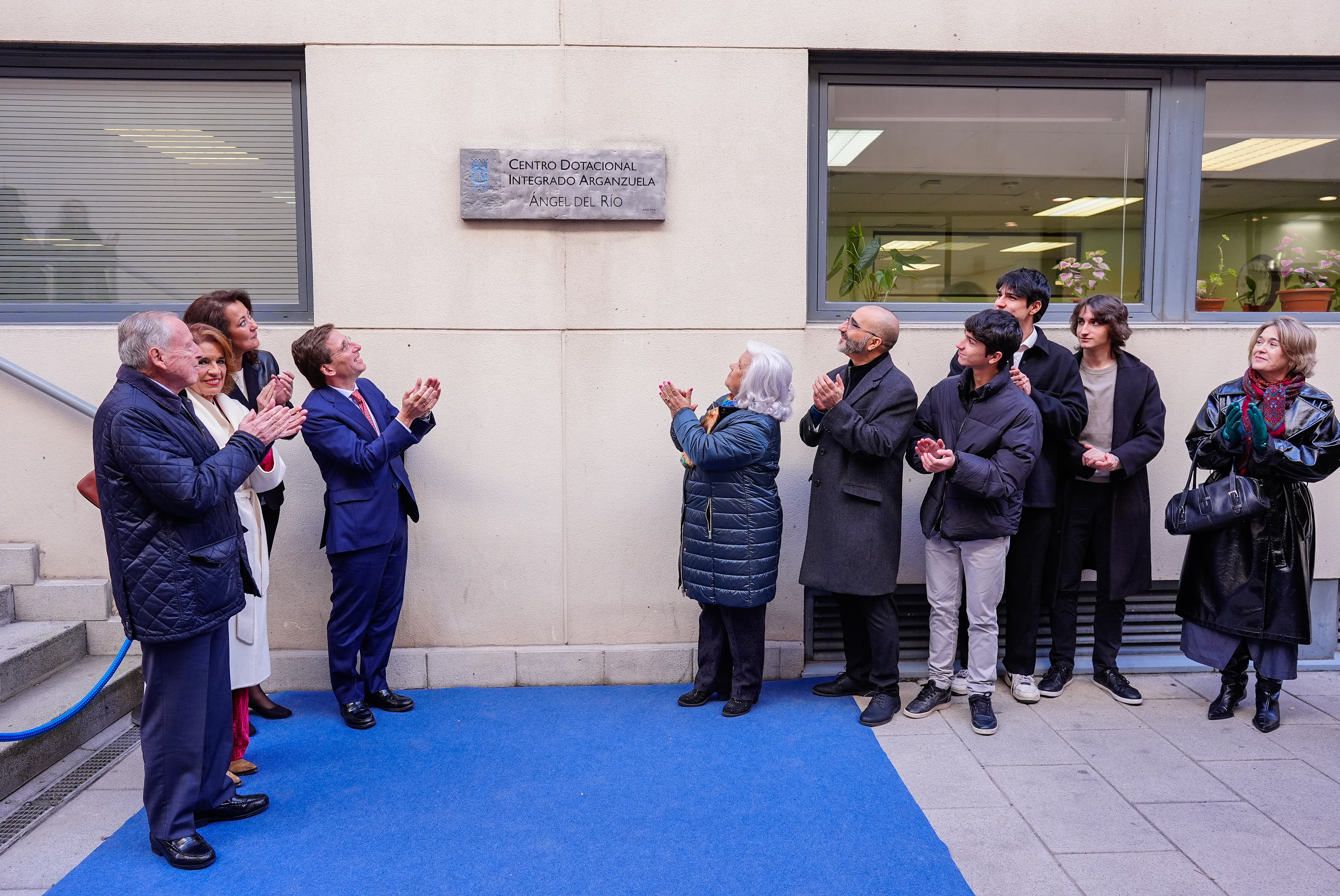 El alcalde de Madrid, José Luis Martínez-Almeida, acompañado por la concejala de Arganzuela, Lola Navarro; el decano del Cuerpo de Cronistas de la Villa, Pedro Montoliú, familiares y compañeros de profesión del periodista Ángel del Río, ha descubierto esta mañana la placa con la nueva denominación del centro dotacional integrado del distrito, dedicado a Ángel del Río, cronista de la villa y uno de los periodistas más vinculados a la información de la ciudad en las últimas décadas, fallecido en febrero de 2022.