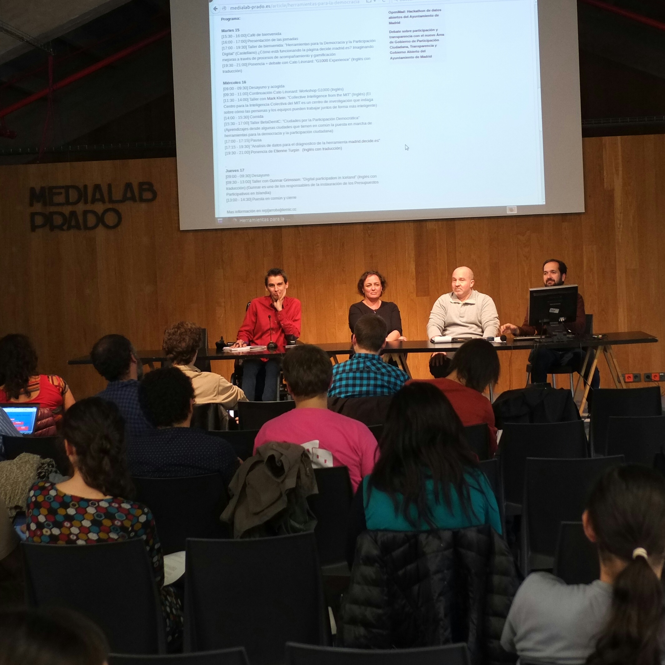 Estas jornadas han sido organizadas en el marco de la colaboración de Medialab-Prado con el Área de Gobierno de Participación Ciudadana, Transparencia y Gobierno Abierto del Ayuntamiento de Madrid, para la exploración de nuevas herramientas para la participación digital y la democracia deliberativa./