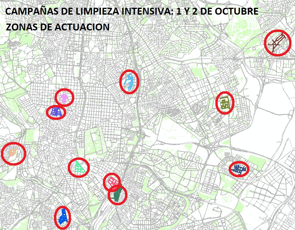 Distintos barrios de los distritos de Centro, Chamberí, Arganzuela, Salamanca, Retiro, Latina, San Blas, Barajas, Puente de Vallecas, Vicálvaro y Usera se beneficiarán de las actuaciones entre el 1 y el 4 de octubre. La superficie total de estas primeras once actuaciones cubrirá un área  total de 520.000 metros cuadrados. El plan continuará el lunes 5 con otra planificación a siete días.