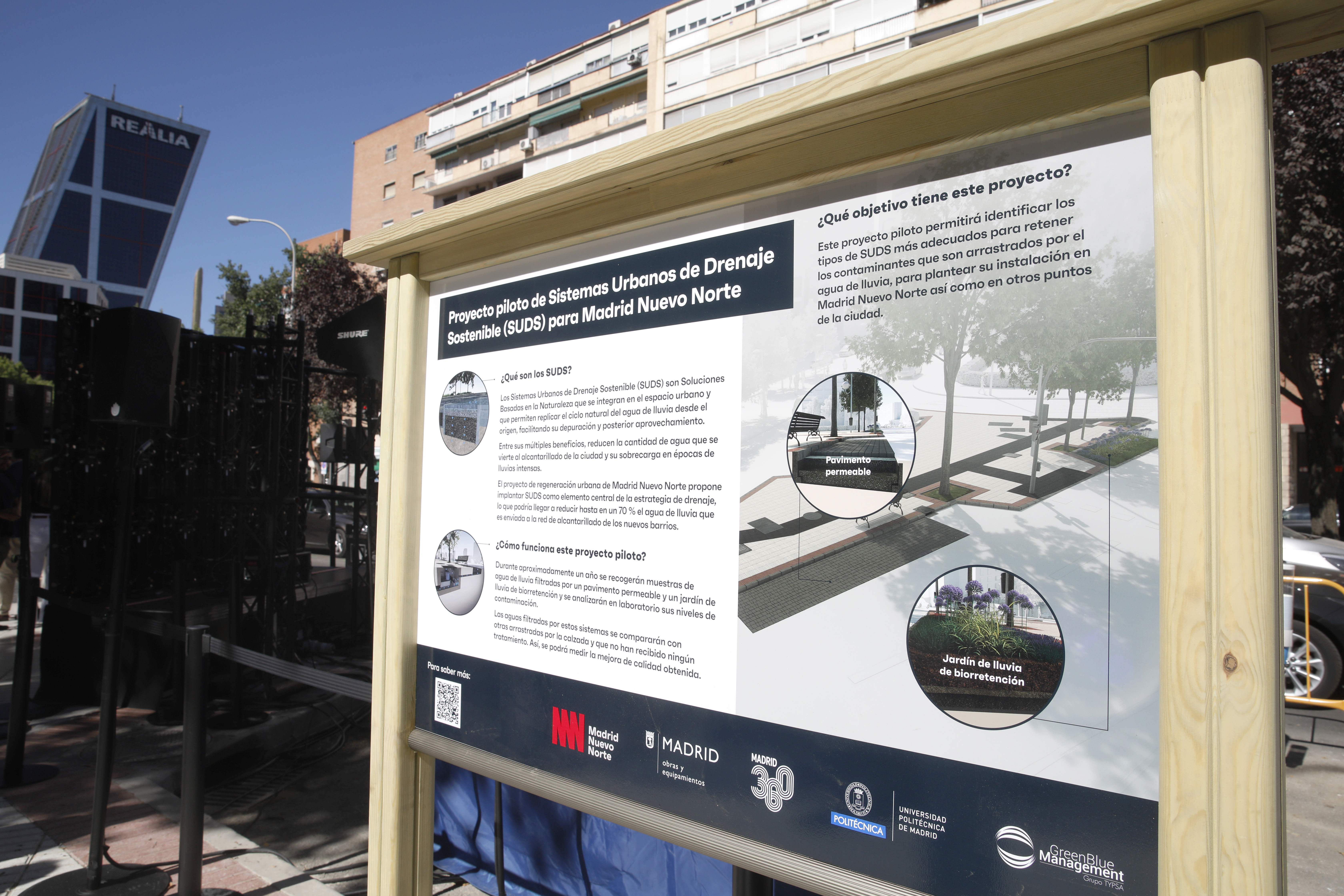 El piloto, ubicado en la confluencia de las calles Agustín de Foxá y Mauricio Legendre, forma parte de la completa estrategia de gestión hídrica para el desarrollo de Madrid Nuevo Norte encaminada a reducir al máximo el consumo de agua, dentro de la que destaca la propuesta de incorporación de sistemas urbanos de drenaje sostenible (SUDS) a los proyectos de urbanización. Estas técnicas buscan recuperar el ciclo natural del agua mediante la incorporación de superficies permeables en calles, plazas y parques, que permiten la captación y almacenamiento temporal del agua de lluvia, facilitando su retorno al subsuelo y evitando la sobrecarga de la red de saneamiento.