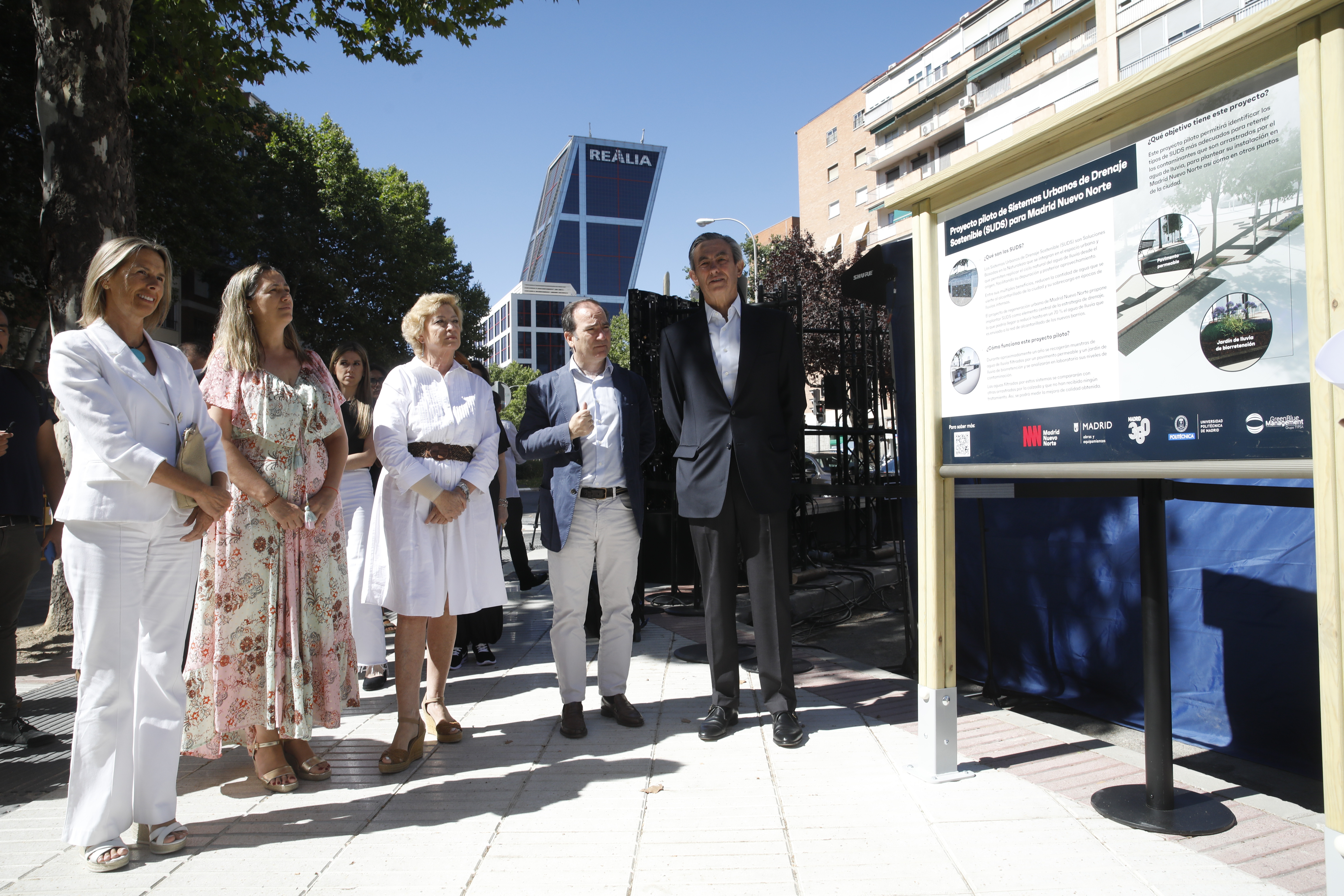 La delegada de Obras y Equipamientos, Paloma García Romero, y el delegado de Urbanismo, Medio Ambiente y Movilidad, Borja Carabante, acompañados de la concejala de Chamartín, Yolanda Estrada, han asistido hoy a la presentación del proyecto piloto que el Ayuntamiento está llevando a cabo en colaboración con Madrid Nuevo Norte para evaluar las mejores técnicas de drenaje y eliminación de contaminantes del agua de lluvia para este nuevo ámbito de la ciudad.