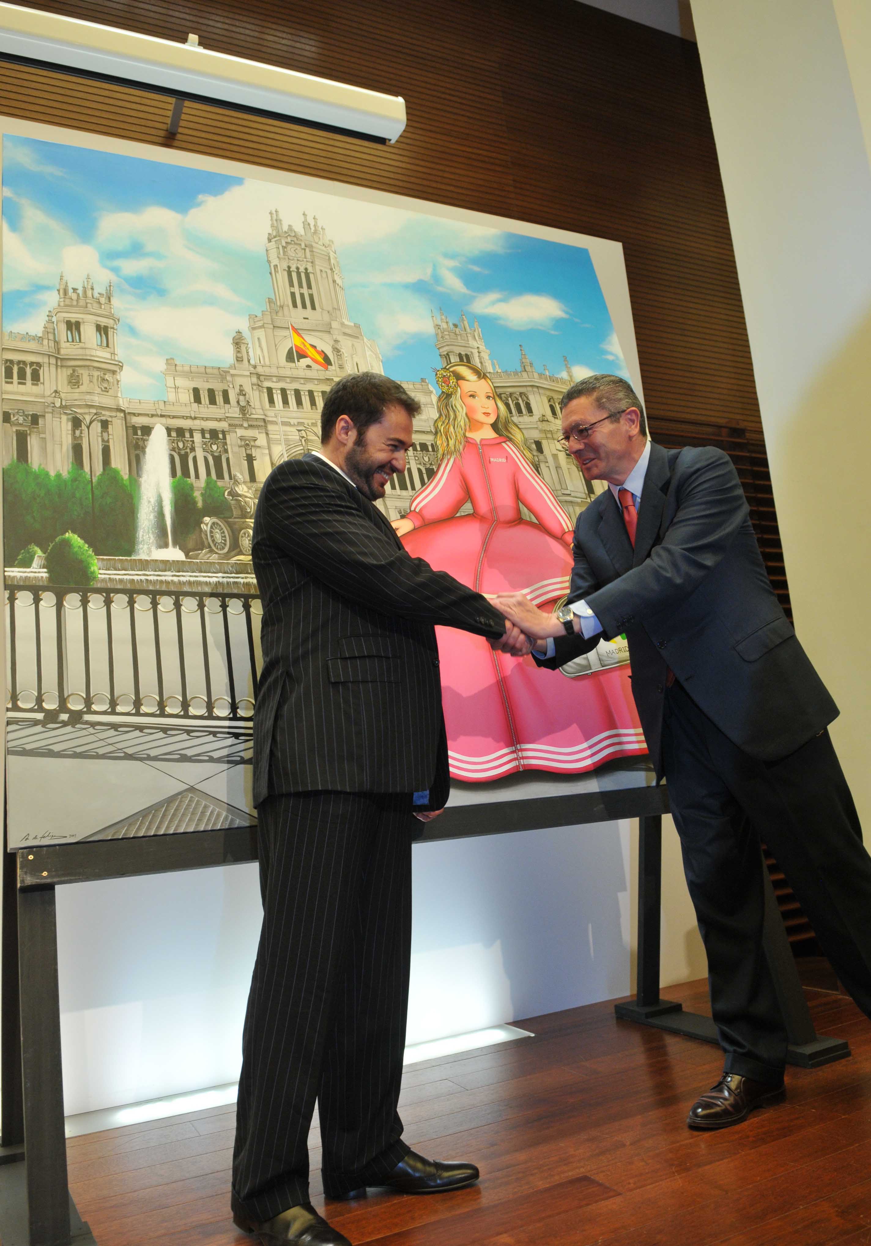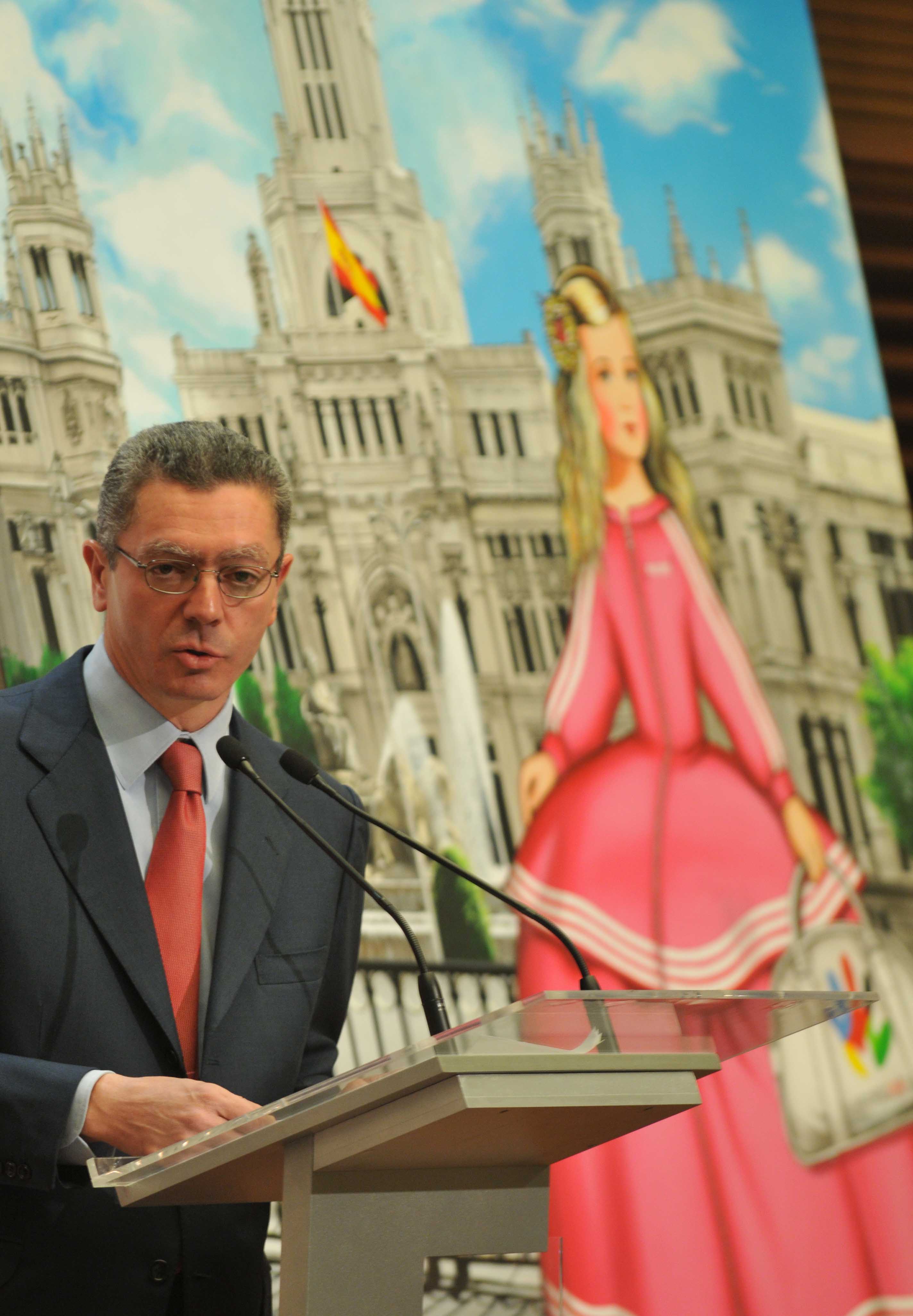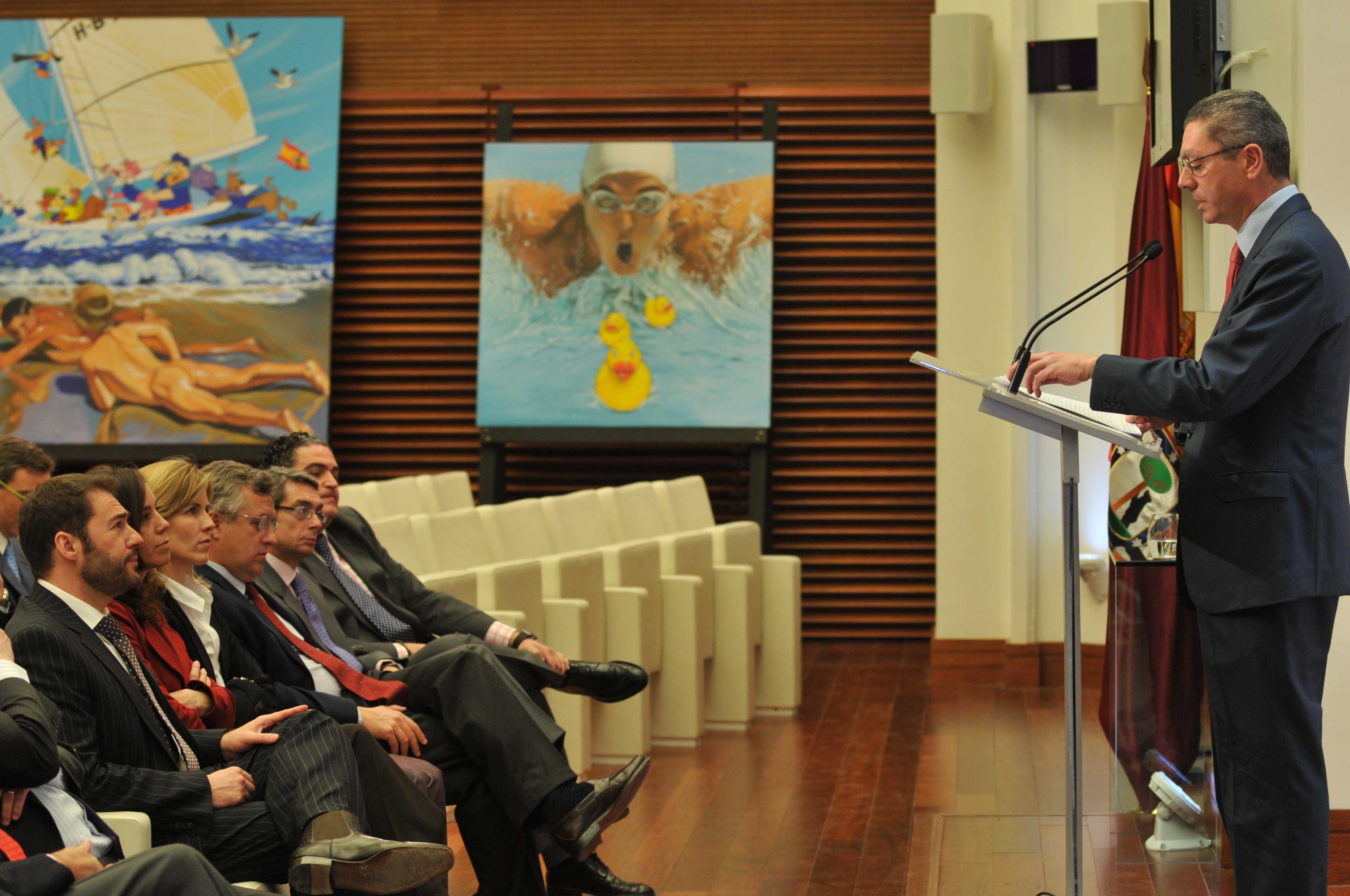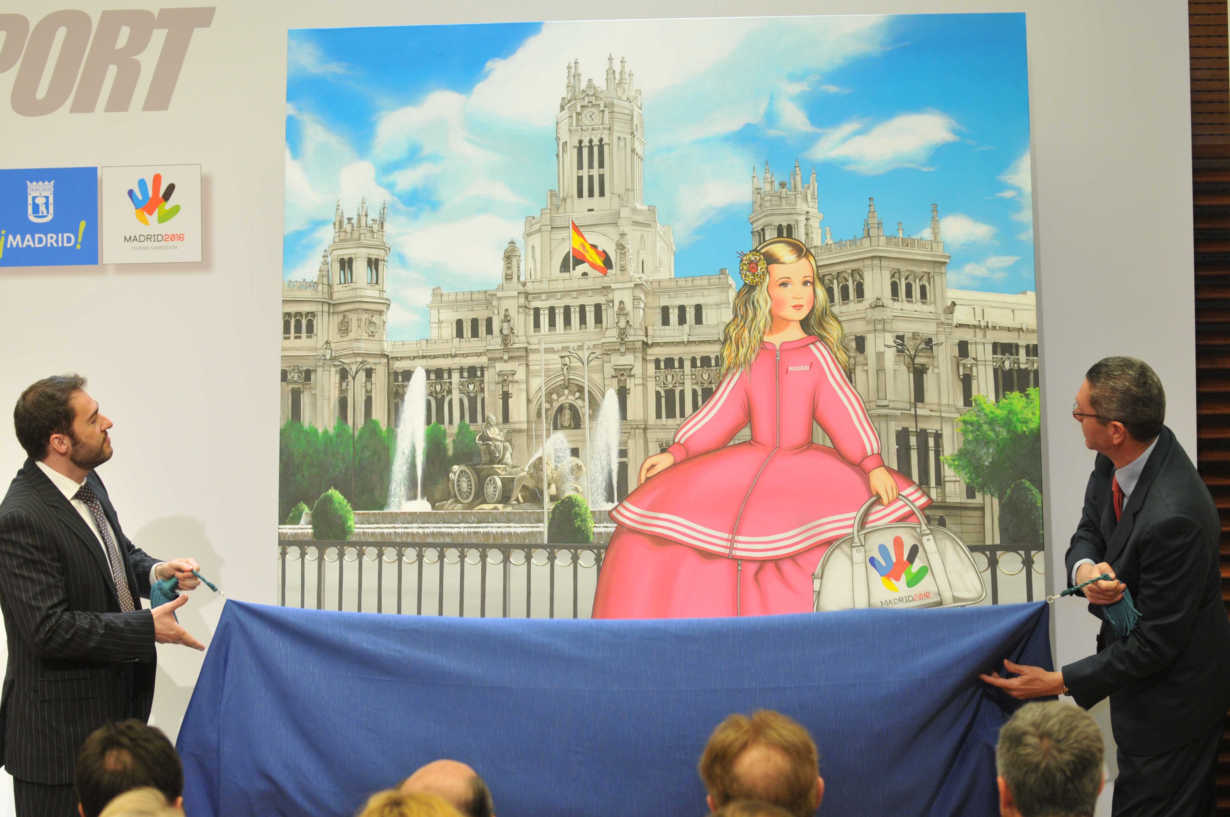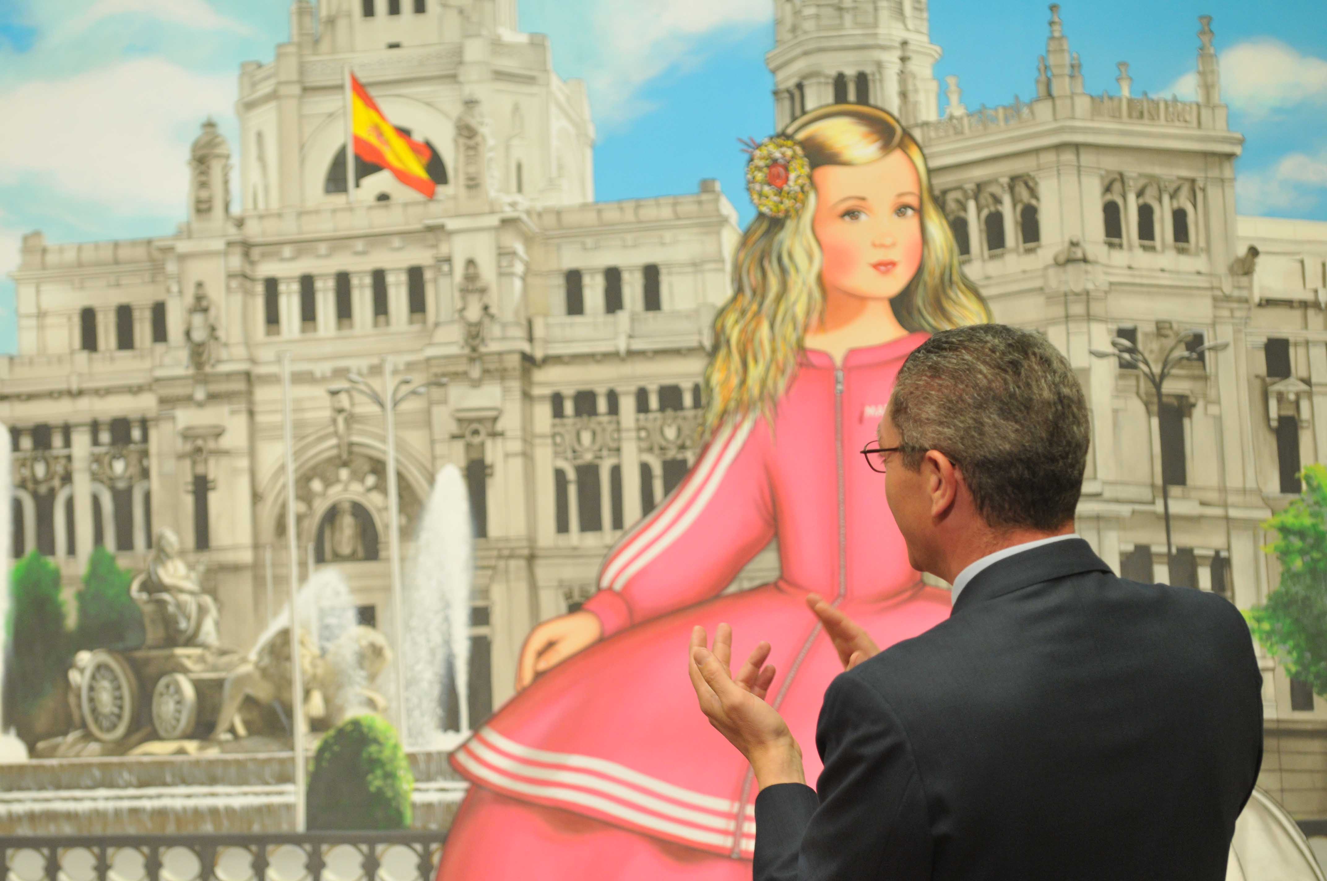 El alcalde de la Ciudad de Madrid, Alberto Ruiz-Gallardón, durante la presentación de la muestra Popsport, de Antonio de Felipe, quien ha regalado al Ayuntamiento un cuadro que simboliza la candidatura de Madrid a los Juegos de 2016: una menina en chándal ante el Palacio de Cibeles, portando una bolsa con la mano "que identifica los Juegos de las personas", ha dicho el alcalde