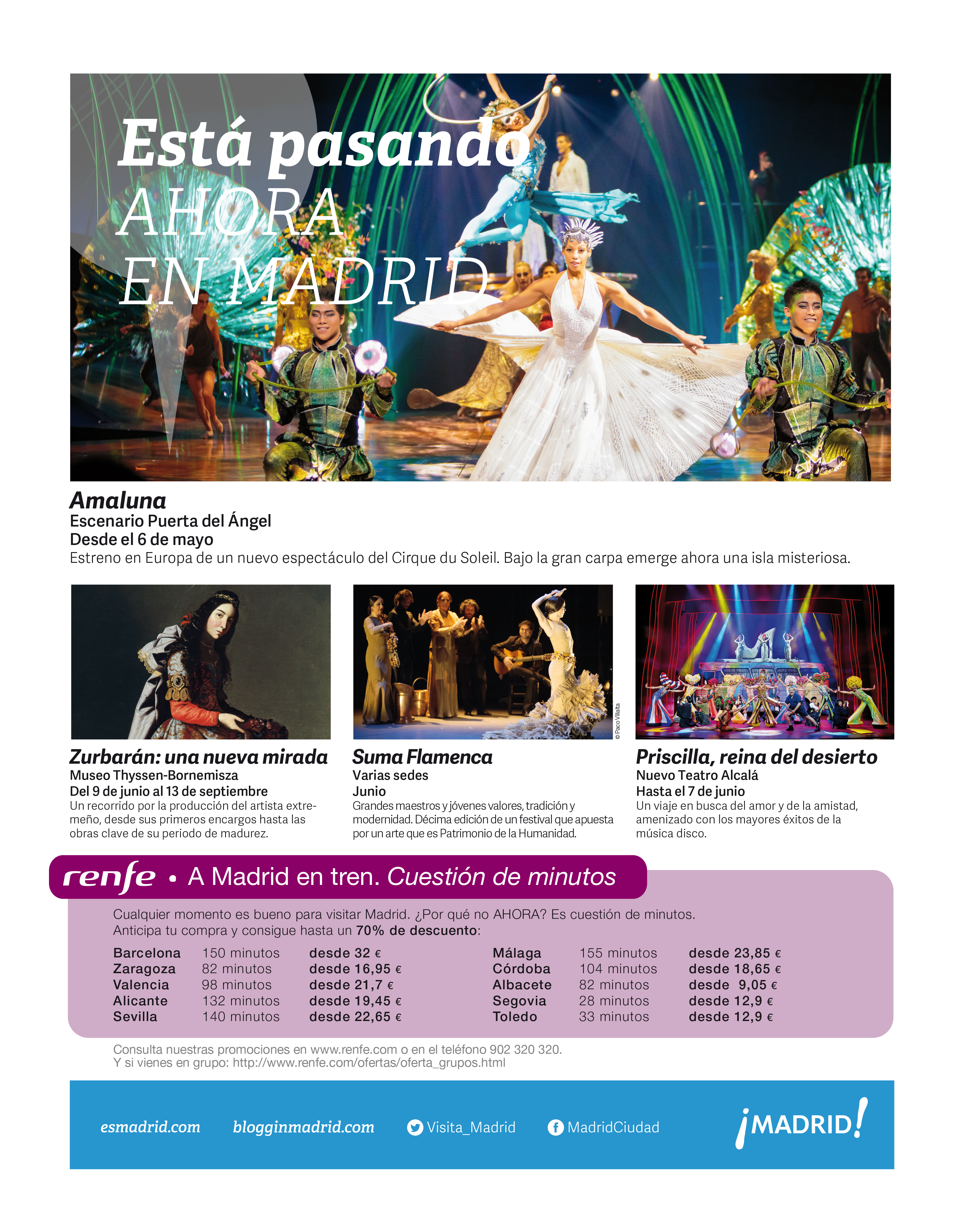 Como contrapartida, Madrid Destino ha incorporado información sobre los servicios de Renfe en sus inserciones publicitarias, en las que se incluyen algunos de los planes de ocio y experiencias únicas que pueden disfrutarse en la capital y que está insertando en los principales suplementos dominicales de la prensa española.