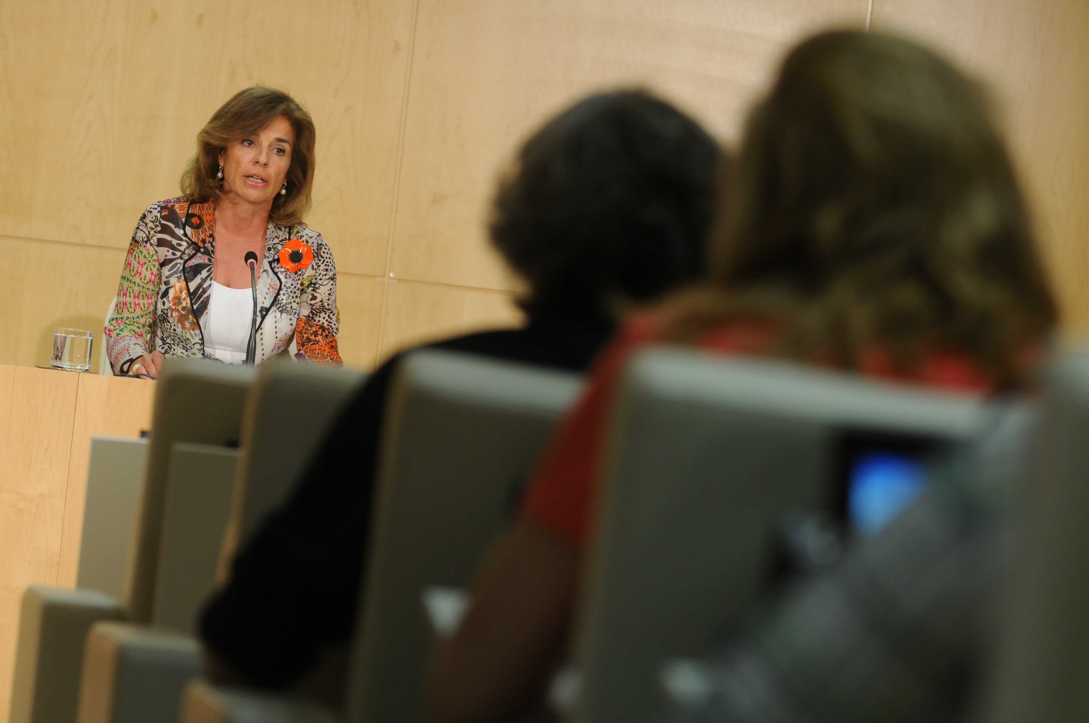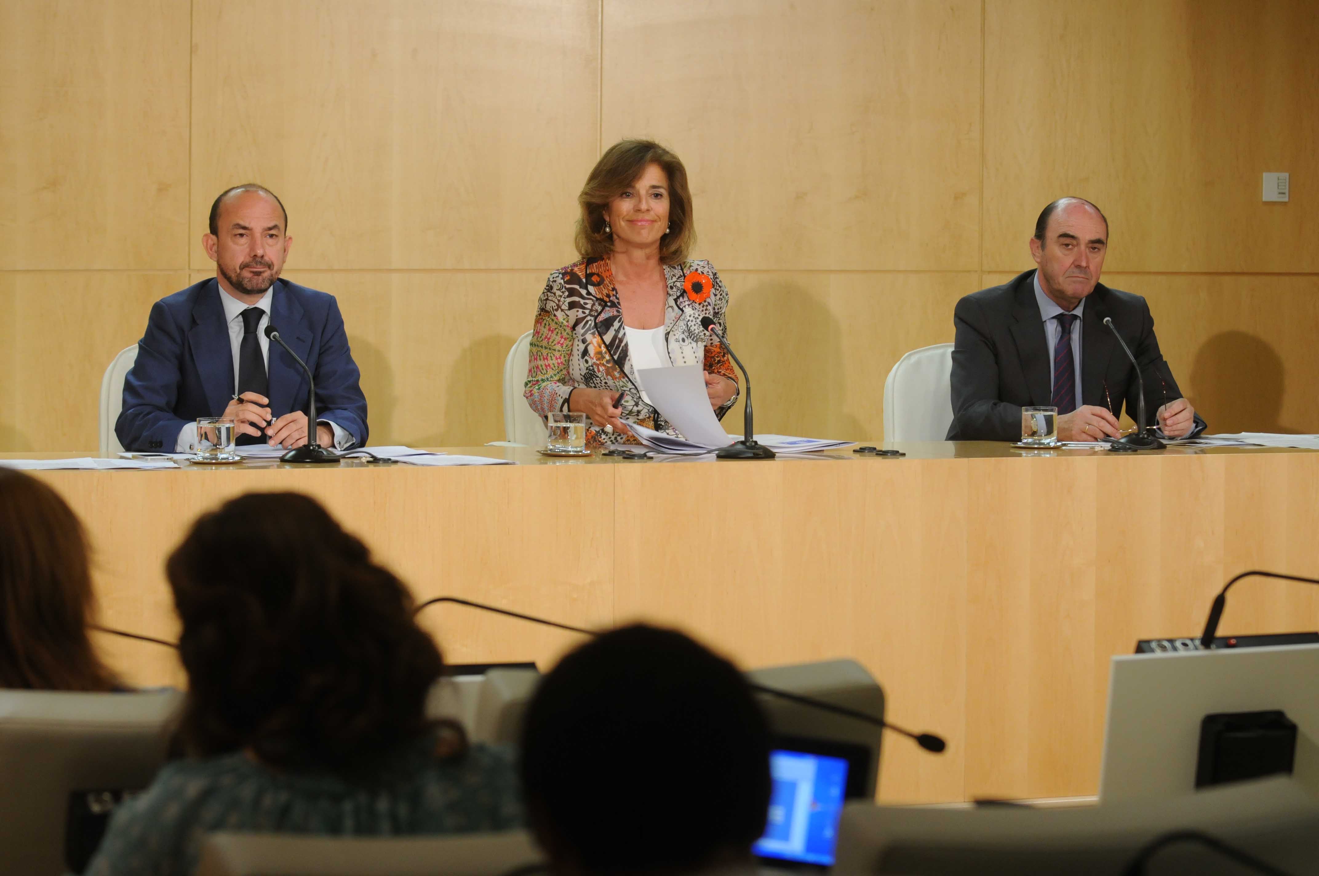 La alcaldesa de la Ciudad de Madrid, Ana Botella, flanqueda por el vicealcalde, Miguel Ángel Villanueva, y el delegado de Medio Ambiente, Antonio de Guindos, durante su intervención en la rueda de prensa posterior a la Junta de Gobierno, celebrada esta mañana en la sede municipal del Palacio de Cibeles.