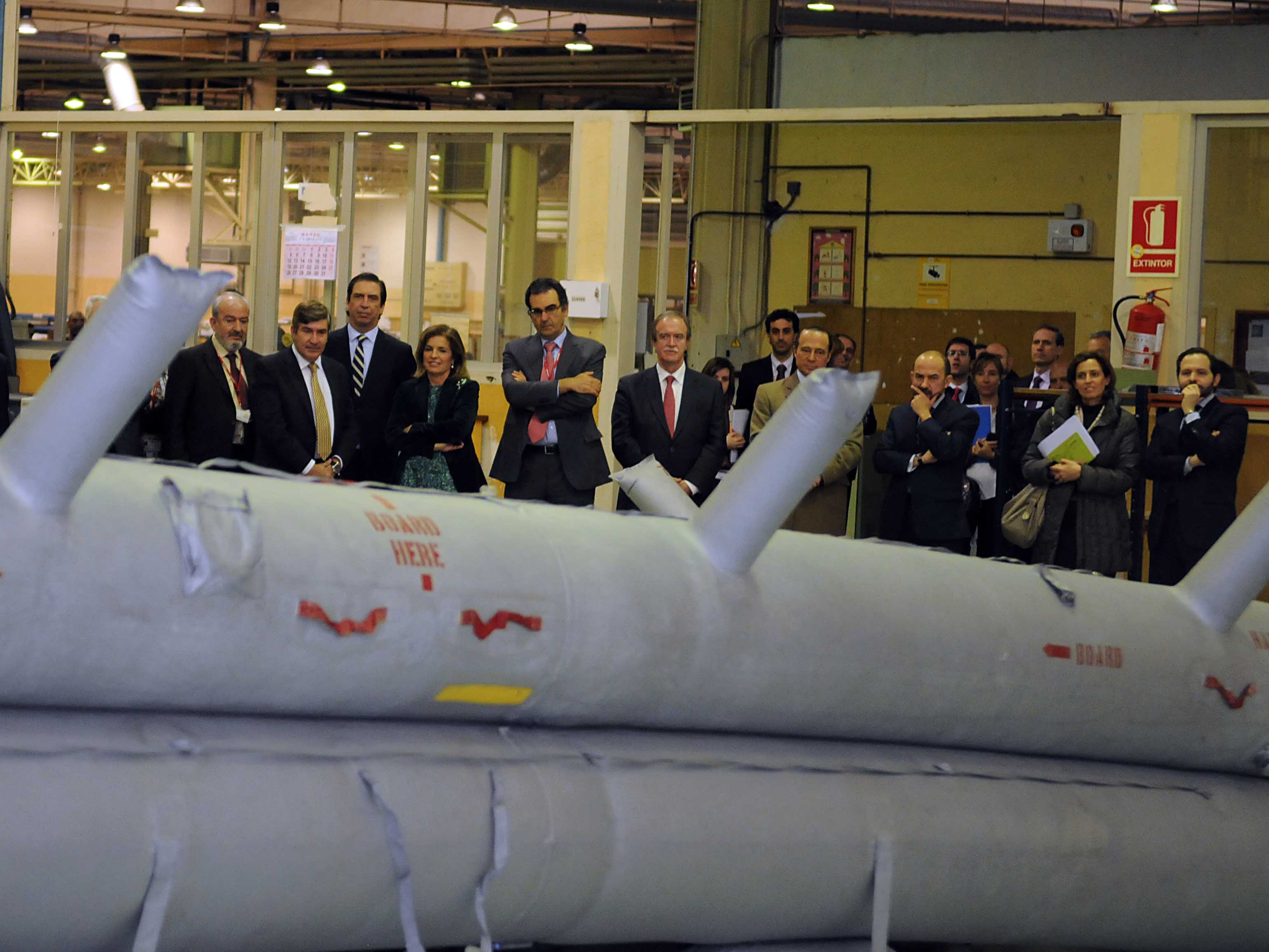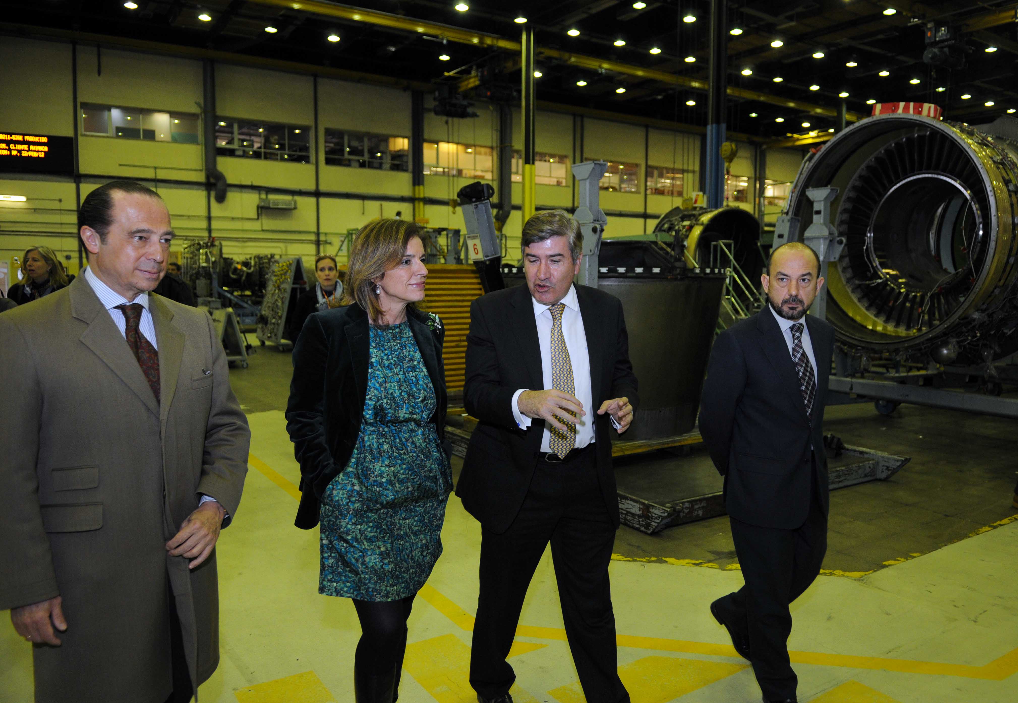 Distintos momentos de la visita que ha realizado esta mañana la alcaldesa de Madrid, Ana Botella, a las instalaciones de La Muñoza, donde tiene su sede Iberia Mantenimiento, filial de Iberia y segunda compañía aeronáutica de España por ingresos y plantilla, y la novena del mundo atendiendo a criterios de mantenimiento e ingeniería. La alcaldesa ha estado acompañada, entre otros, por el presidente de Iberia, Antonio Vázquez, y el vicealcalde, Miguel Ángel Villanueva.