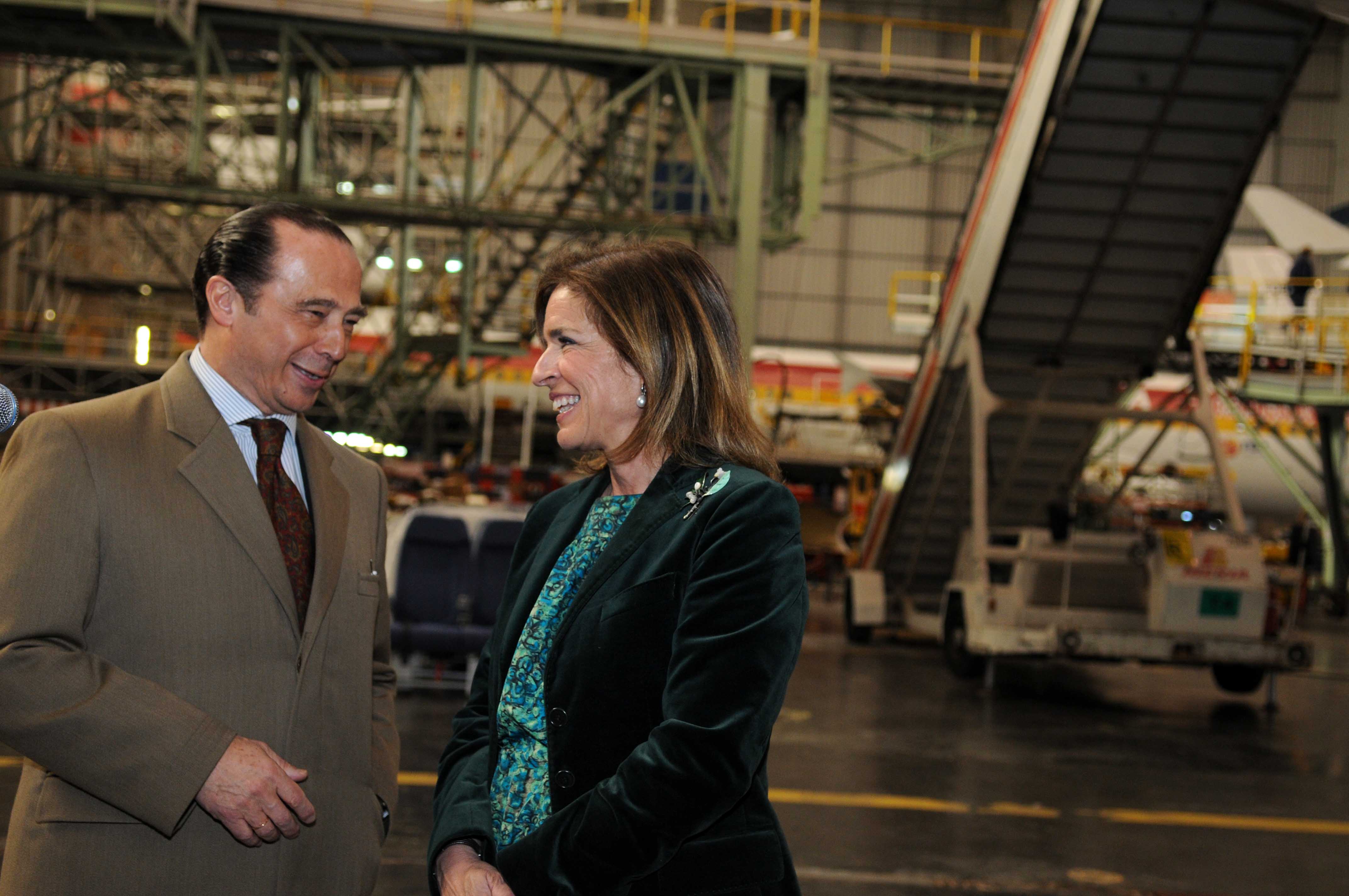 Fue en 1929 cuando se eligió el emplazamiento actual para el aeropuerto civil de Madrid, dos años después de que naciera Iberia, una compañía que en 1939 realizó ya su primer vuelo internacional y en 1946 se convirtió en la primera aerolínea en realizar vuelos entre Europa y América del Sur. "Quizá -observó Botella- marcó así su destino como una empresa tan ligada a Iberoamérica y tan ligada a la historia y al futuro de España". El pasado año Iberia, con una flota propia de 161 aviones, fue elegida por 18 millones de viajeros y transportó casi 175.000 toneladas de cartas. Sólo Iberia Mantenimiento, la filial visitada hoy, obtuvo unos ingresos de 777 millones de euros.