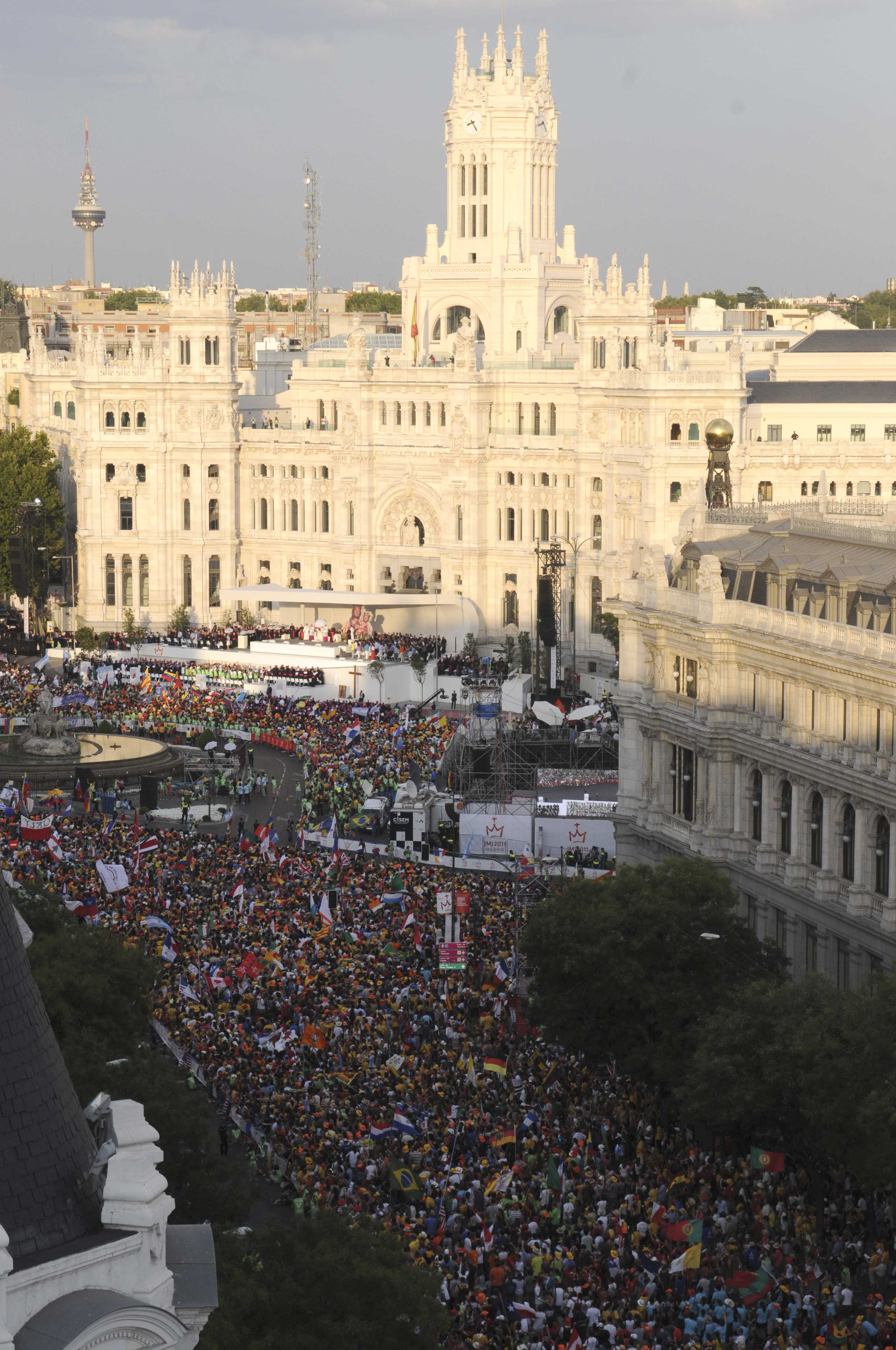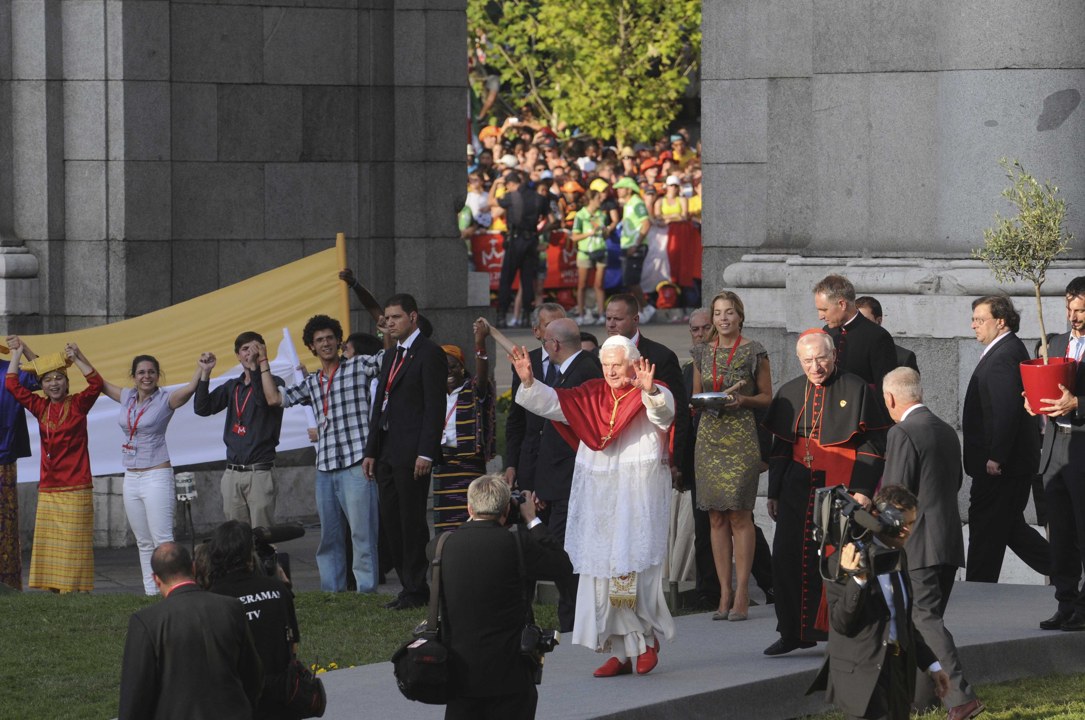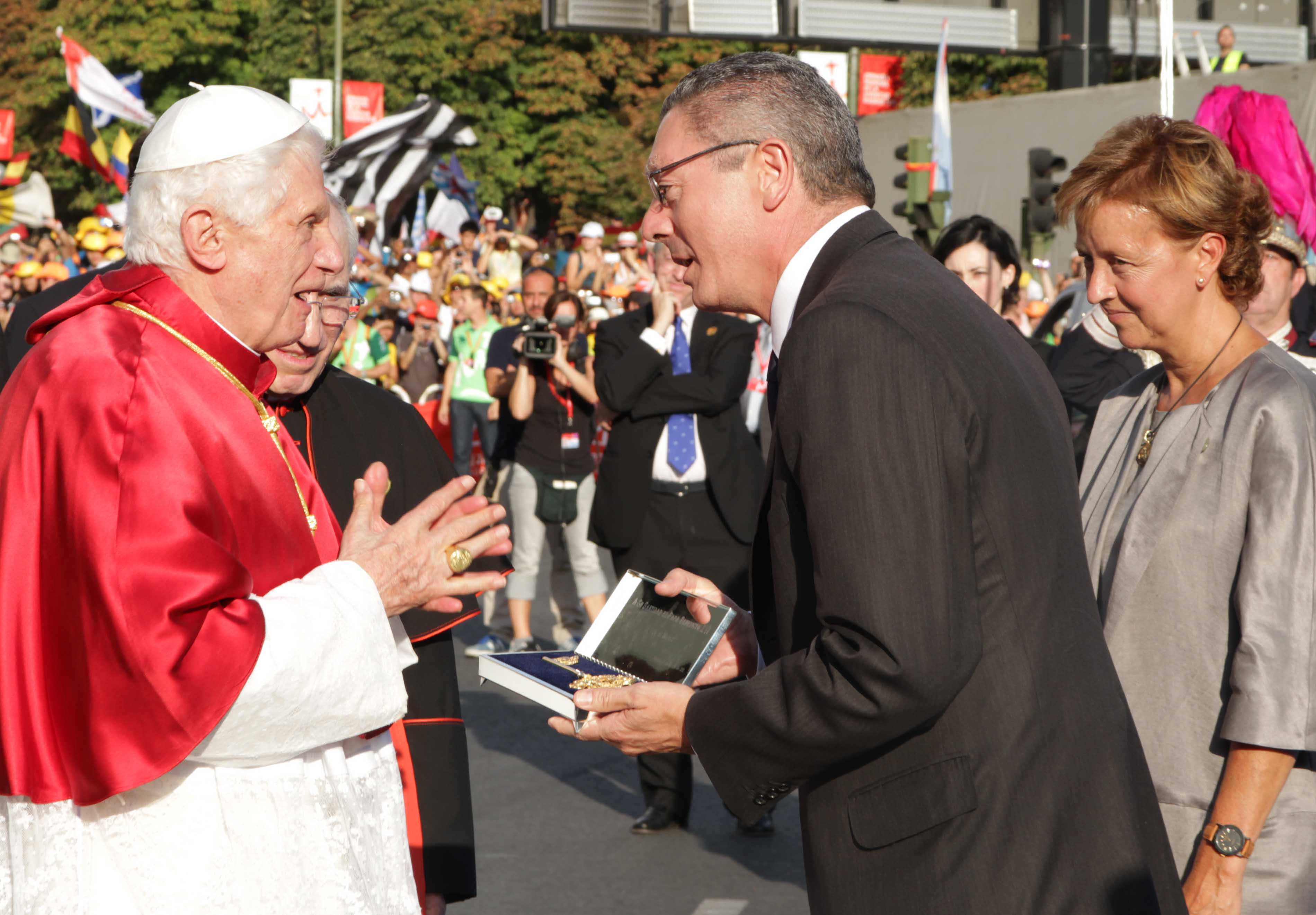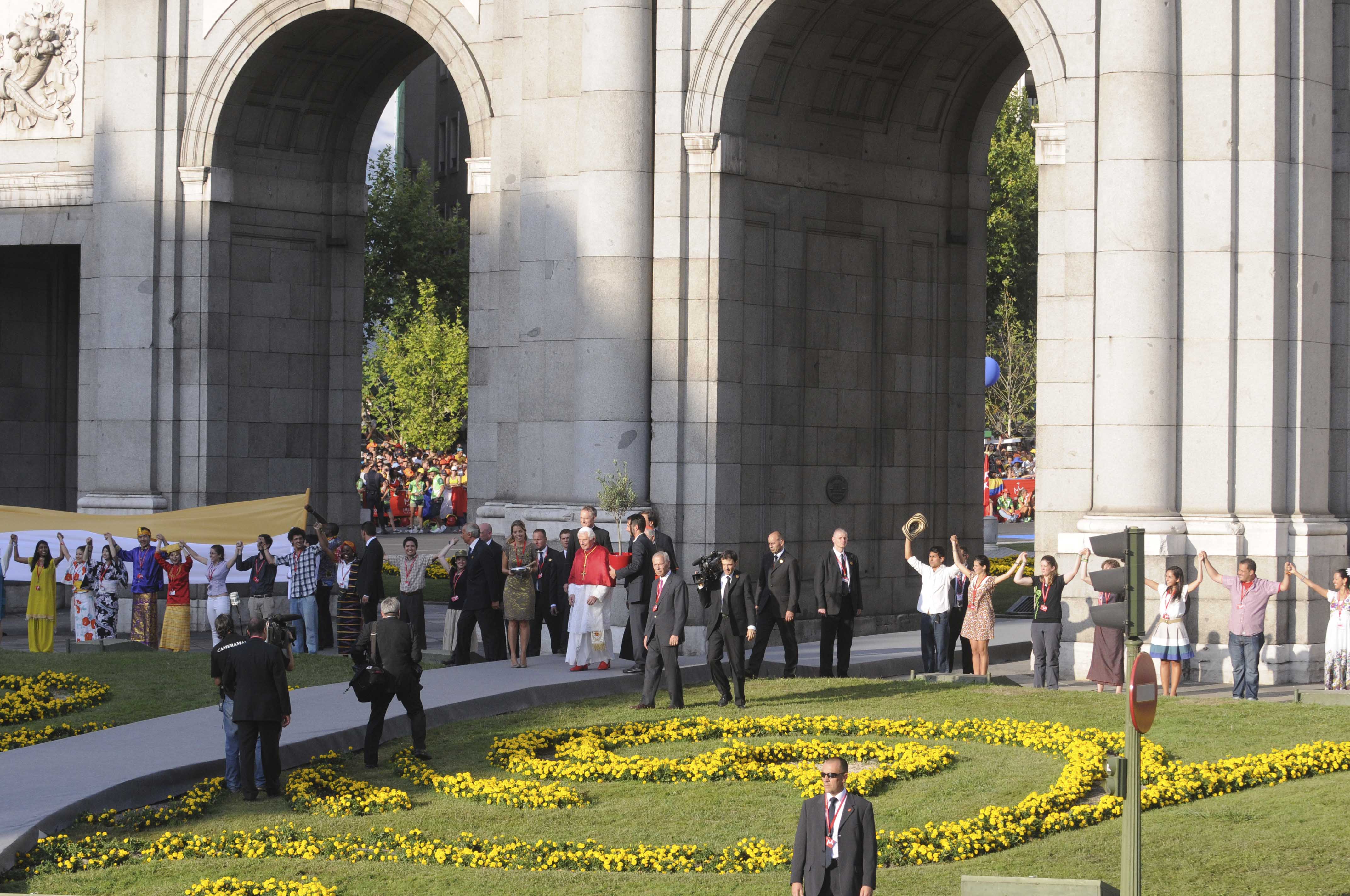 Imágenes del acto de entrega de la Llave de Oro de Madrid al Papa Benedicto XVI, de su entrada a pie por el arco central de la Puerta de Alca y del ambiente que se ha vivido en la plaza de Cibeles y sus aledaños