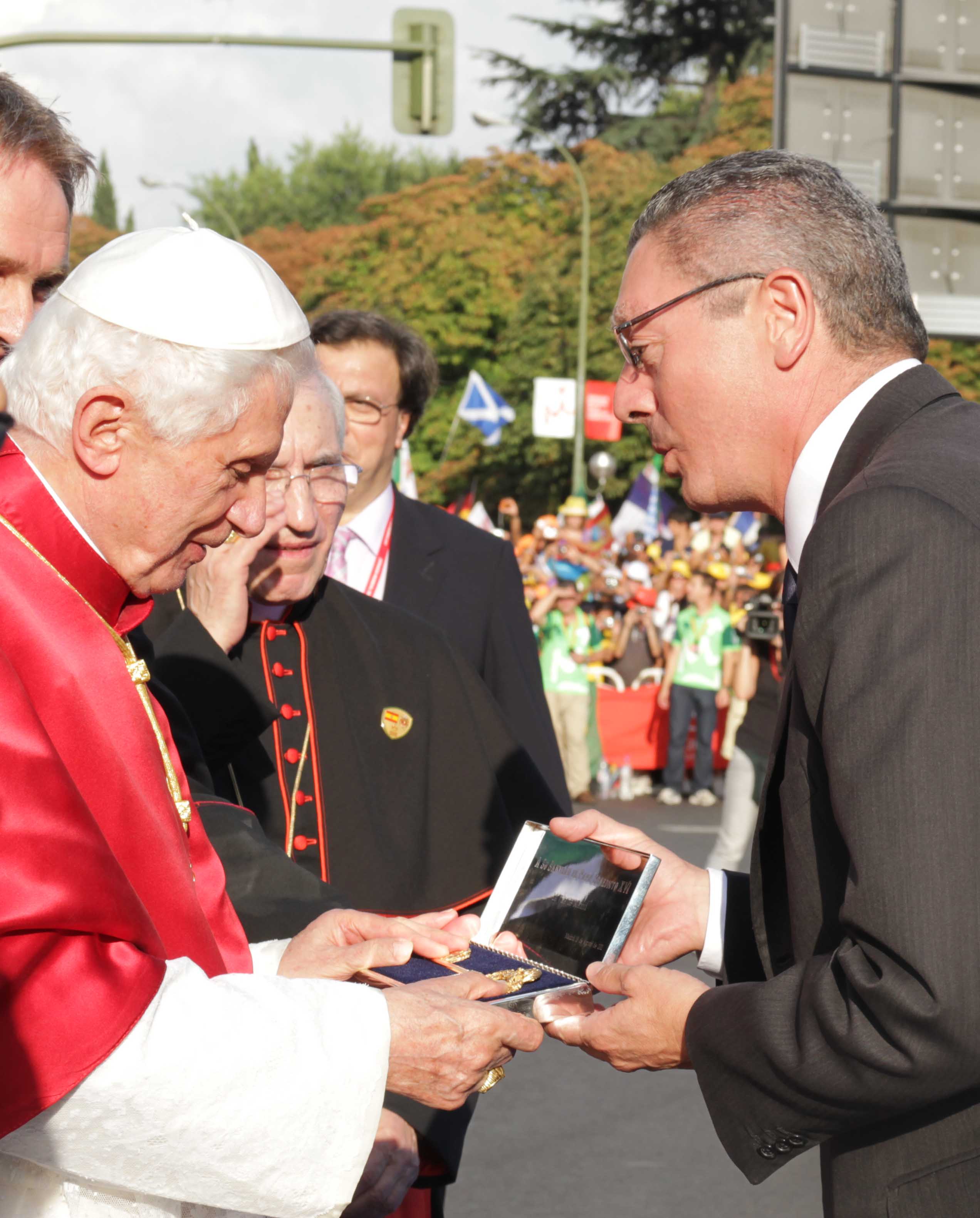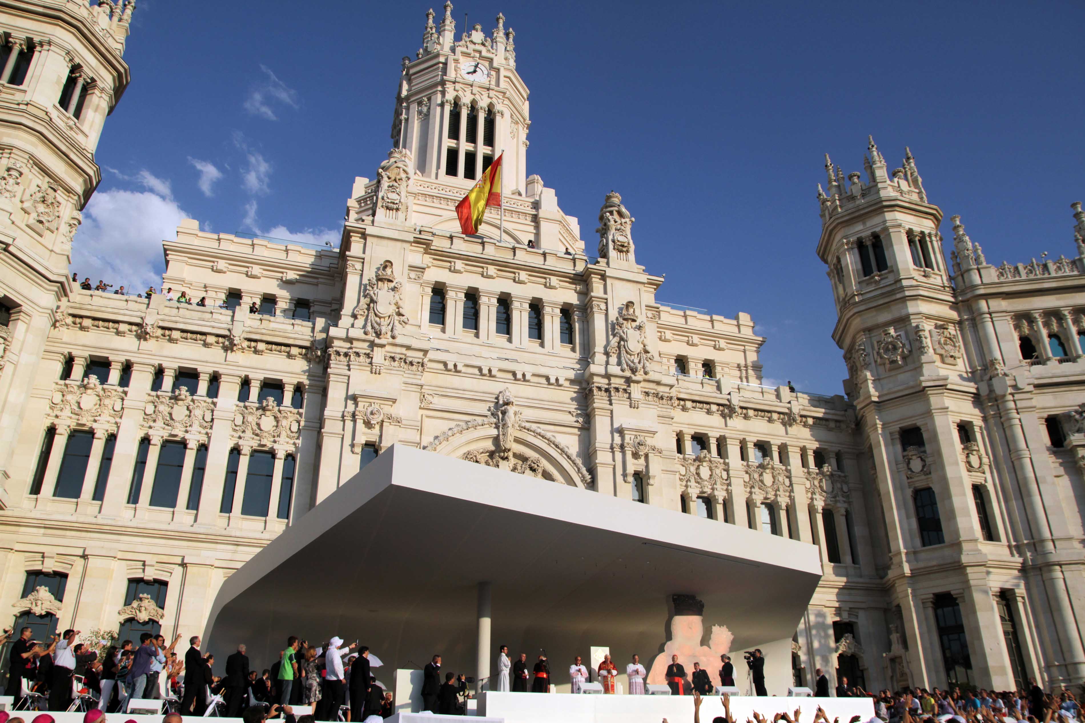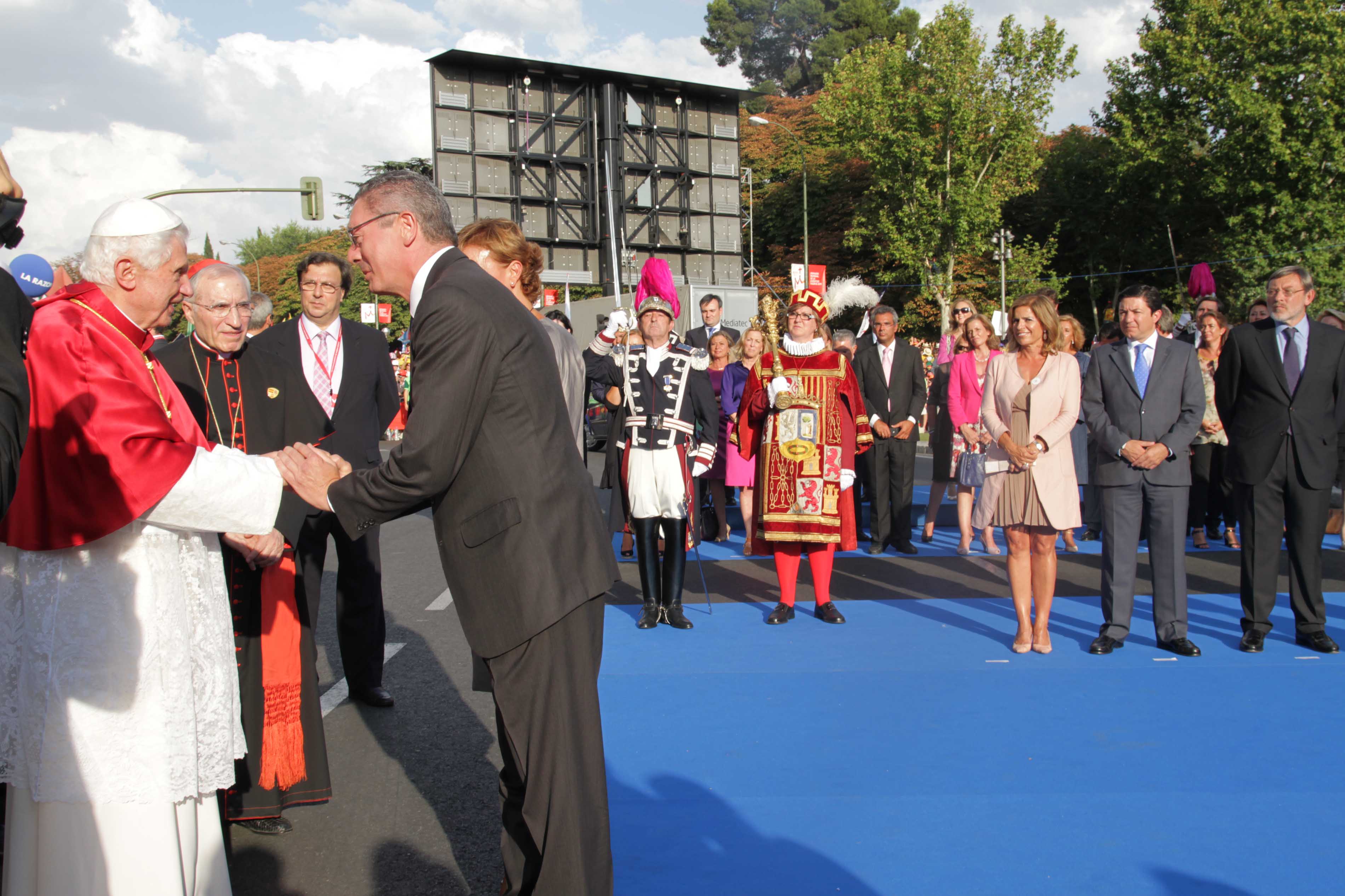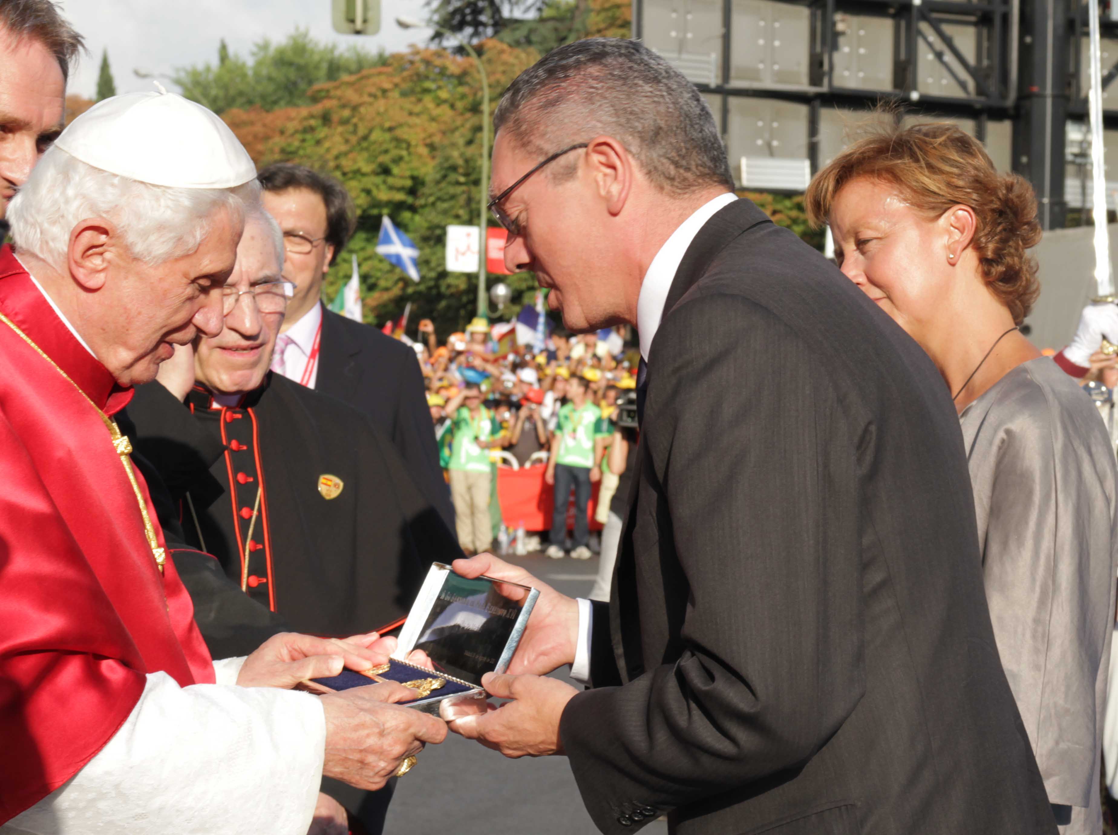 Imágenes del acto de entrega de la Llave de Oro de Madrid al Papa Benedicto XVI, de su entrada a pie por el arco central de la Puerta de Alca y del ambiente que se ha vivido en la plaza de Cibeles y sus aledaños