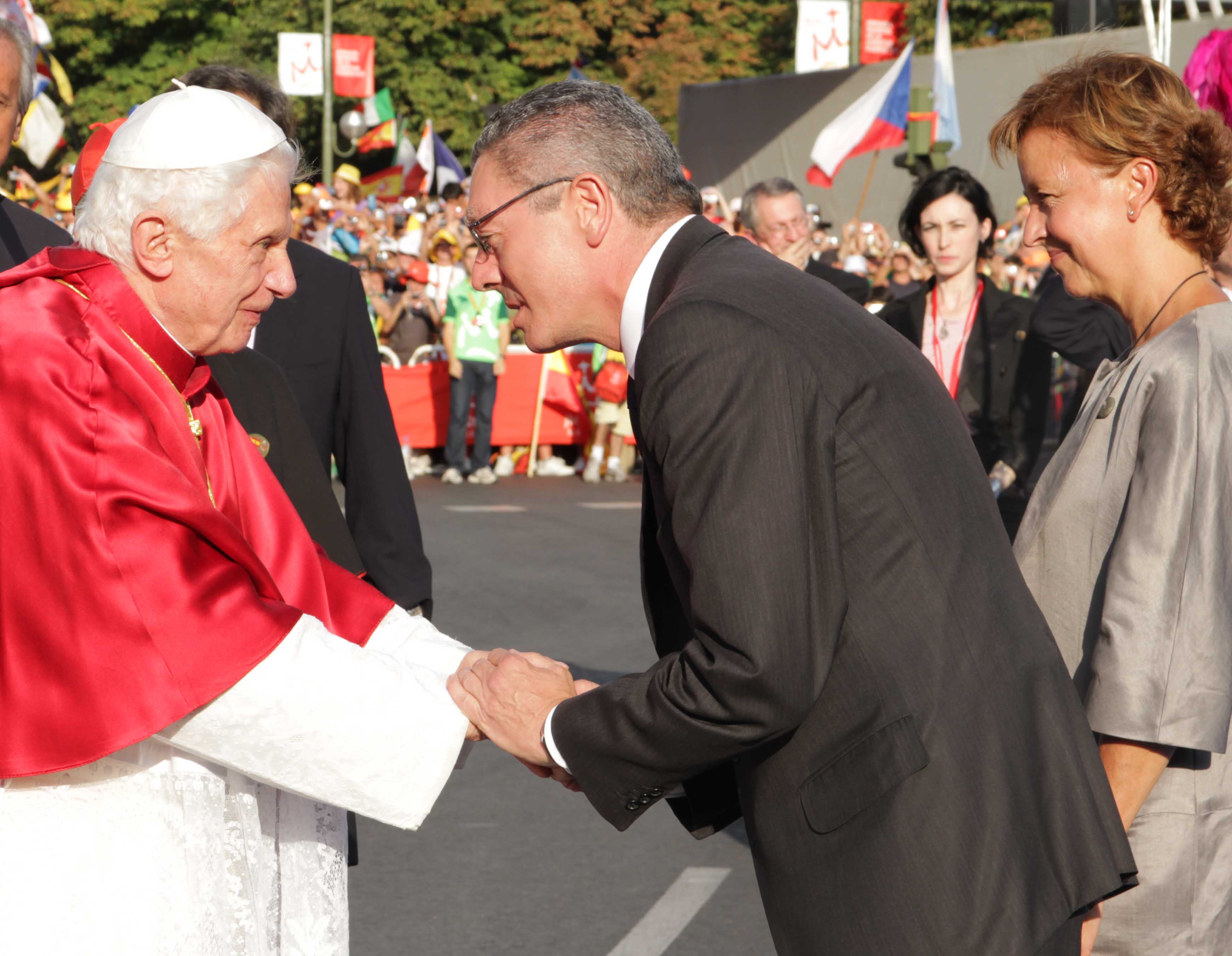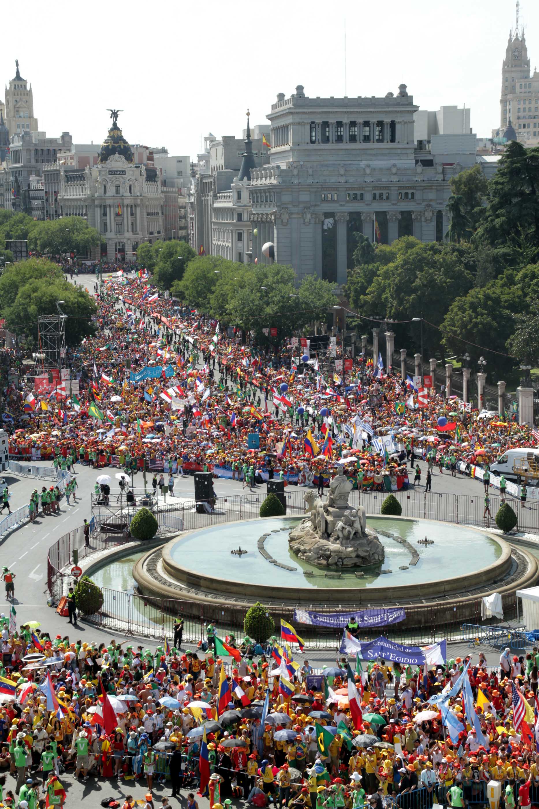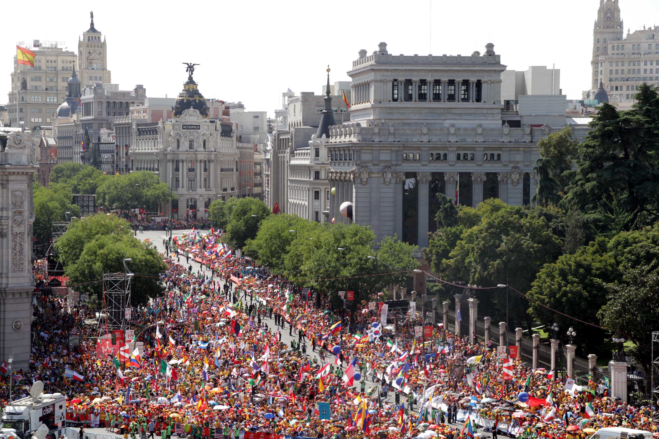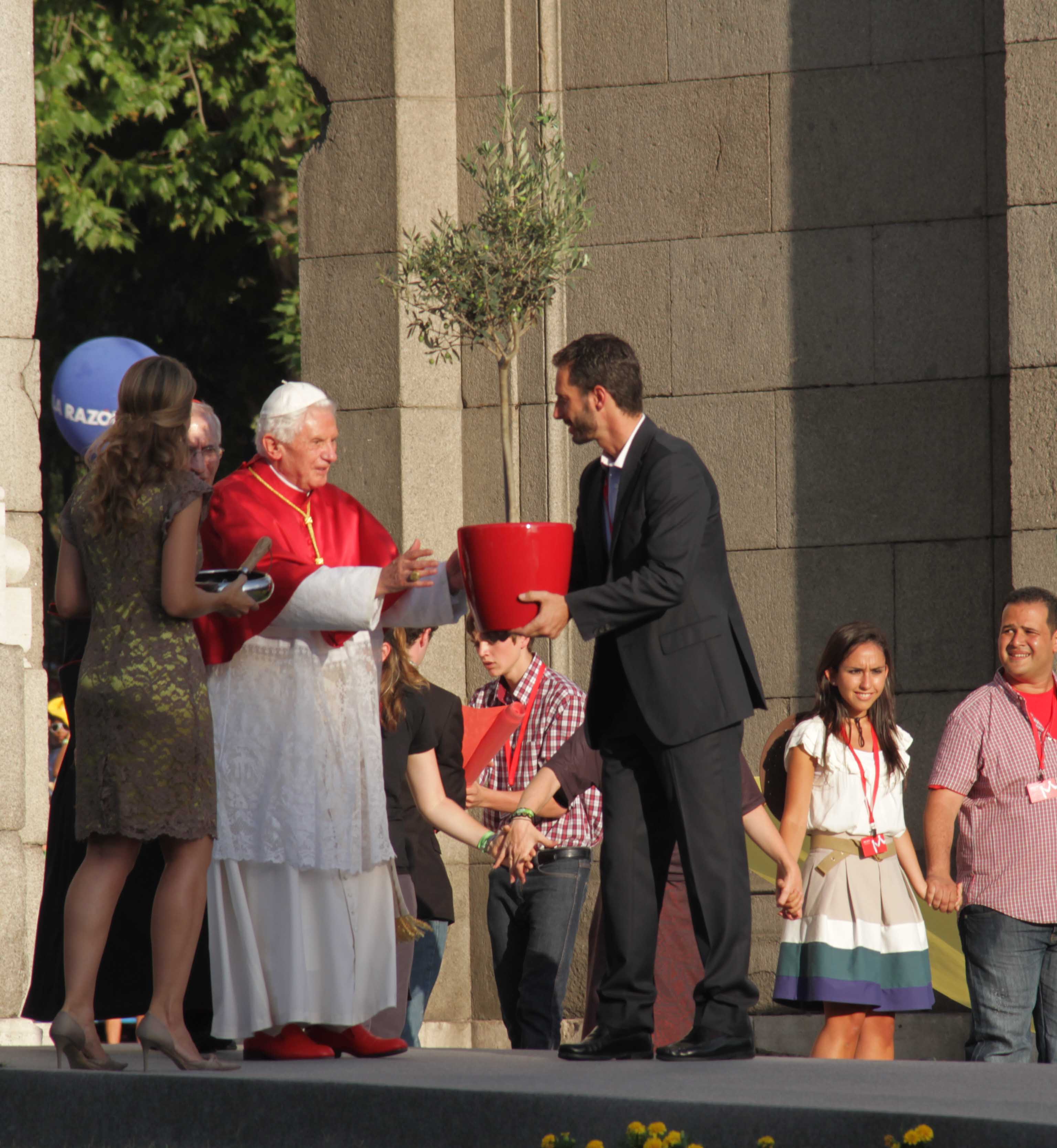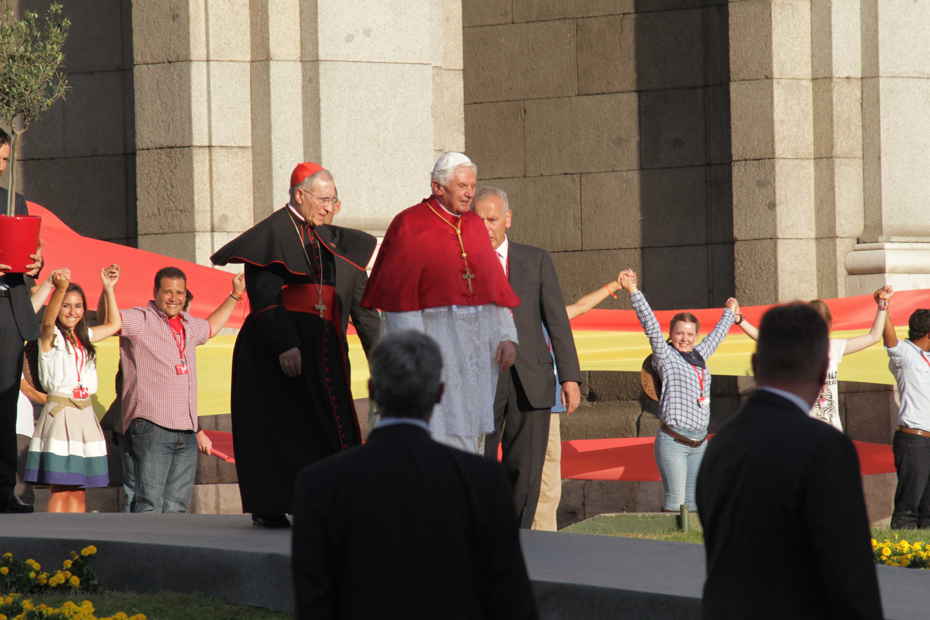 Imágenes del acto de entrega de la Llave de Oro de Madrid al Papa Benedicto XVI, de su entrada a pie por el arco central de la Puerta de Alca y del ambiente que se ha vivido en la plaza de Cibeles y sus aledaños