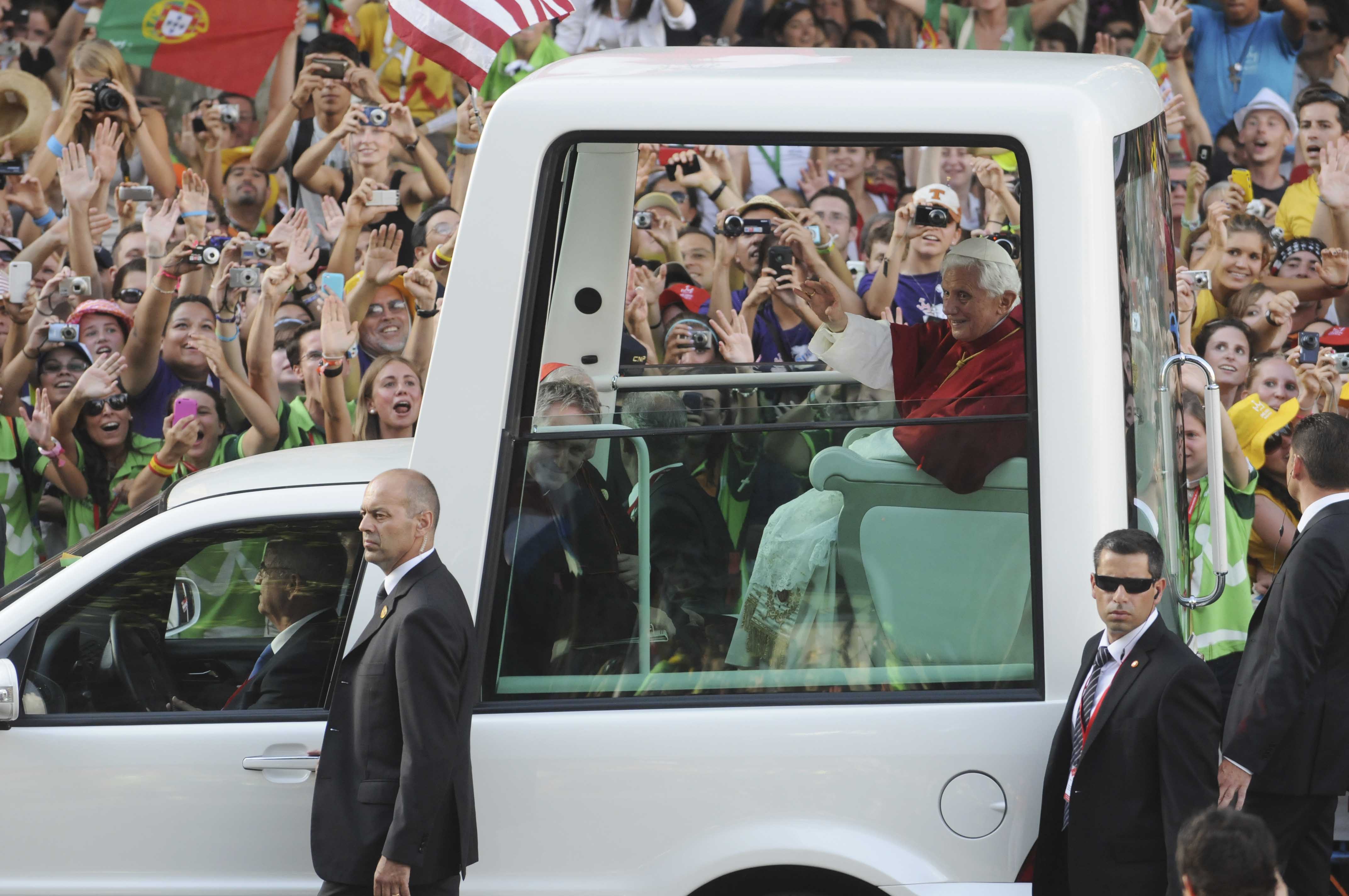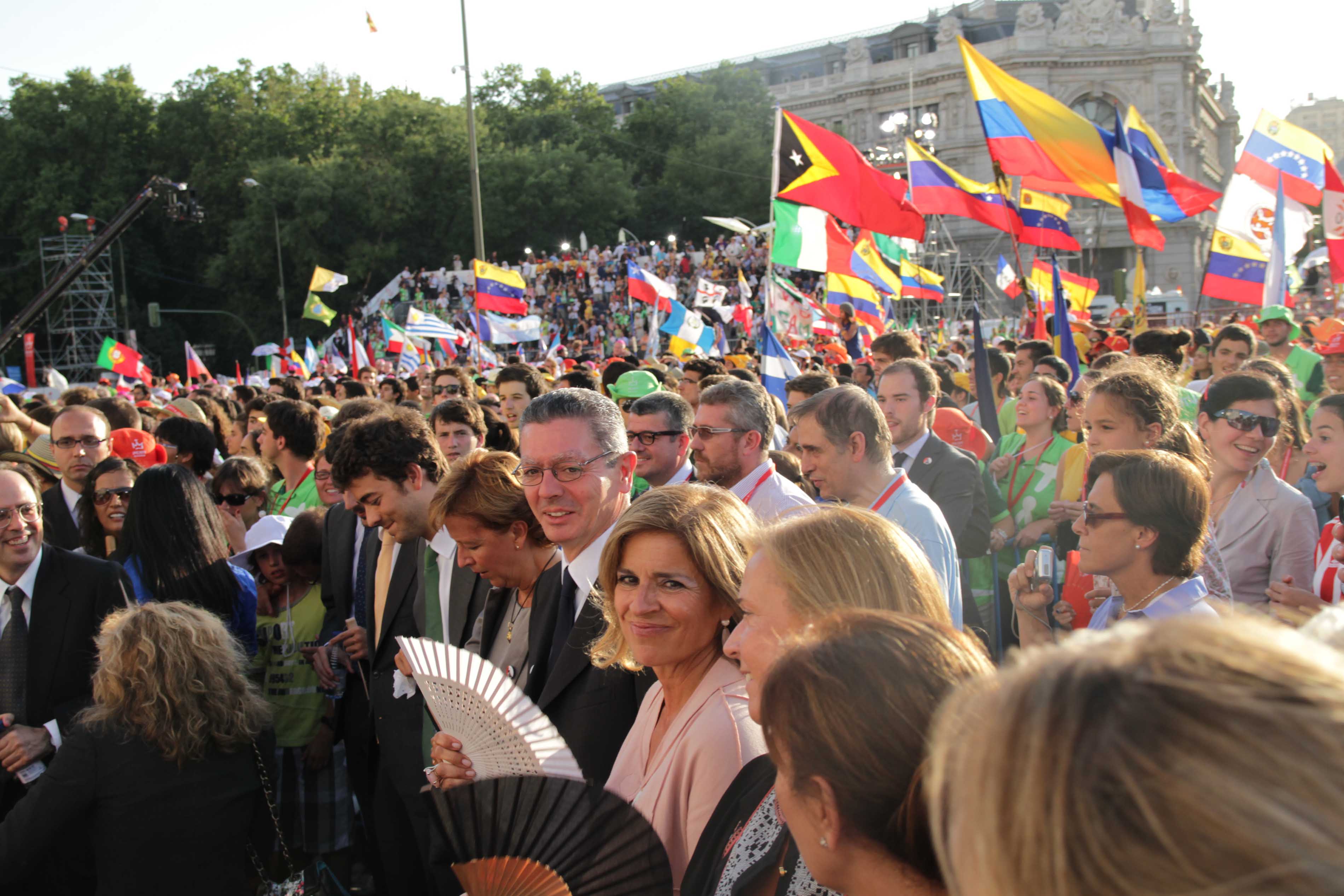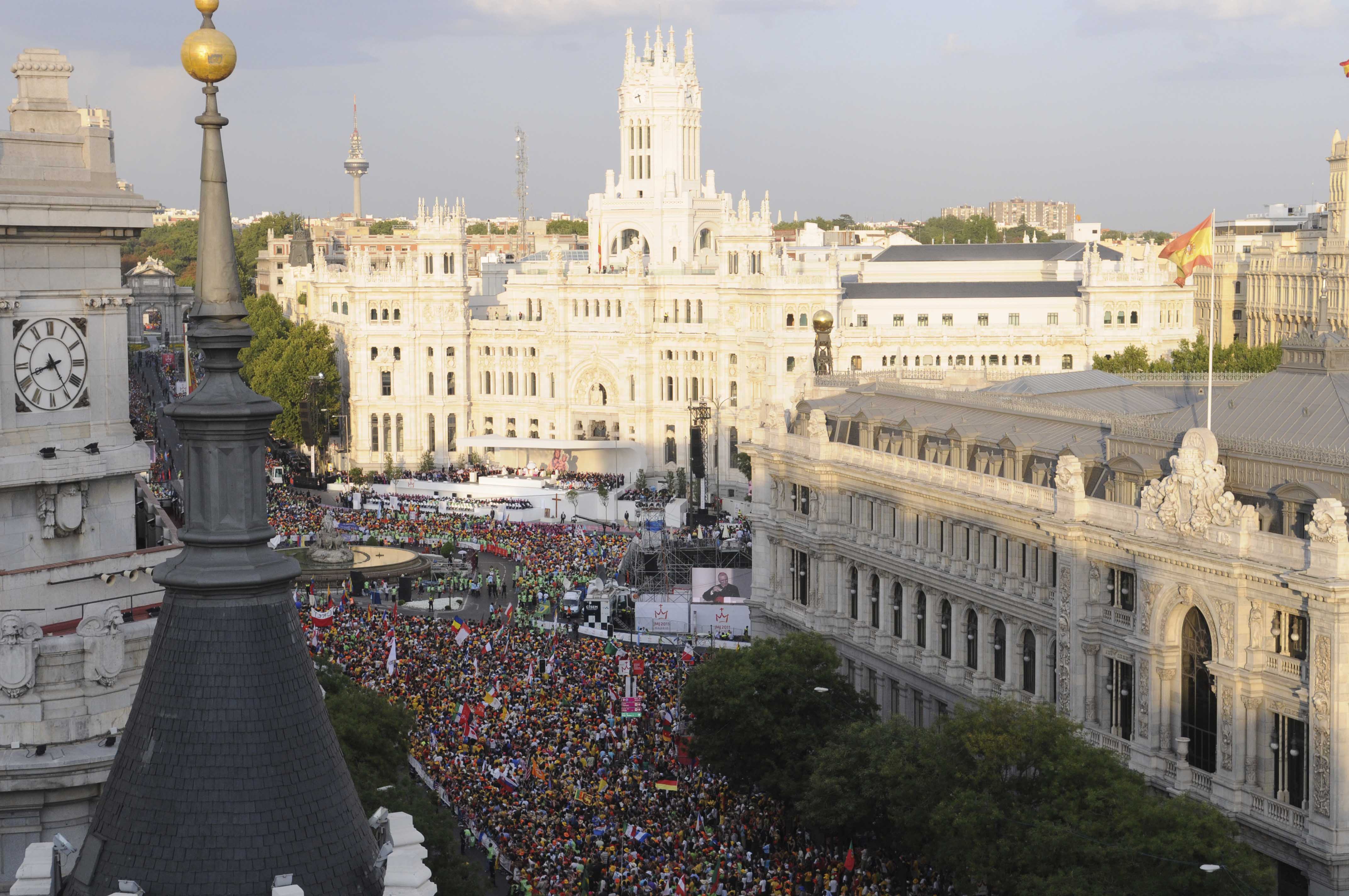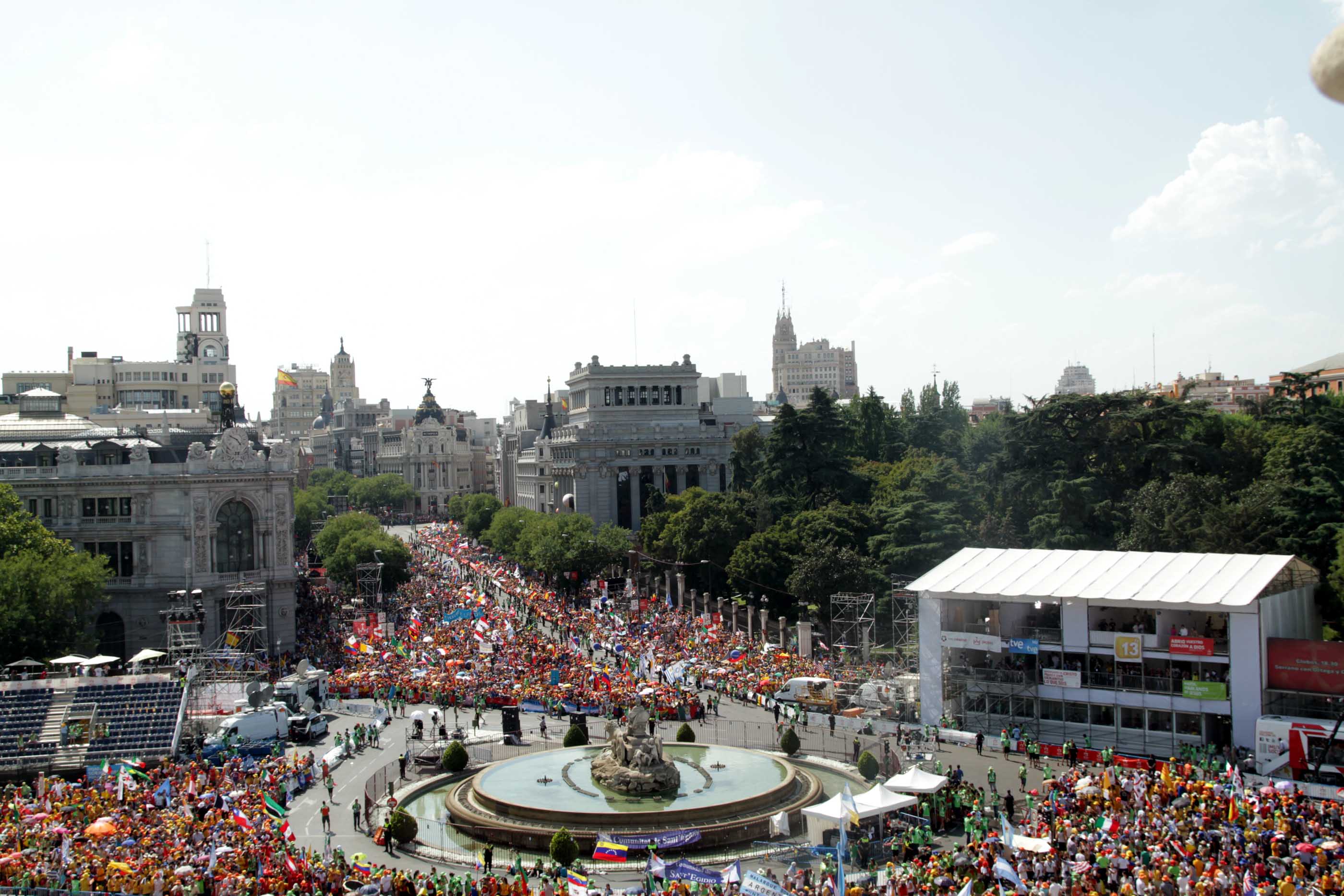 Imágenes del acto de entrega de la Llave de Oro de Madrid al Papa Benedicto XVI, de su entrada a pie por el arco central de la Puerta de Alca y del ambiente que se ha vivido en la plaza de Cibeles y sus aledaños