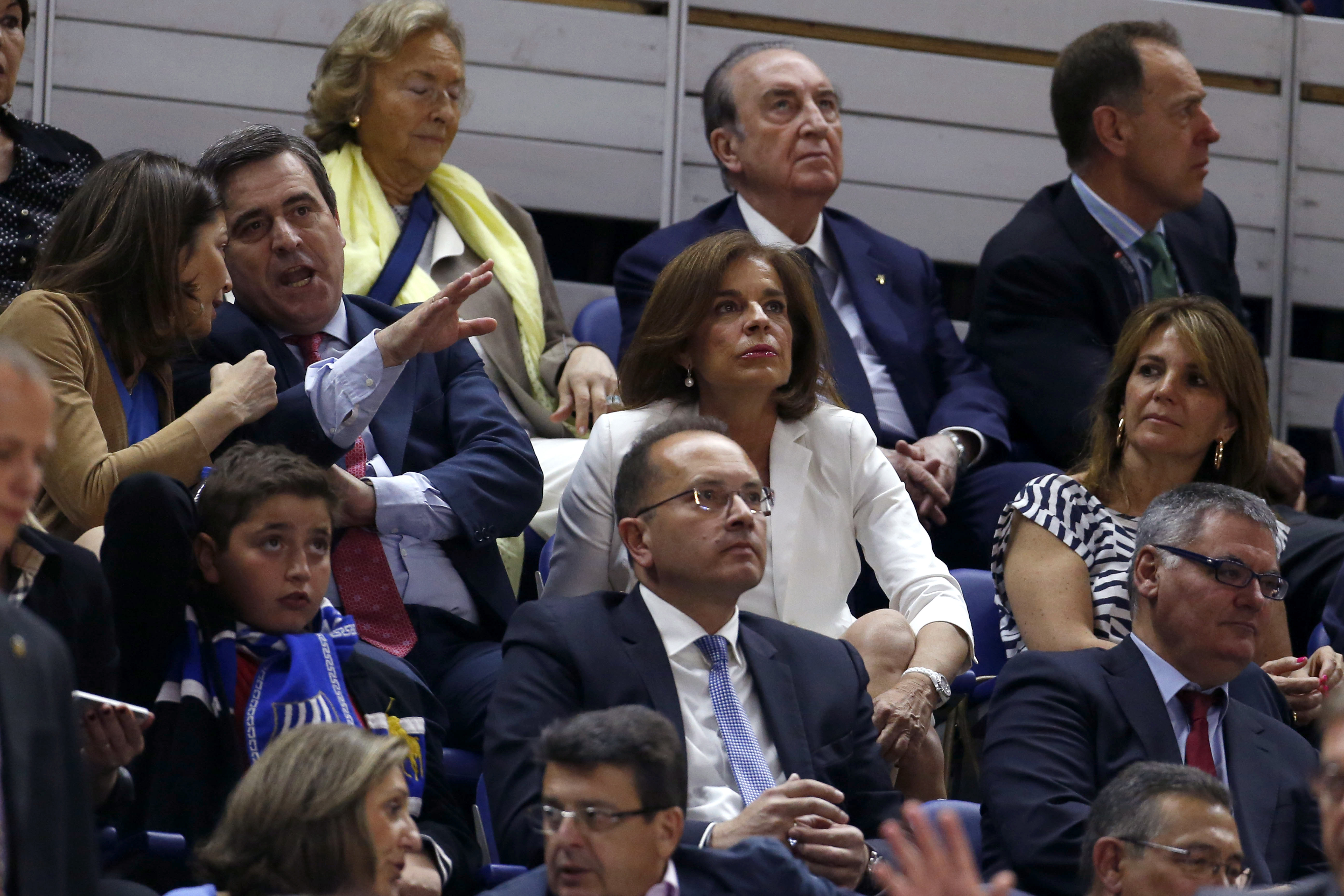 En la imagen, la alcaldesa Ana Botella durante el partido de baloncesto entre el Real Madrid y el equipo griego el Olympiacos