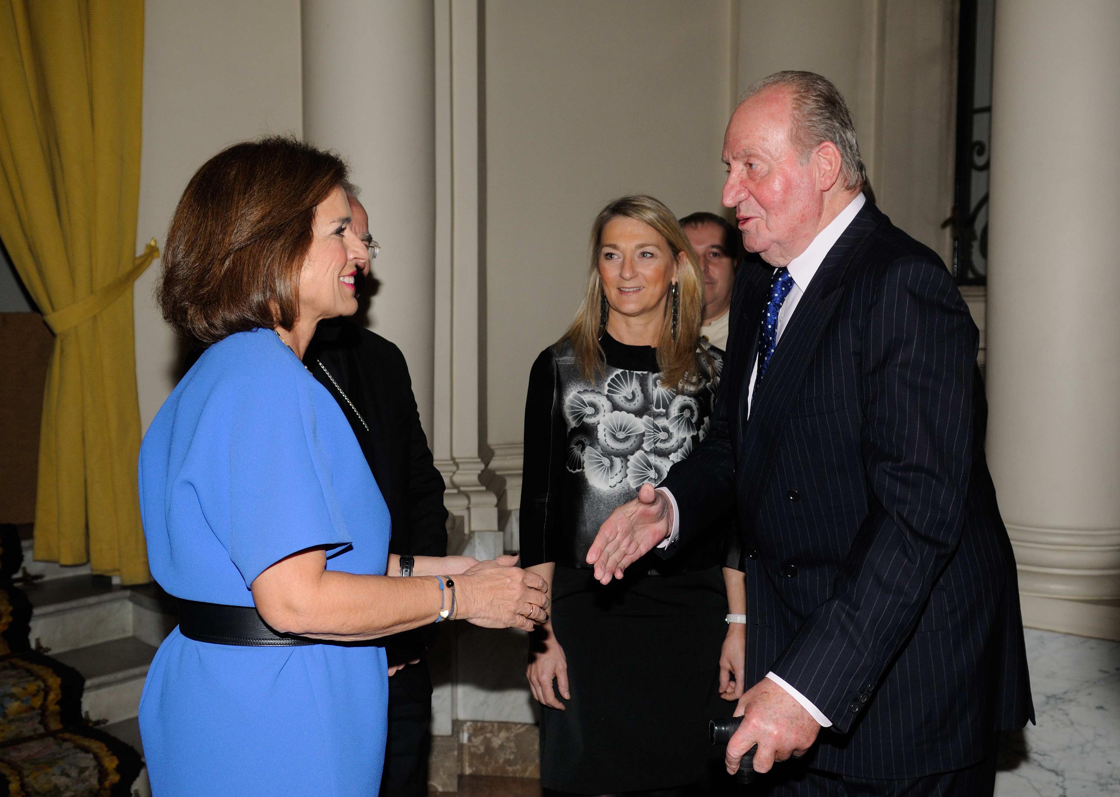 La alcaldesa de Madrid, Ana Botella, en distintos momentos del acto en el que el Rey don Juan Carlos ha recibido el premio Tiépolo, que conceden las Cámaras de Comercio e Industria de Italia en España y de Madrid