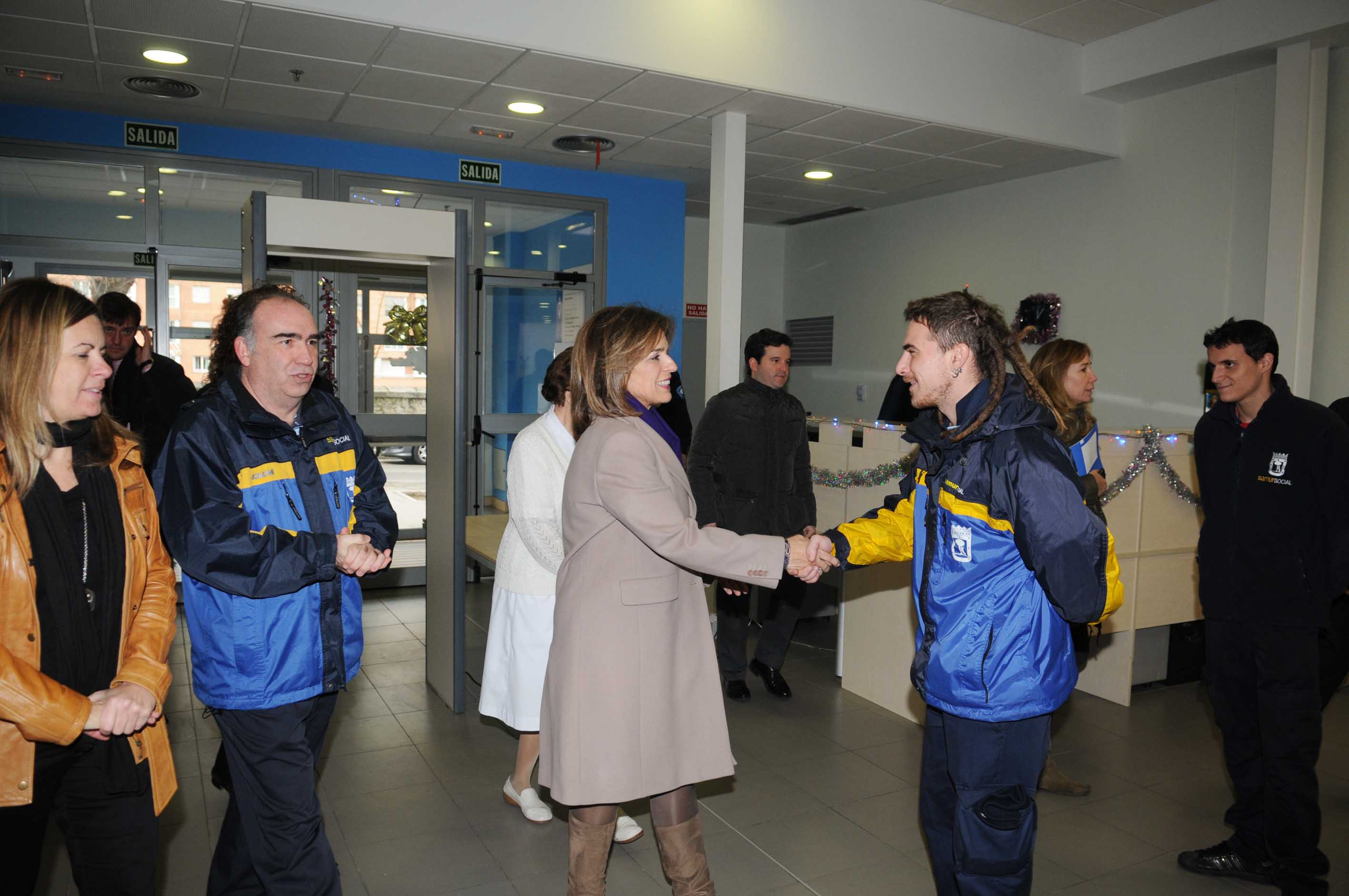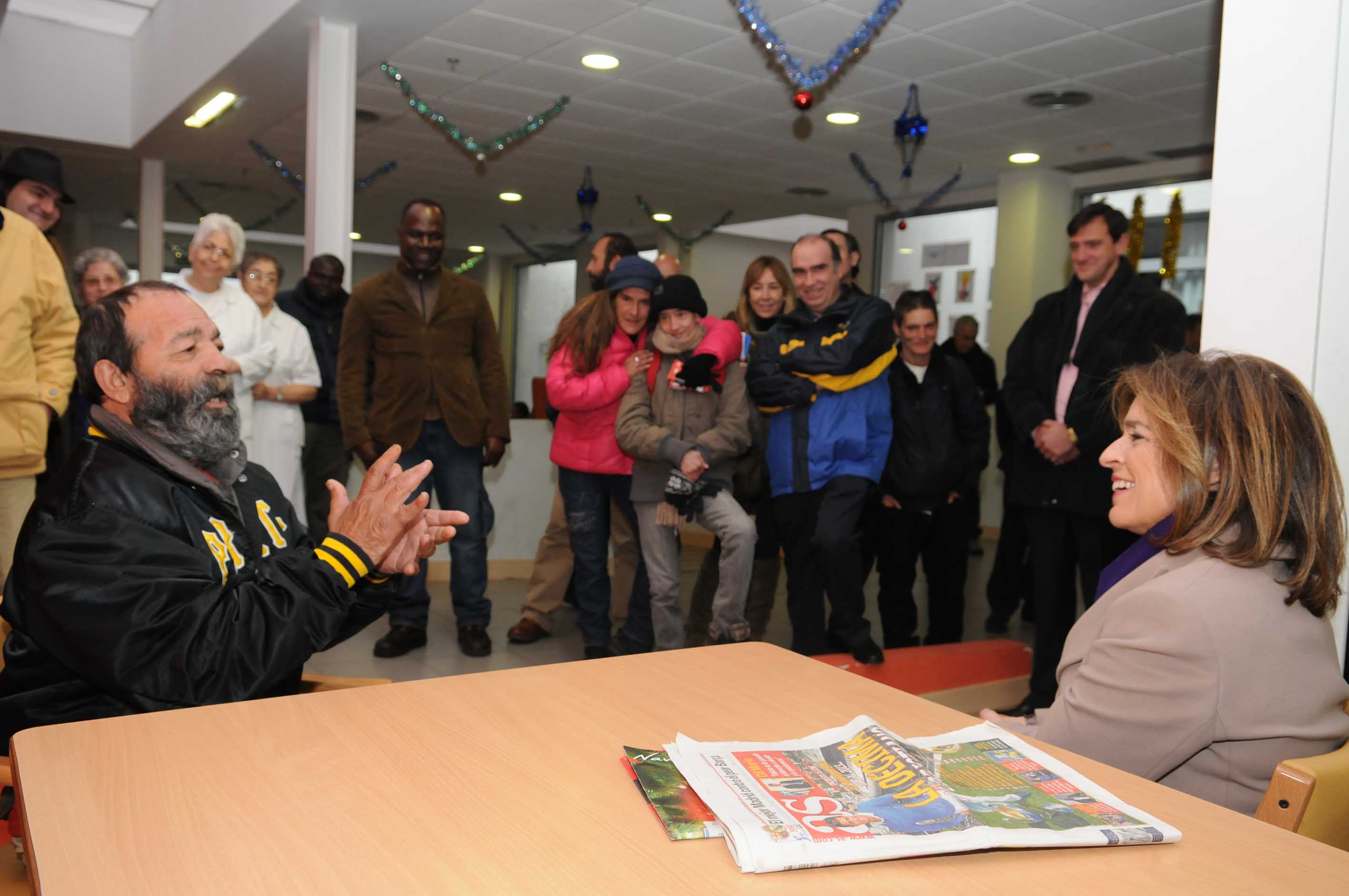La alcaldesa de Madrid, Ana Botella, visitó este mediodía el Albergue de San Isidro para, en un ambiente cordial y distendido, felicitar el Año Nuevo a los más desfavorecidos que, por diversas circunstancias, se ven obligados a hacer uso este servicio municipal. La alcaldesa se interesó por las personas que se acercaron a ella para compartir sus vivencias y explicarle -en algunos casos- que es lo qué les llevó a la situación de exclusión en la que se encuentran. Botella saludó a los trabajadores del centro, que dispone de 268 plazas; de las cuales, alrededor de 60, utilizan del dispositivo de día. Ana Botella visitó las cocinas del centro y se interesó por el menú de Nochevieja al que se espera acudirán entre 230 y 240 personas que disfrutarán de una cena cuidadosamente preparada por un cocinero y tres ayudantes. Podrán elegir entre langostinos con salsa rosa o lombarda con ciruelas y piñones; de segundo, medallón de salmón a la crema y como postre copa de chocolate acompañado de dulces navideños. Los comensales serán servidos por los propios trabajadores a los que se unirán las hermanas de la Caridad y algunos voluntarios. La alcaldesa recordó que una de las primeras visitas que realizó a primeros de año fue precisamente a este albergue en el que ha querido finalizar también 2012.