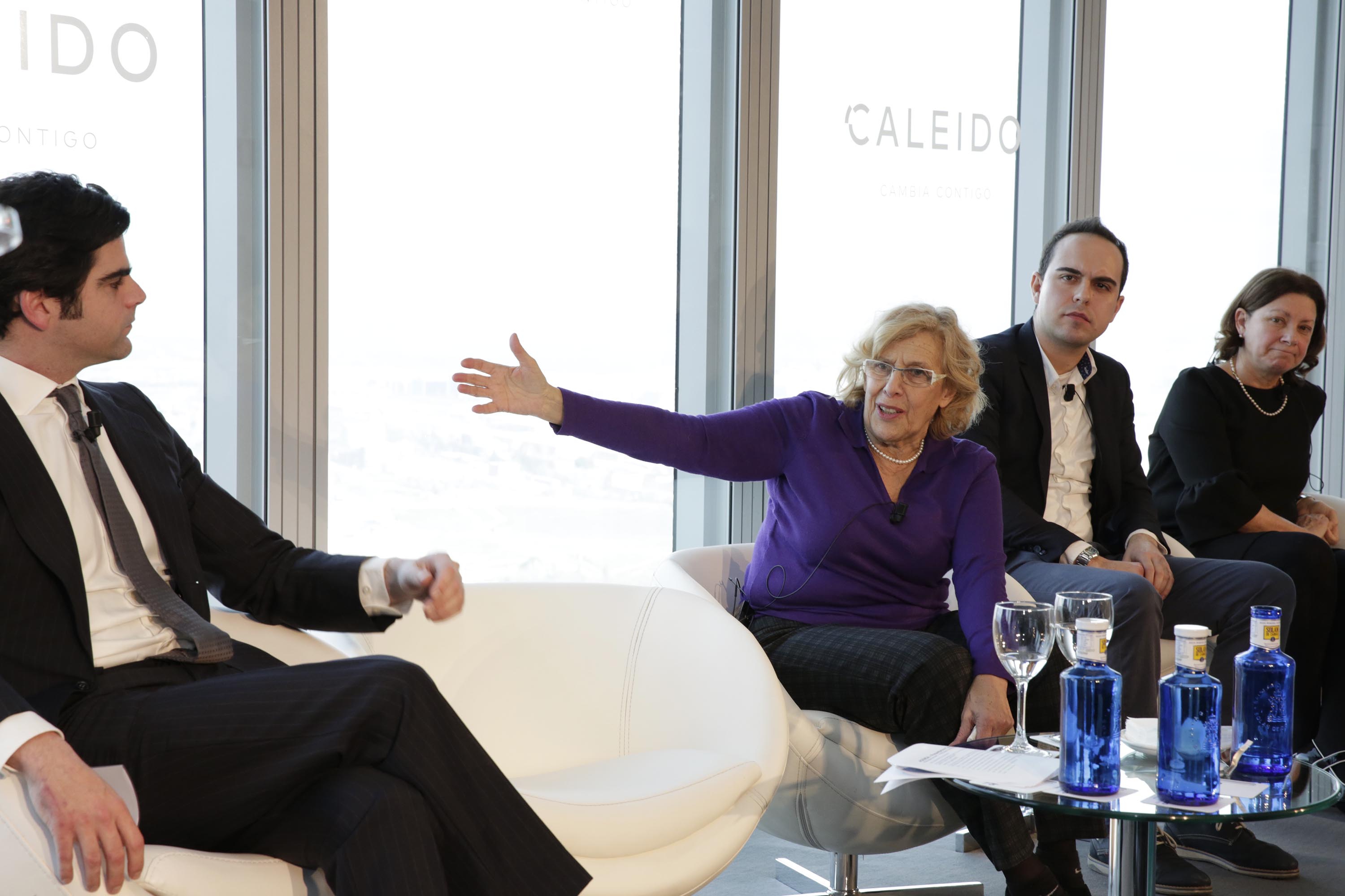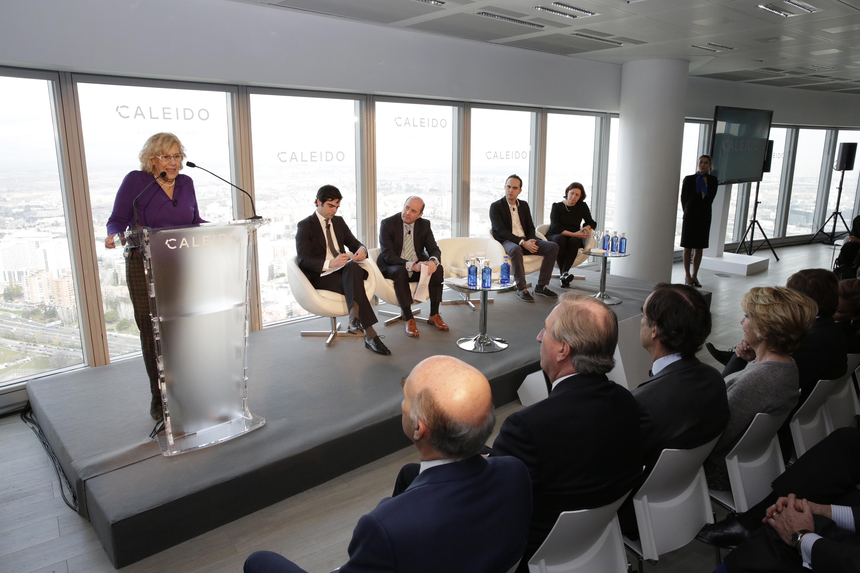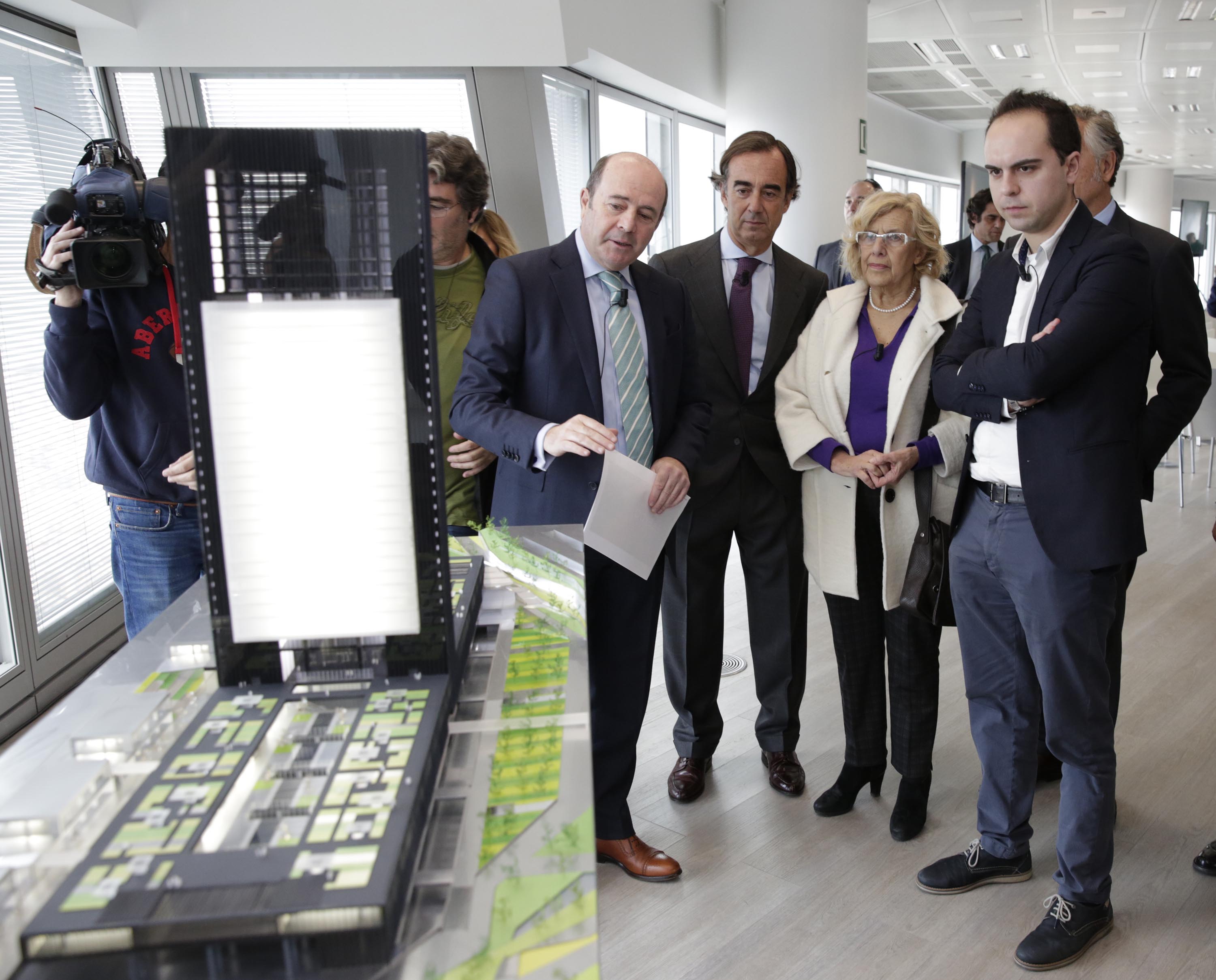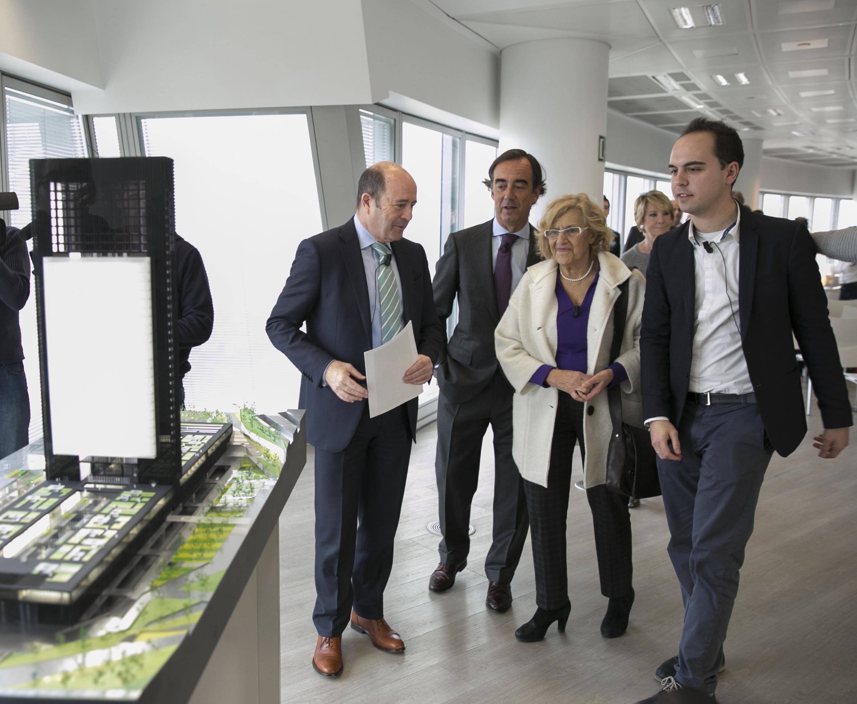 La alcaldesa de Madrid, Manuela Carmena, acompañada por el concejal del Área de Gobierno de Desarrollo Urbano Sostenible, José Manuel Calvo, ha asistido esta mañana a la presentación del nuevo complejo que se construirá junto a las Cuatro Torres, y que el presidente de Inmobiliaria Espacio, Juan Villar-Mir de Fuentes, ha realizado en la planta 42 de Torrespacio.
