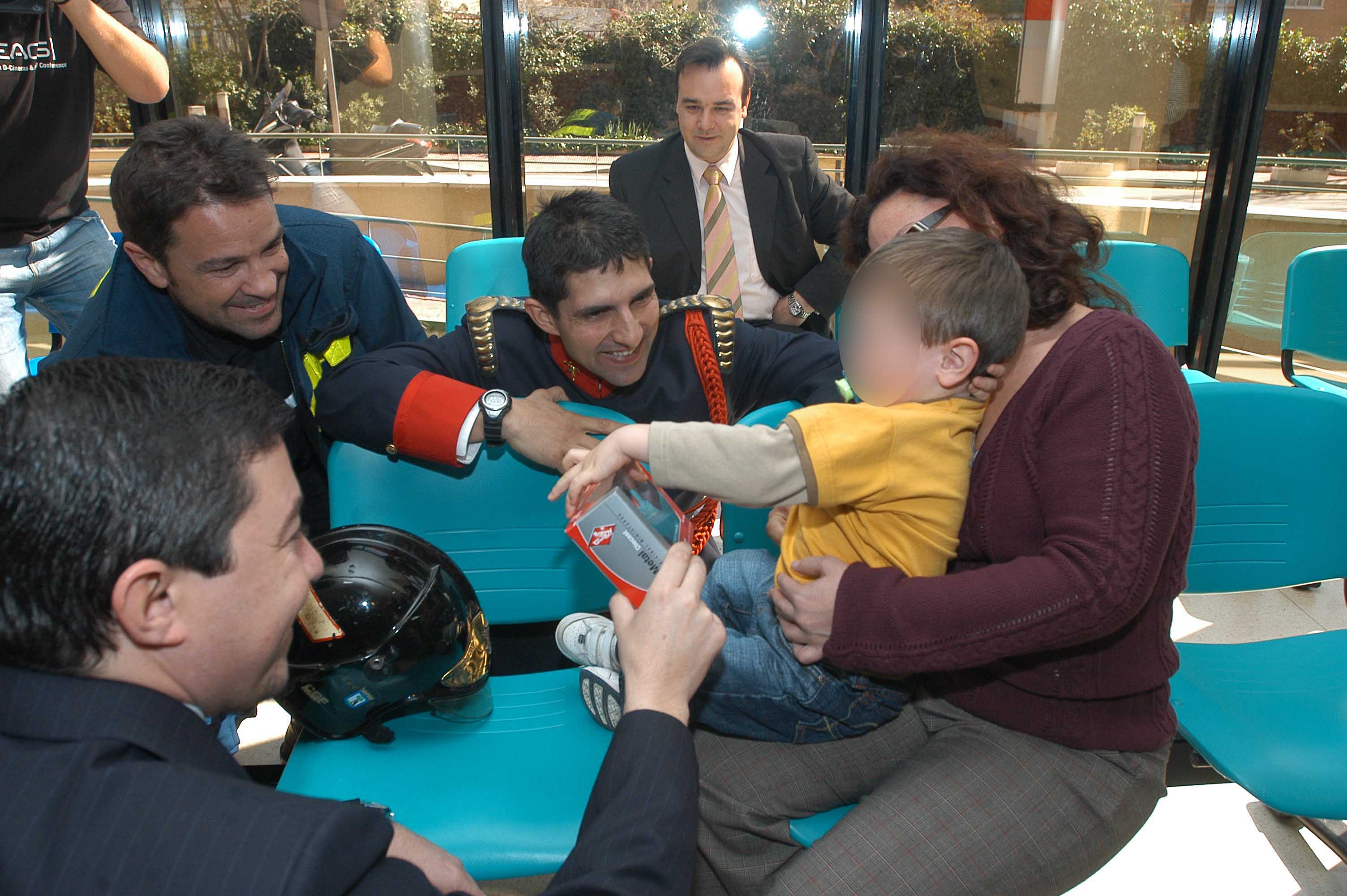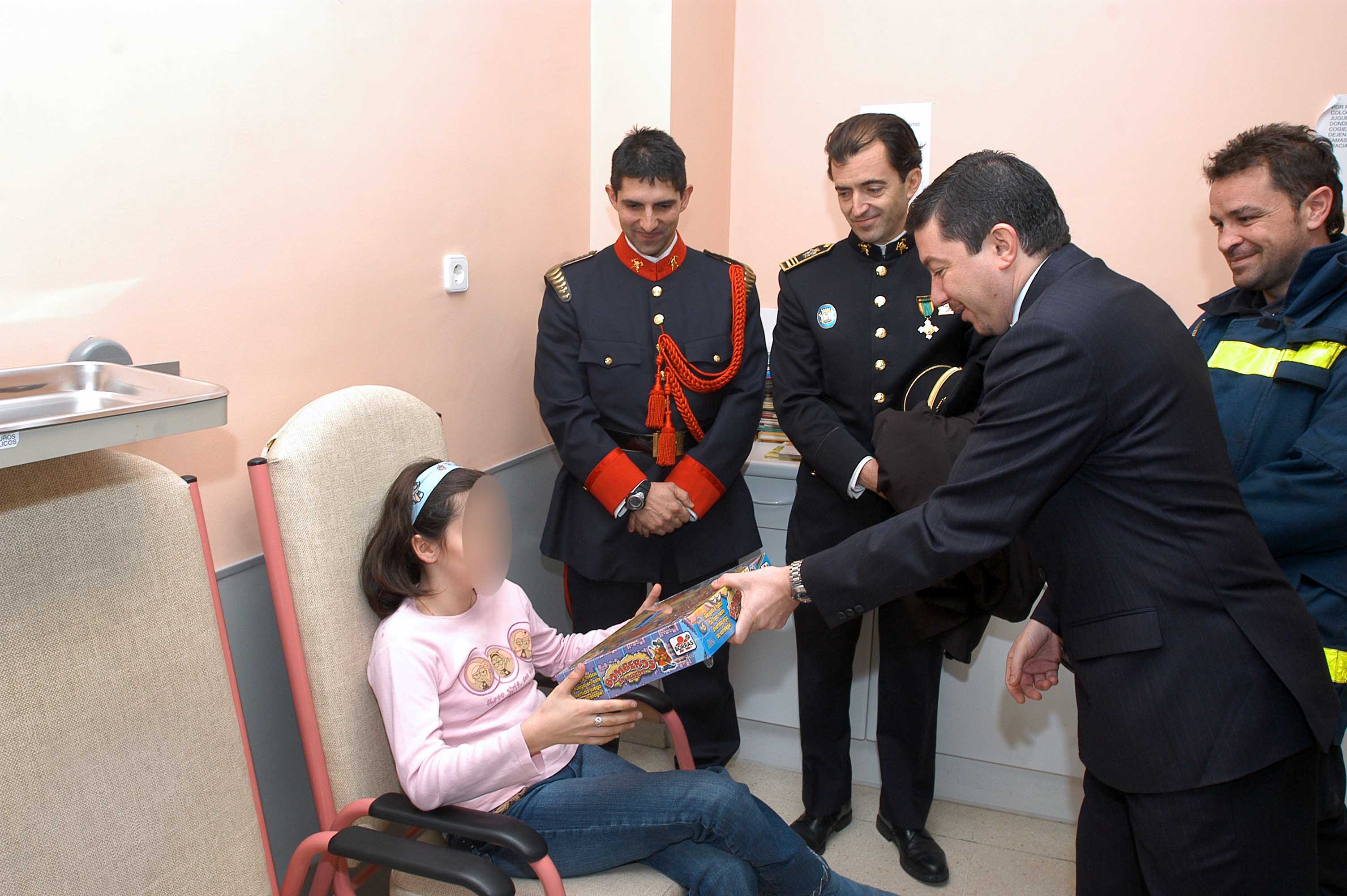 El concejal de Seguridad, Pedro Calvo, ha asistido esta mañana a la visita que los bomberos del Ayuntamiento, que hoy conmemoran la fiesta de su patrón, han hecho a los niños del Hospital de San Rafael. Los bomberos han entregado juguetes a los pequeños pacientes y han realizado una exhibición en el patio de entrada al recinto hospitalario.