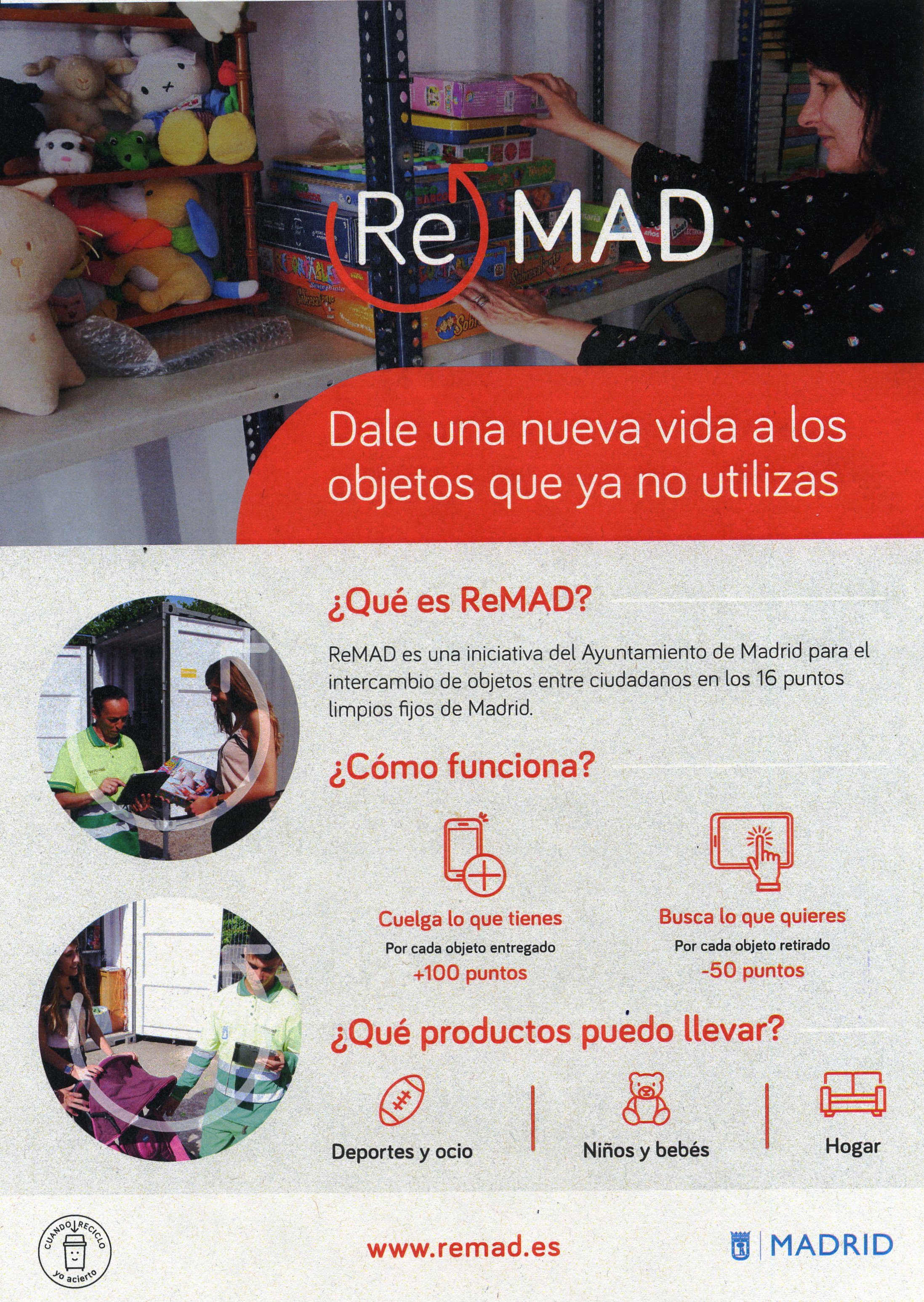 ReMAD es una herramienta para impulsar la economía circular que permite a la ciudadanía intercambiar objetos que ya no utiliza pero que otras personas pueden aprovechar. Por otra parte, esta plataforma permite a los usuarios reservar objetos a través de un catálogo y publicar sus productos para que sean vistos y solicitados por los interesados.