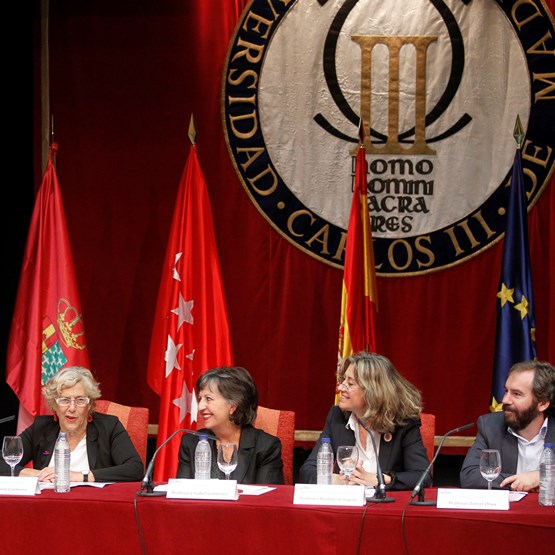 Carmena ha estado acompañada de la vicerrectora de estudios, Isabel Gutiérrez, de la directora del Instituto de Estudios Internacionales y Europeos “Francisco de Vitoria”, Montserrat Huguet, y del director y subdirector del máster, Carlos Fernández Liesa y Daniel Oliva, respectivamente.