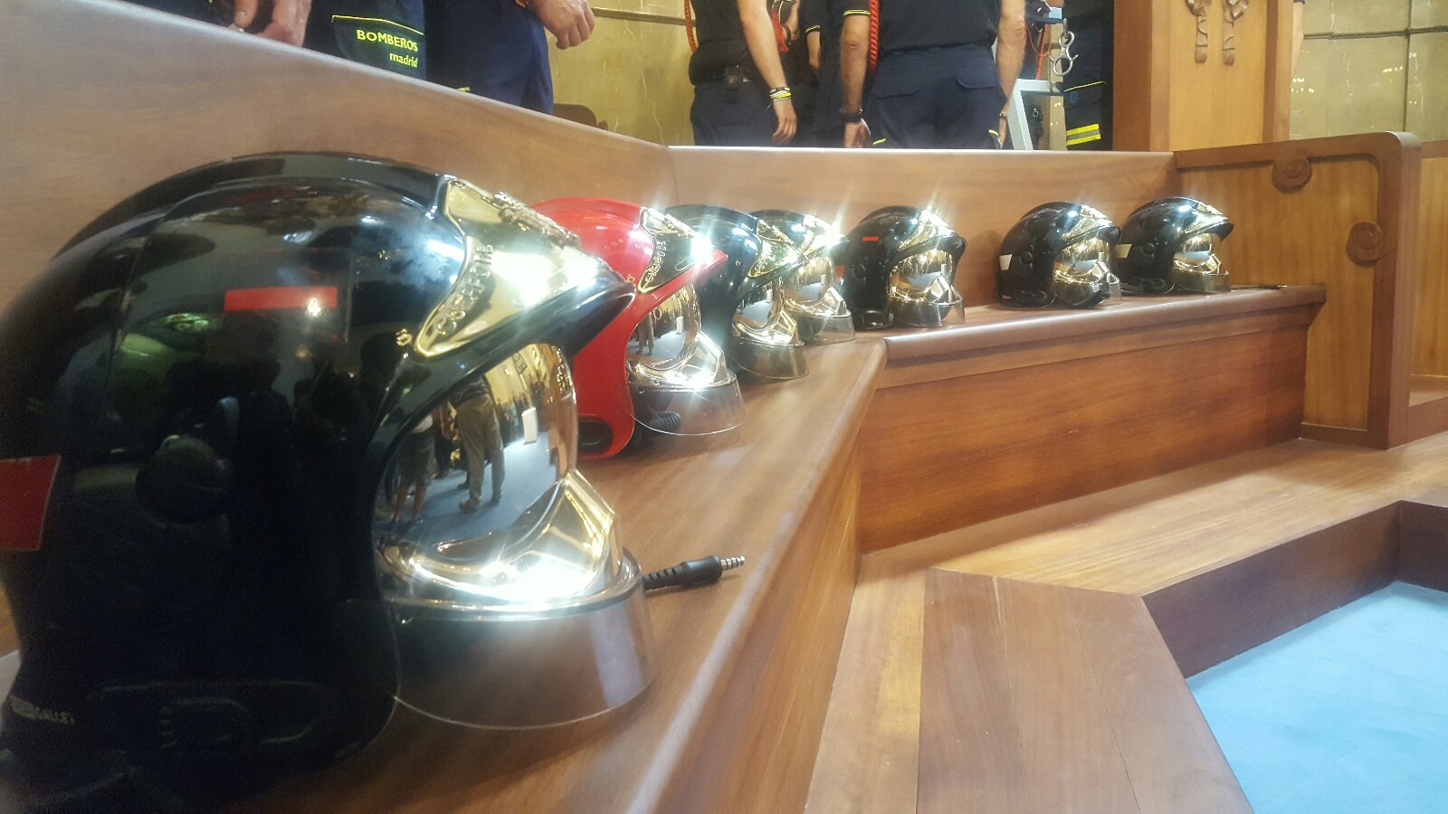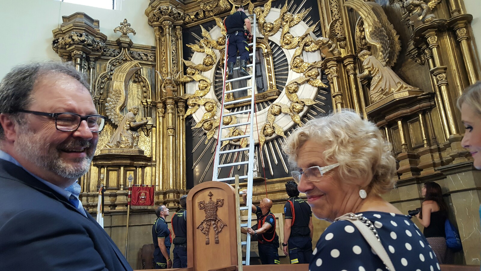 Carmena con los Bomberos de Madrid en la bajada del cuadro de La Paloma