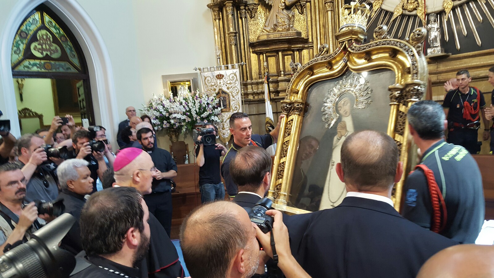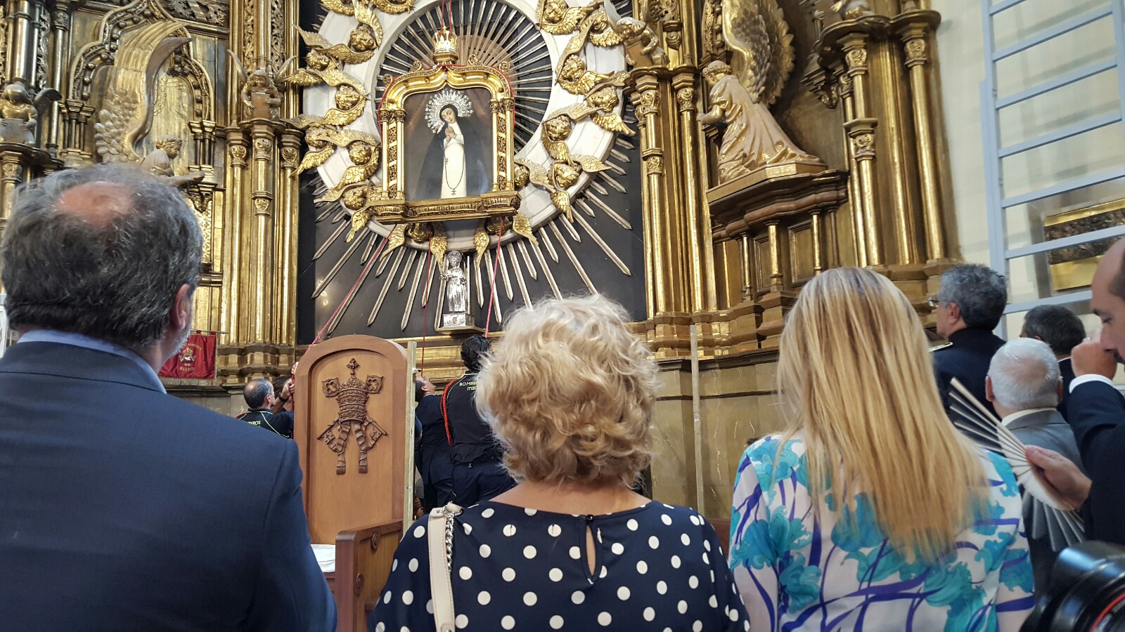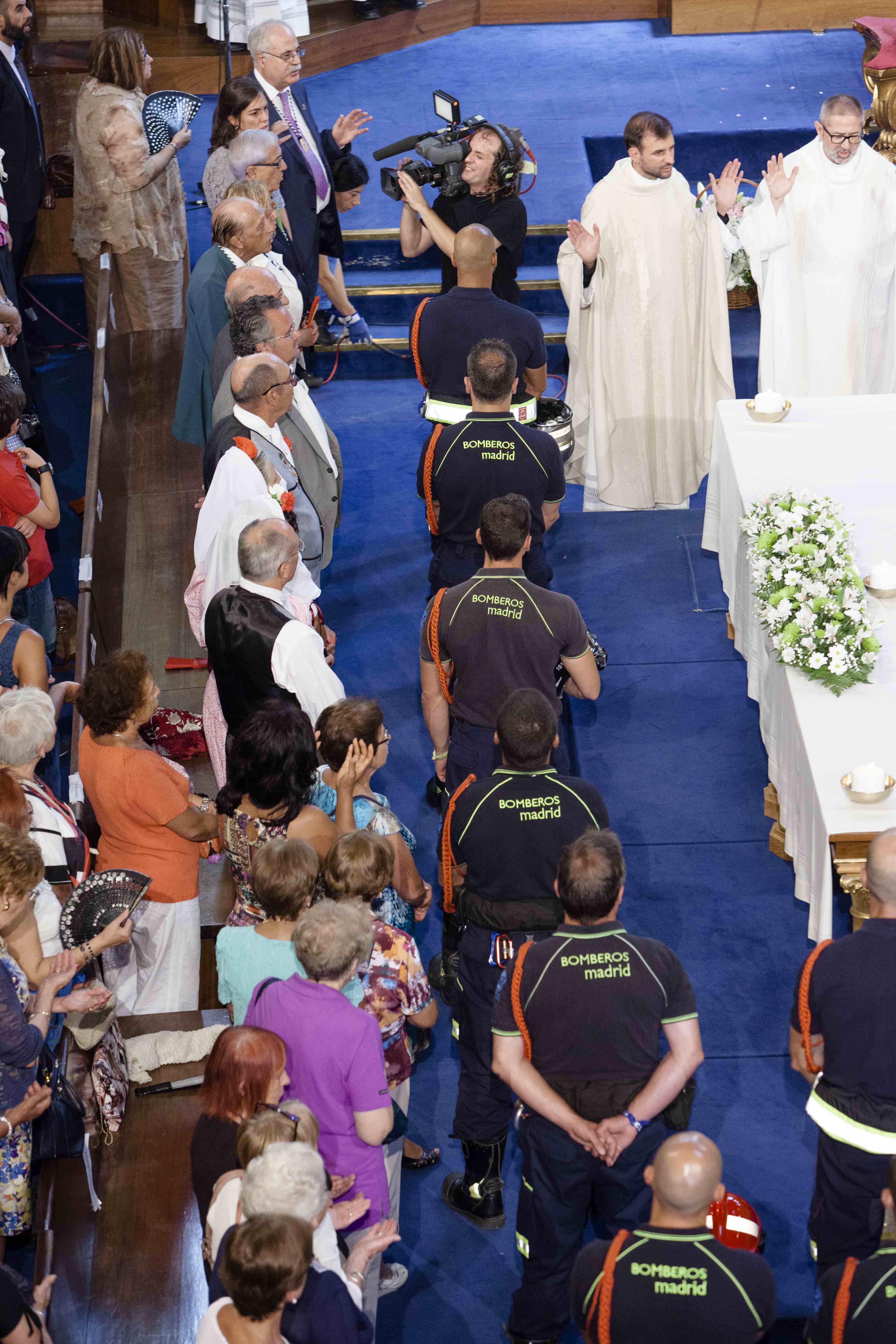 La alcaldesa de Madrid, Manuela Carmena, junto a Javier Barbero, concejal de Salud Seguridad y Emergencias, participando en los actos celebrados con motivo de la festividad de la Virgen de La Paloma en el distrito de Centro. Tras la ofrenda floral a la Virgen por las autoridades y miembros de la Corporación, ha tenido lugar la misa solemne oficiada por el Arzobispo de Madrid, don Carlos Osoro Sierra, junto al tradicional descenso del cuadro de la Virgen de la Paloma, realizado por miembros del piquete de gala del Cuerpo de Bomberos que pertenecen a la Hermandad de la Virgen de La Paloma.