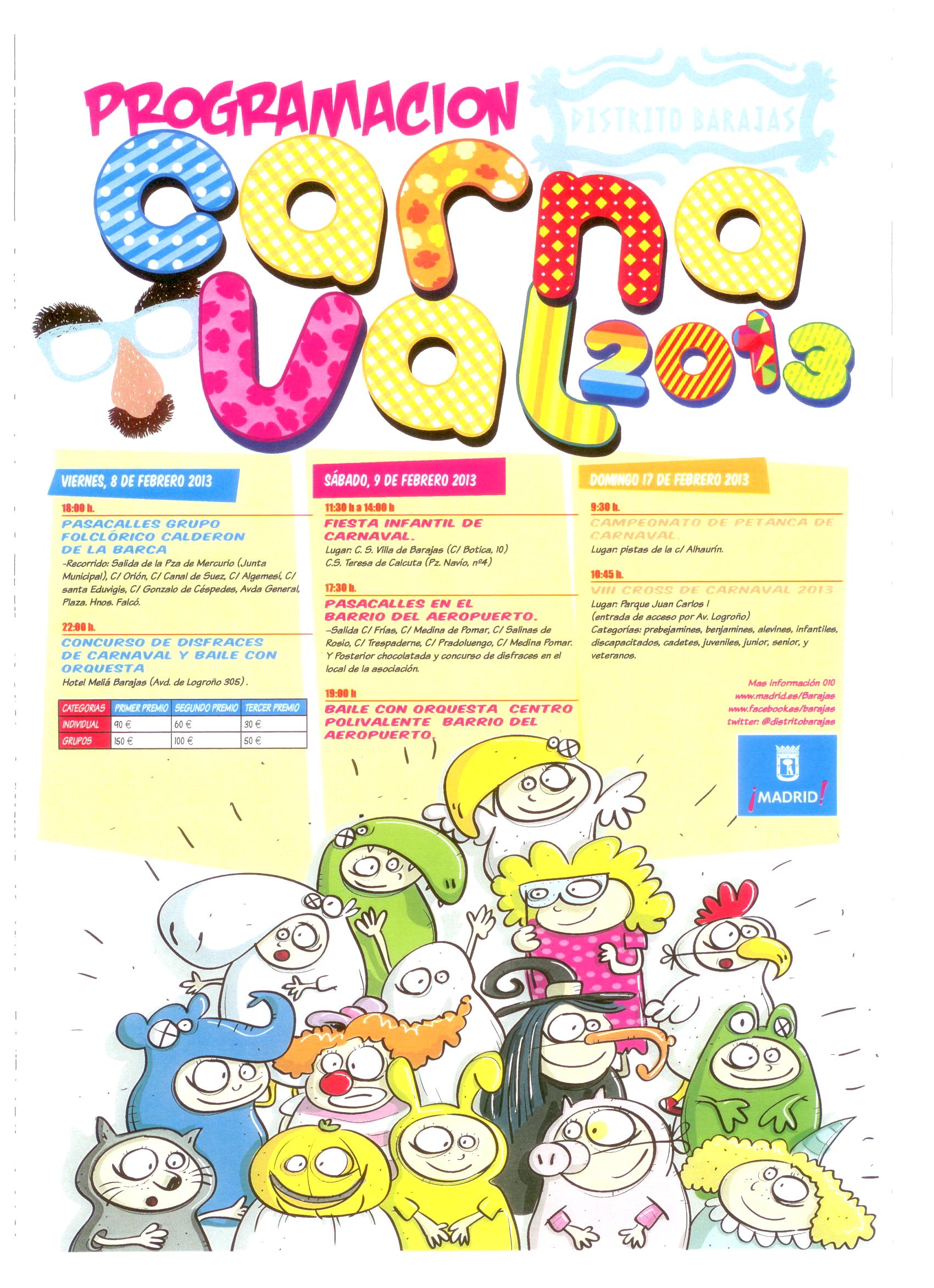 Como es tradicional, el distrito de Barajas ha organizado diversas actividades con motivo del Carnaval que se desarrollarán del 8 al 17 de febrero. Para ir abriendo boca, el viernes, día 8 de febrero, a las 10.30 horas, los alumnos de colegio público Calderón de la Barca realizarán un pasacalles por el Casco Histórico de Barajas hasta la plaza de Mercurio, donde serán recibidos en la sede de la Junta Municipal por la concejal Pepa Aguado, que les acompañará en el tradicional manteo del "pelele". También los alumnos del colegio Ciudad de Zaragoza realizarán, a las 15.00 horas, un pasacalles por las instalaciones del centro.